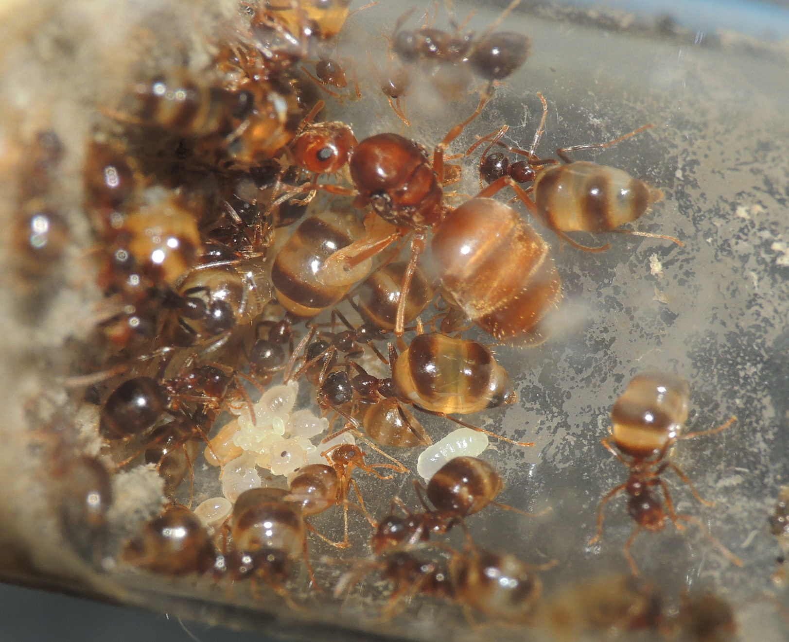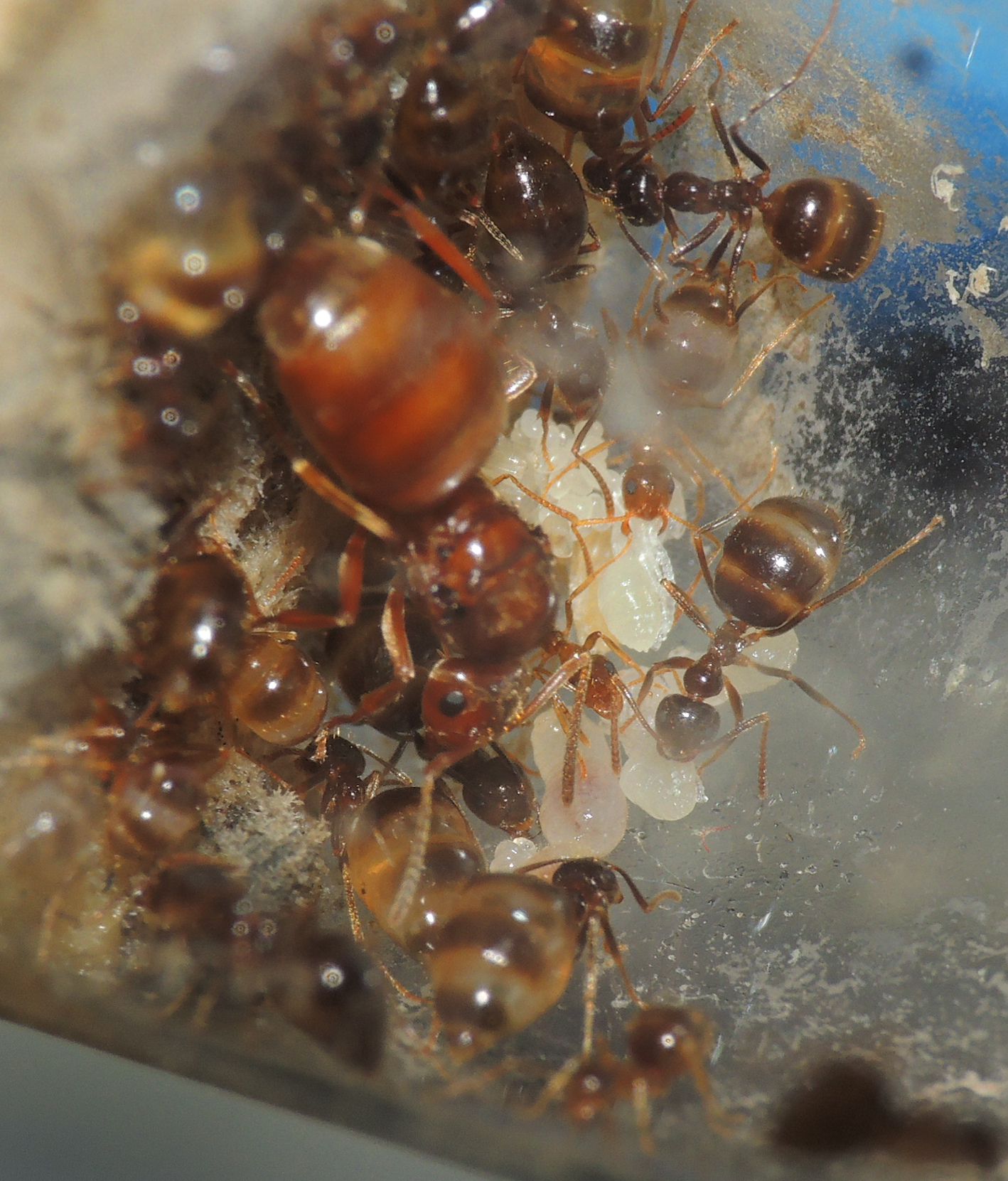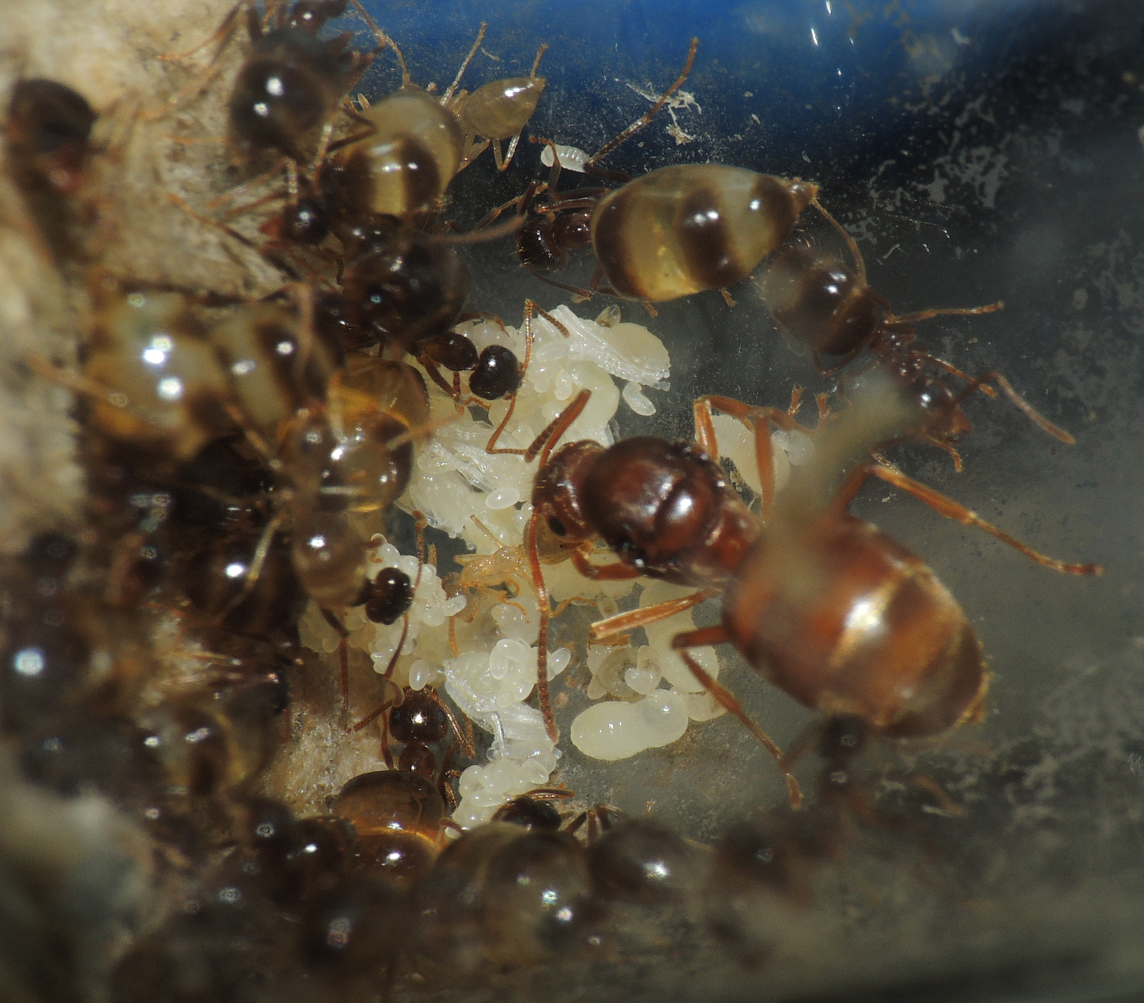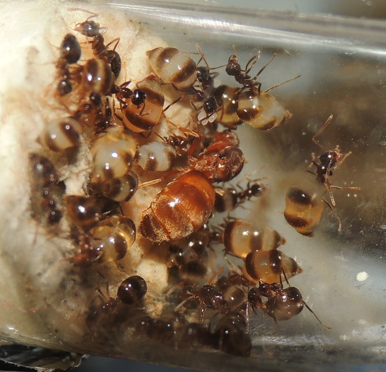 Nach einem problemreichen Jahr, mit mehreren Überschwemmungen im Reagenzglas und zahlreichen Verlusten, konnte ich den Großteil der Königinnen bislang durch mehrfaches Pushen mit Arbeiterinnen aus verschiedenen Naturnestern retten. Nahezu keine der Arbeiterinnen stammt von den Gynen ab.