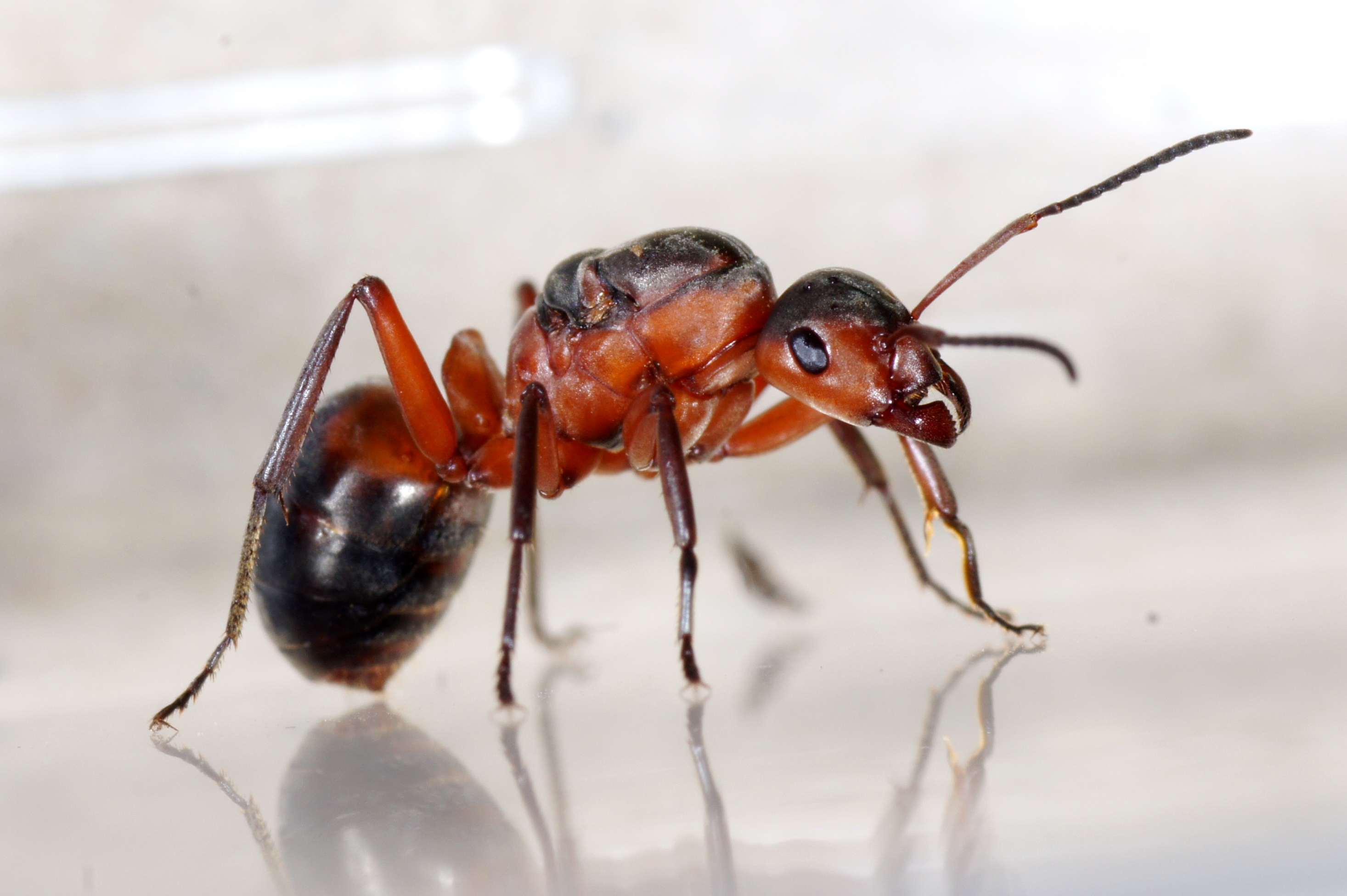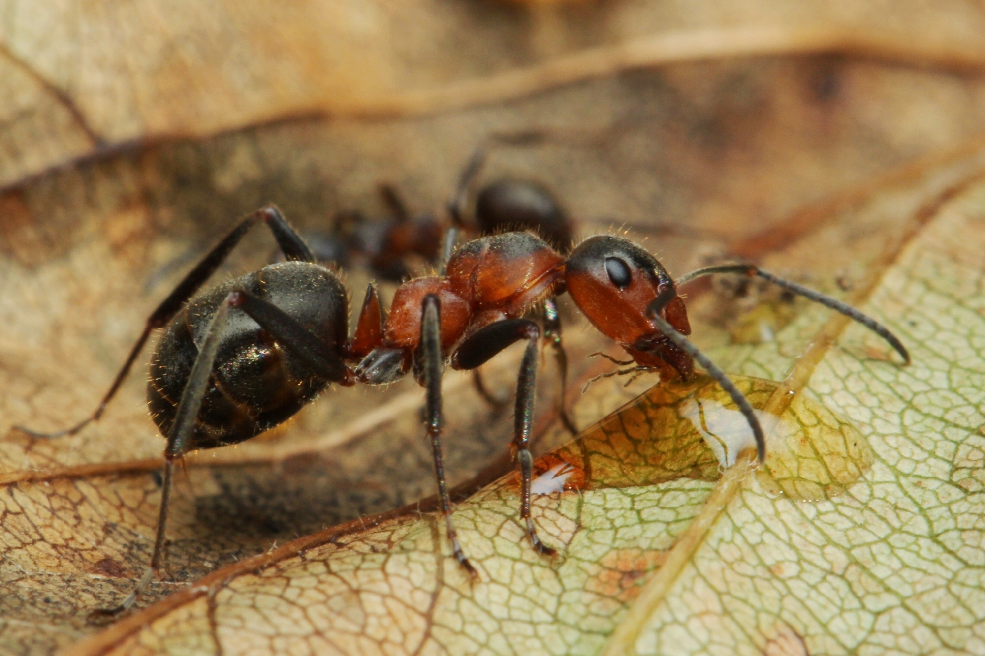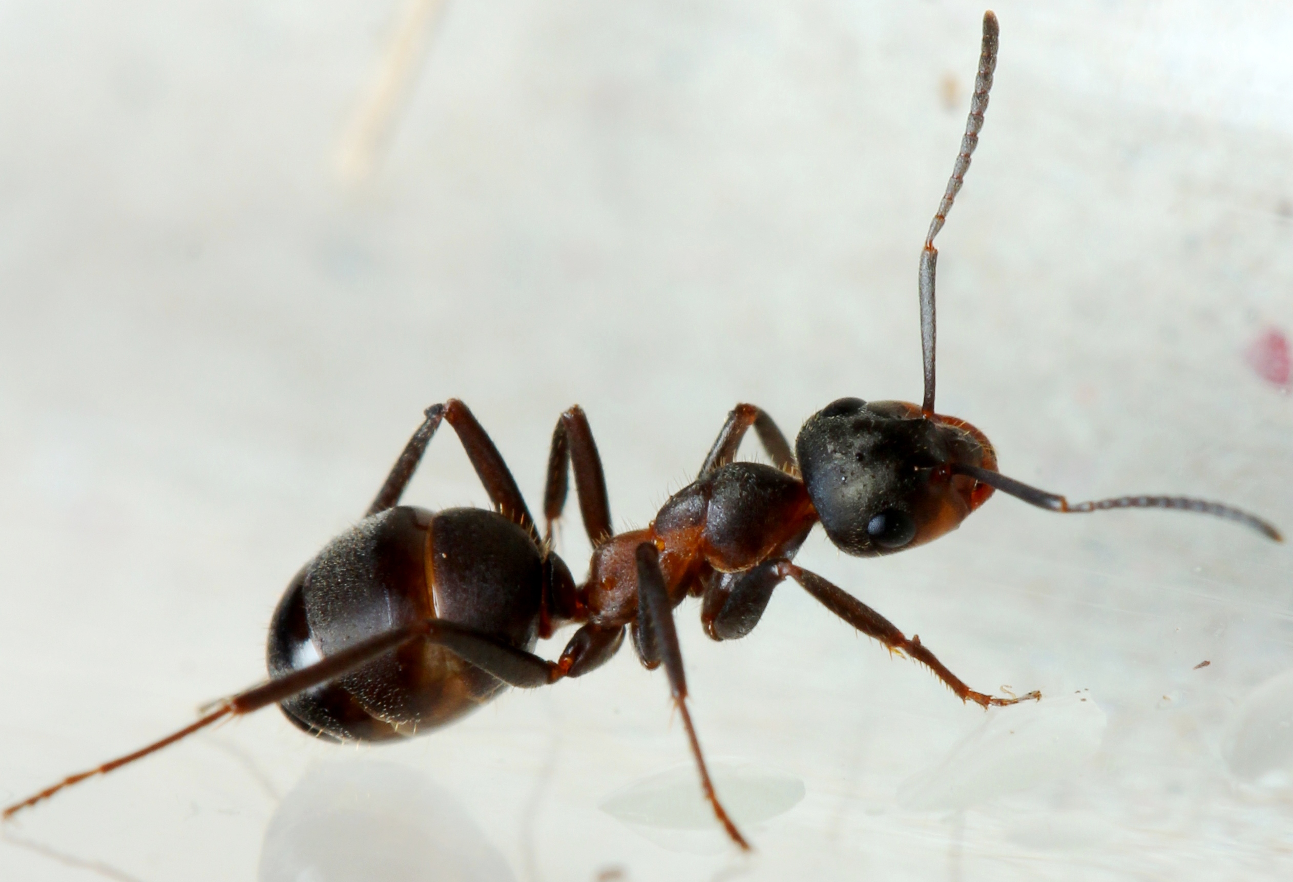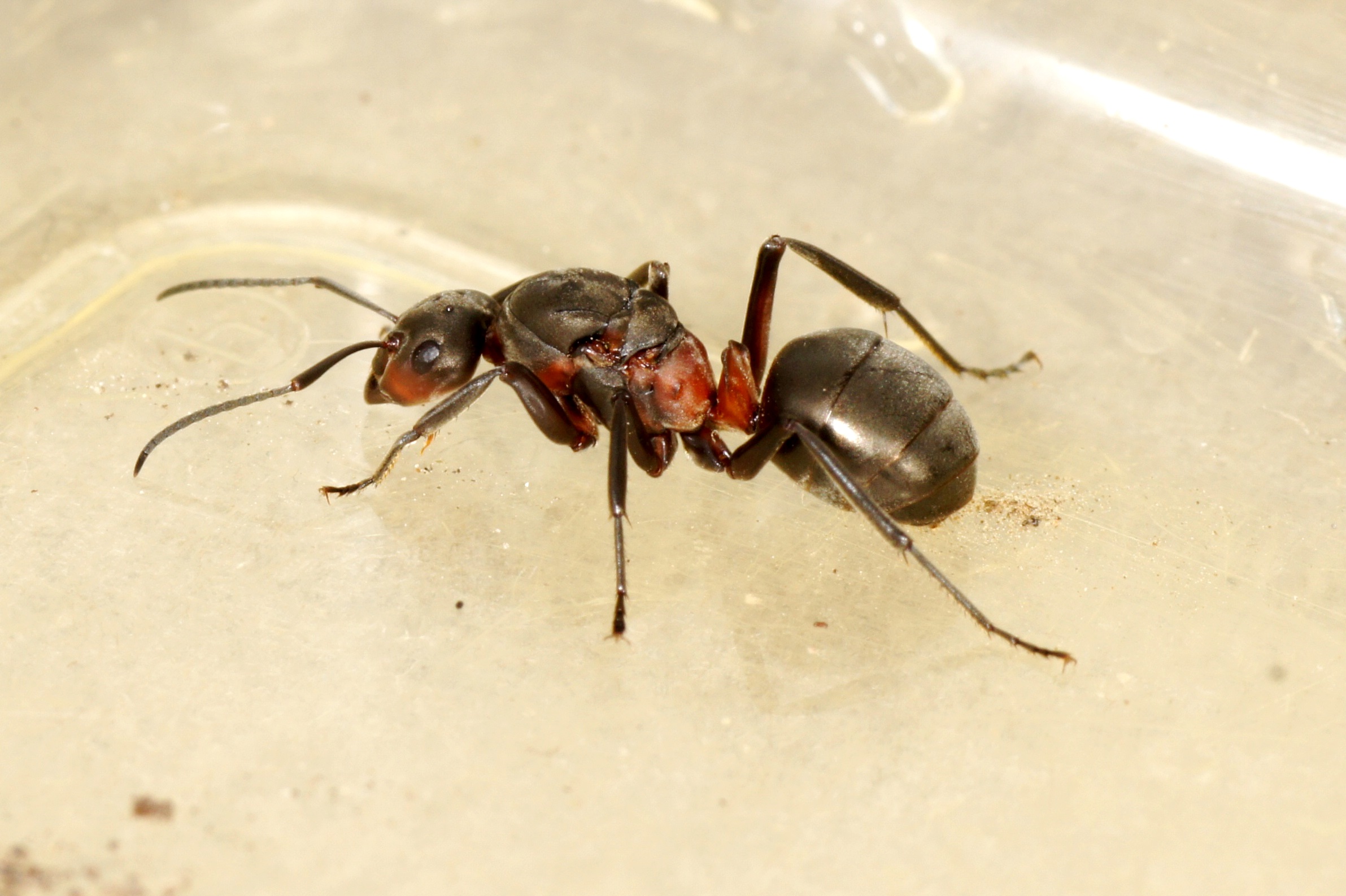 Eine Gyne mit hohem Rotanteil in der Färbung. Alle dunklen Körperpartien sind infolge dichter Pubeszenz und Mikroskulptur auf der Cuticula matt-dunkelgrau-schwärzlich gefärbt.