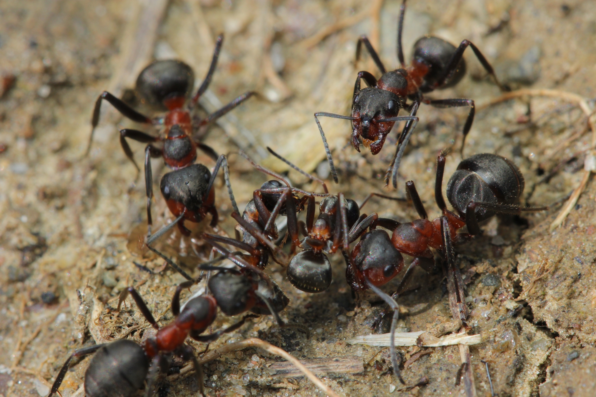 Hier hatten 2 Serviformica-Arbeiterinnen einen Konflikt, die größeren pratensis-Arbeiterinnen mischen sich sofort ein; Beute ist in Sicht.....