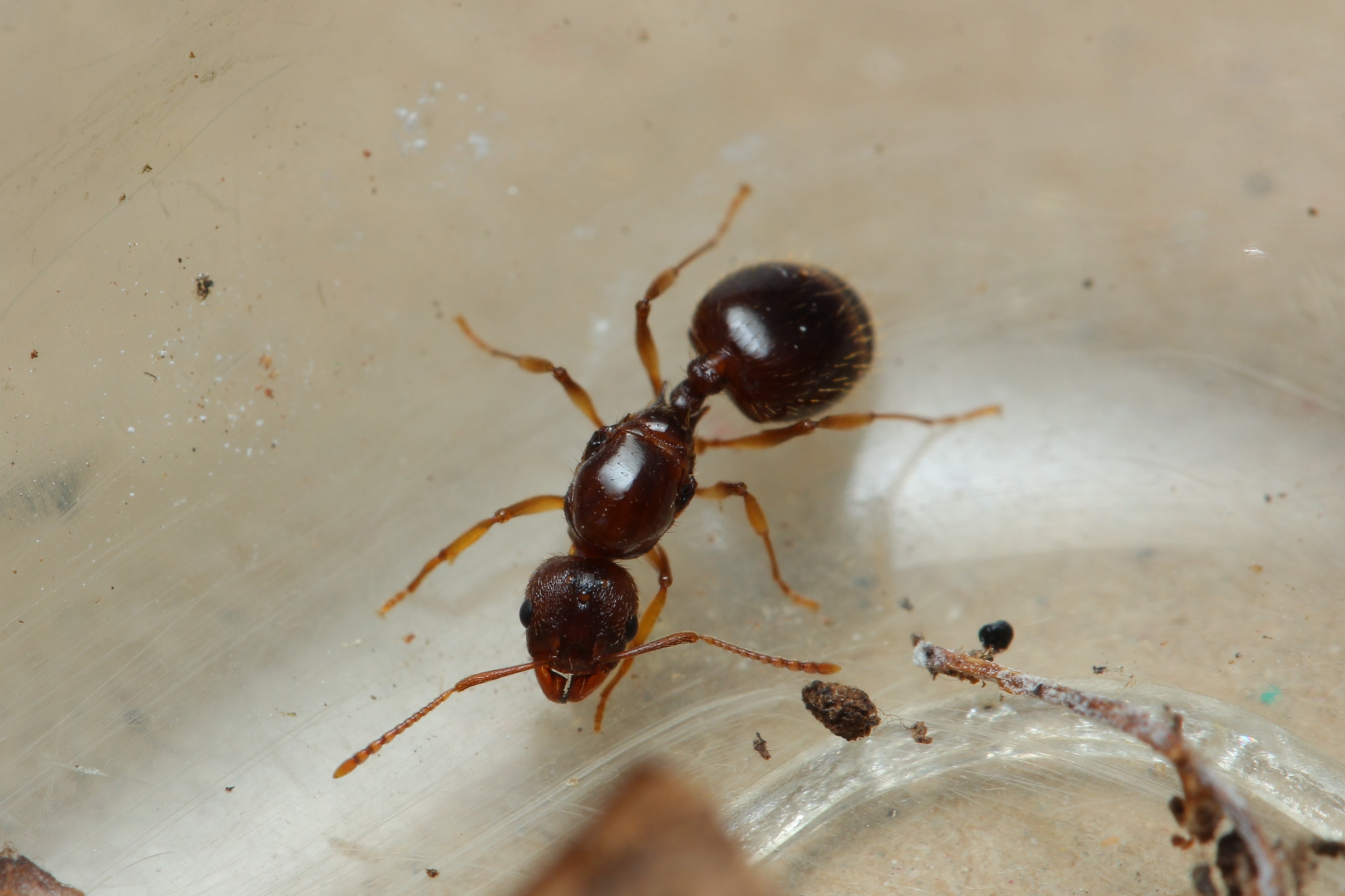 Aphenogaster subterranea ist eine seltene Art, die noch dazu vermutlich nachtaktiv ist. Vor Jahren hab ich einmal ein kleines Nest der Art gesehen, diesmal war es ein Riesennest unter einem Stein. Auf den ersten Blick dachte ich an "irgendeine" Myrmica sp., der zweite Blick brachte die Wahrheit ans Tageslicht: Äußerlich in der Größe u. Färbung wie eine Myrmica, aber der Petiolus ist auffällig lang gestielt und oberflächlich fehlt die auffallend starke "Runzelung" der Cuticula. Der Kopf ist fast glatt, vor allem Pronotum, aber auch Petiolus u. Postpetiolus erweisen sich dorsal als weitgehend glatt-glänzend. Die Gaster ist auch bei den Myrmica spp. glatt.