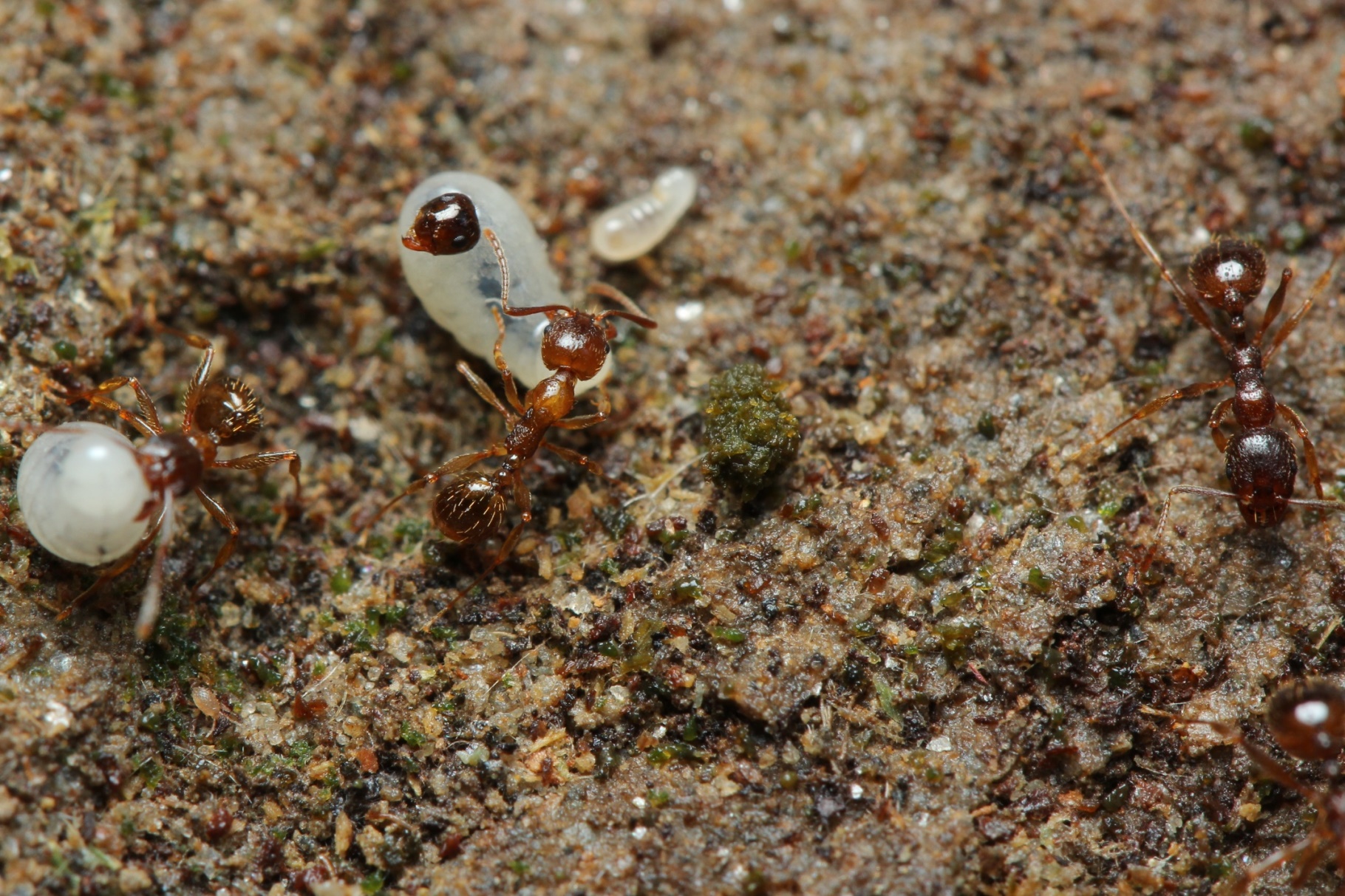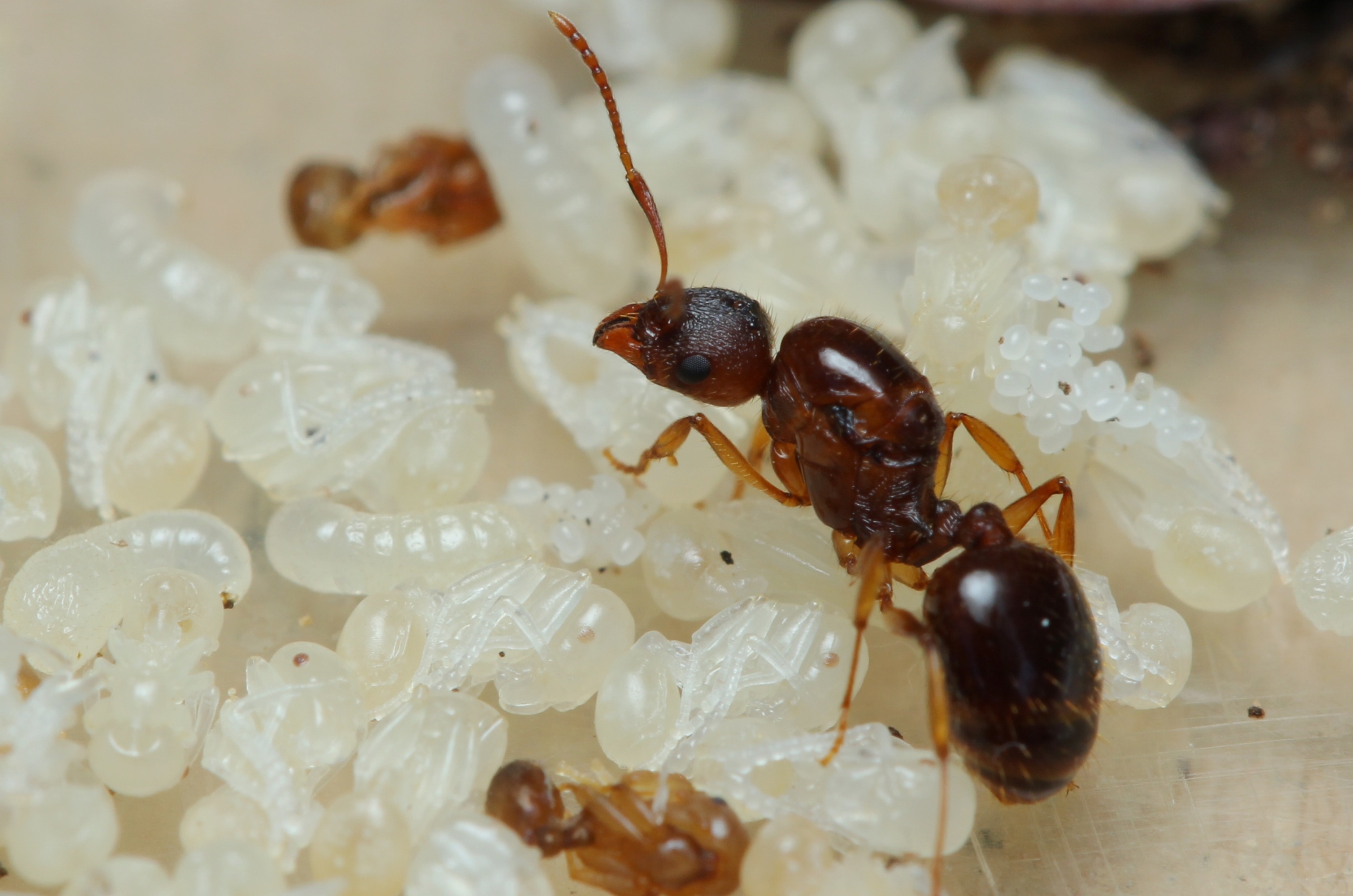 Aphaenogaster subterranea Hier sieht man die "normale" Fütterung der Larven; sie werden von Arbeiterinnen (mit dem "richtigen" Ende voran) an Beutestücke angesetzt, in die sie sich quasi hinein fressen. :D