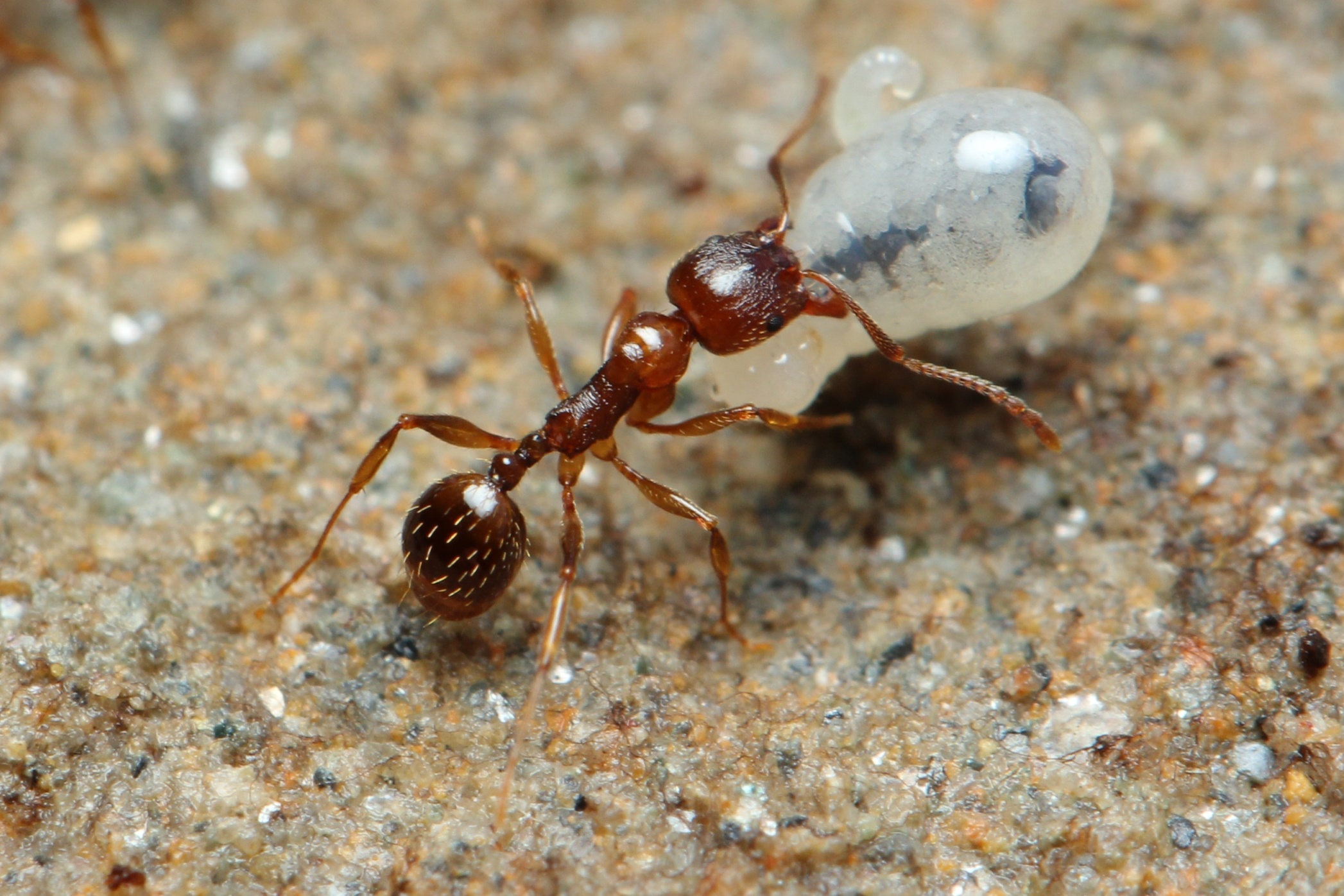 Das erste Bild zeigt den Kopf einer Ameise, der an der Larve am falschen Ende klebt (ich bin fast sicher, dass es sich um den einer Prenolepis nitens handelt), aber viell. ist das der Rest einer Mahlzeit, weil die Larven mit der Mundpartie an die Nahrung angelegt werden......