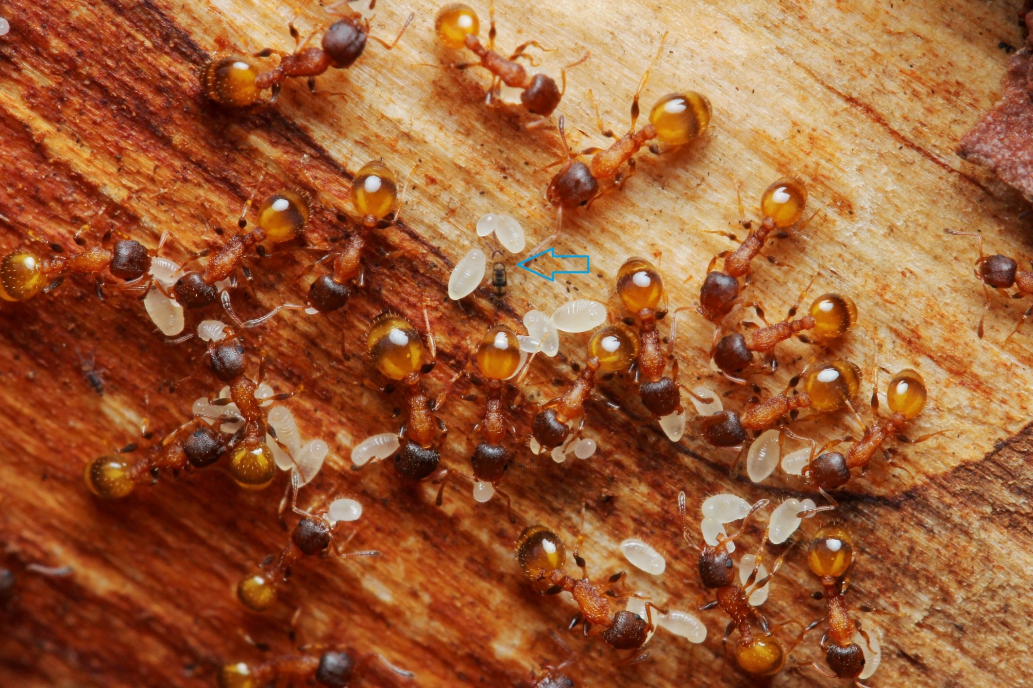 Arbeiterinnen mit Brut. Um was es sich bei dem winzigen Tierchen (Pfeil) handelt, ist mir aber nicht klar.