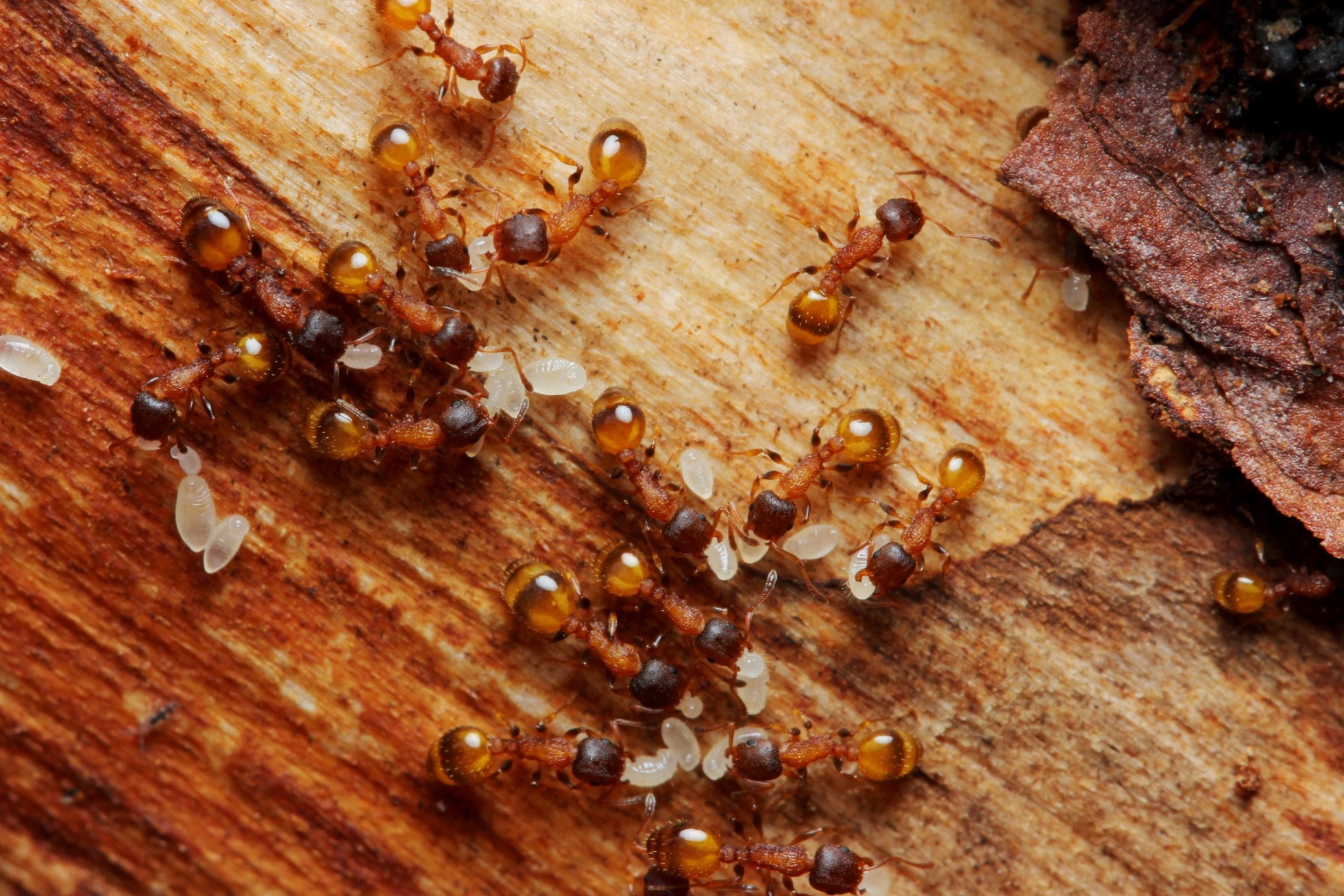 Temnothorax affinis ist eine relativ häufige Art, die auch gerne gehalten wird. Sie ist strikt arborikol, am Boden wird man also keine Nester finden. Diese kleinen Tierchen, die noch dazu eher volksarme Kolonien bilden, findet man nicht leicht. Sie nisten in abgestorbenen Ästchen od. unter Borke älterer Bäume. Die Fotos stammen von einem Nest, das ich unter der Borke einer Rotföhre (im Schneeheide-Rotföhrenwald) finden konnte und zwar nur etwa 0,5 m über dem Boden. Die Fotos stammen wieder von Sohn Roman.