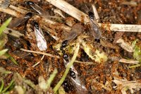 Anlässlich der letzten Nestuntersuchung vor etwa einer Woche legte ich diese winzigen Ameisen frei und nach kurzer Zeit hatten sich ein paar Dutzend Ameisen einer anderen Art eingefunden um Solenopsis zu bekämpfen. Welche Art das war - ich glaube, ich muss es gar nicht erst erwähnen........Lasius niger natürlich, wer sonst? Ich konnte bisher keine andere Art entdecken, die es gewagt hätte gegen Solenopsis vorzugehen, noch dazu, wo das Nest der aggressiven Lasius von dem Vorfall keineswegs betroffen war.