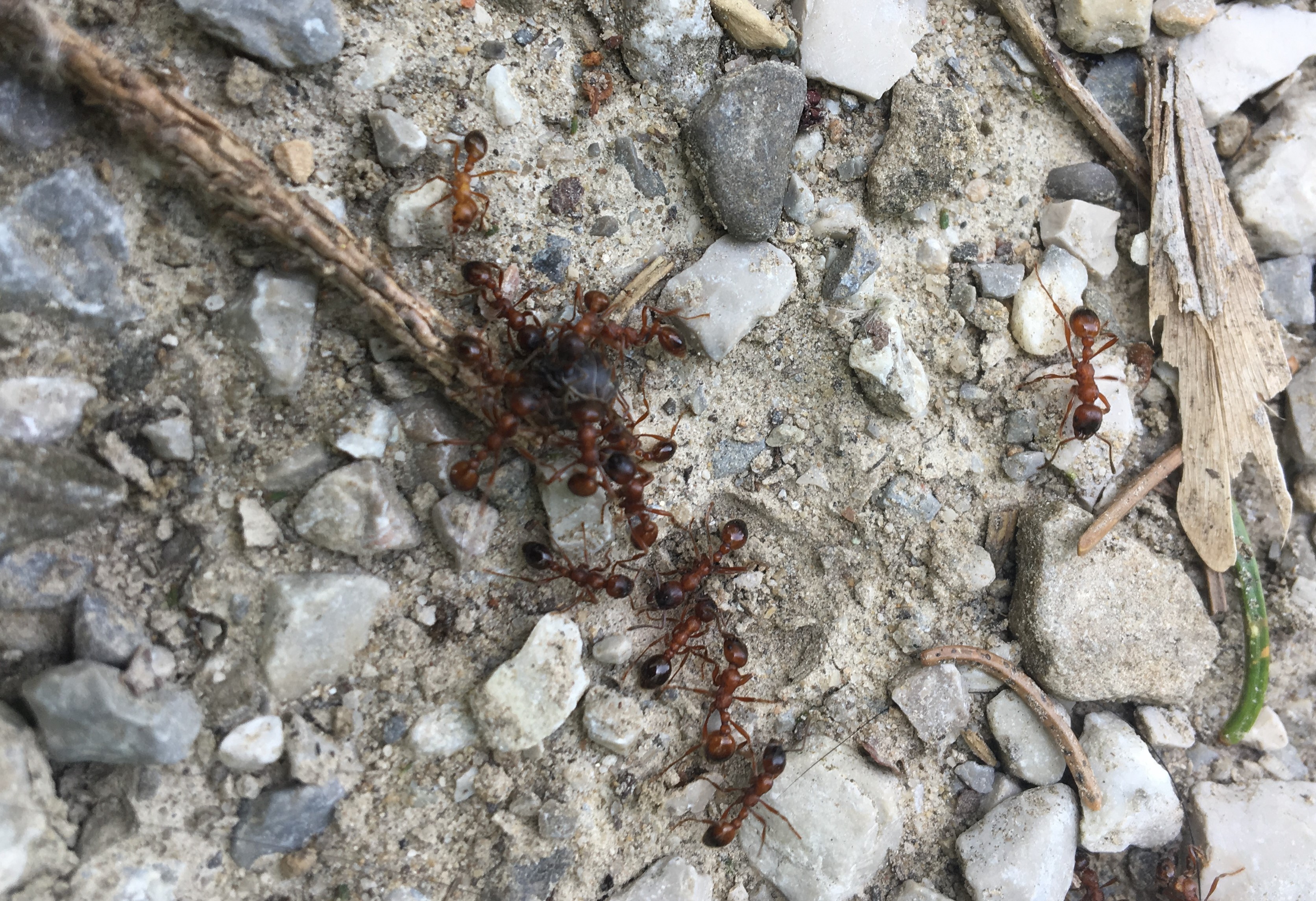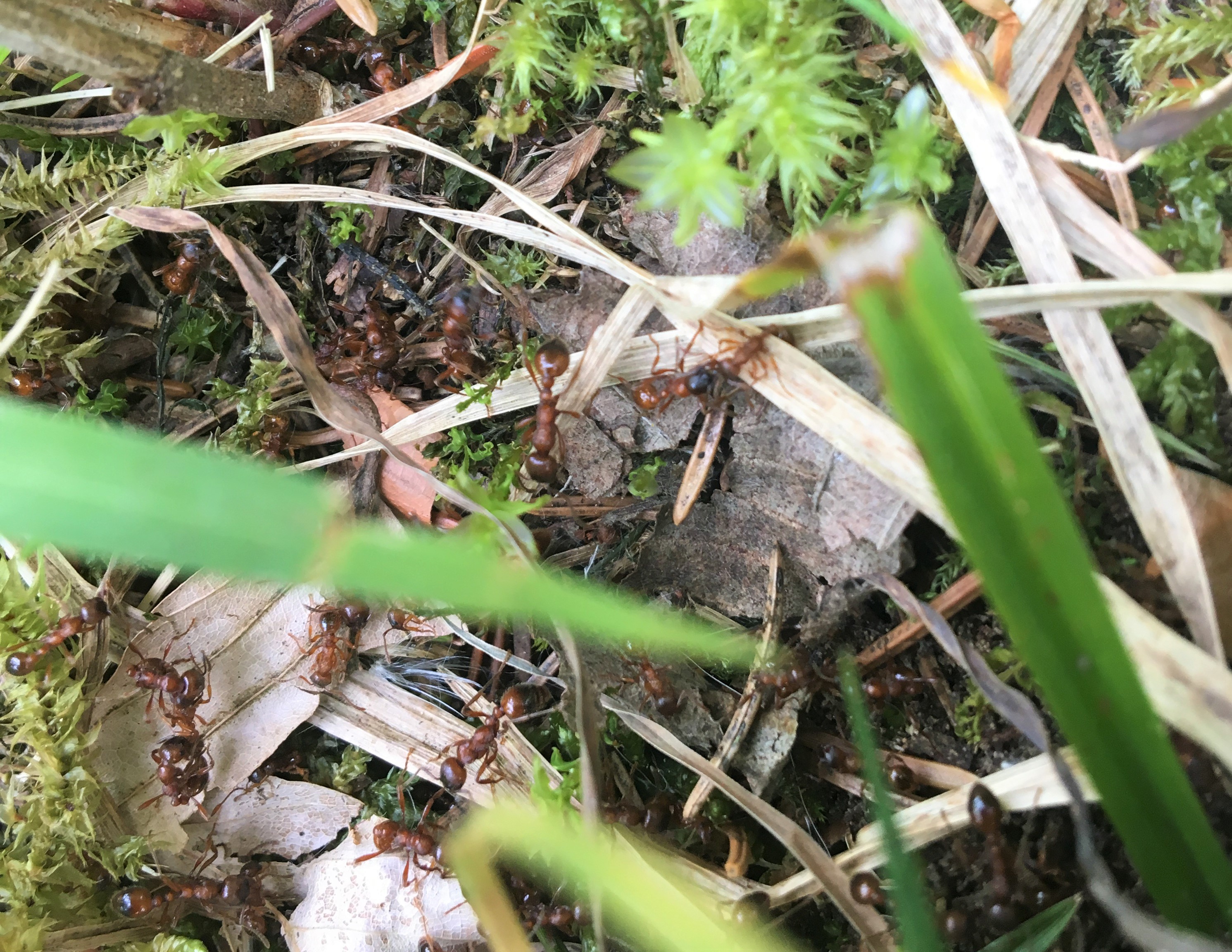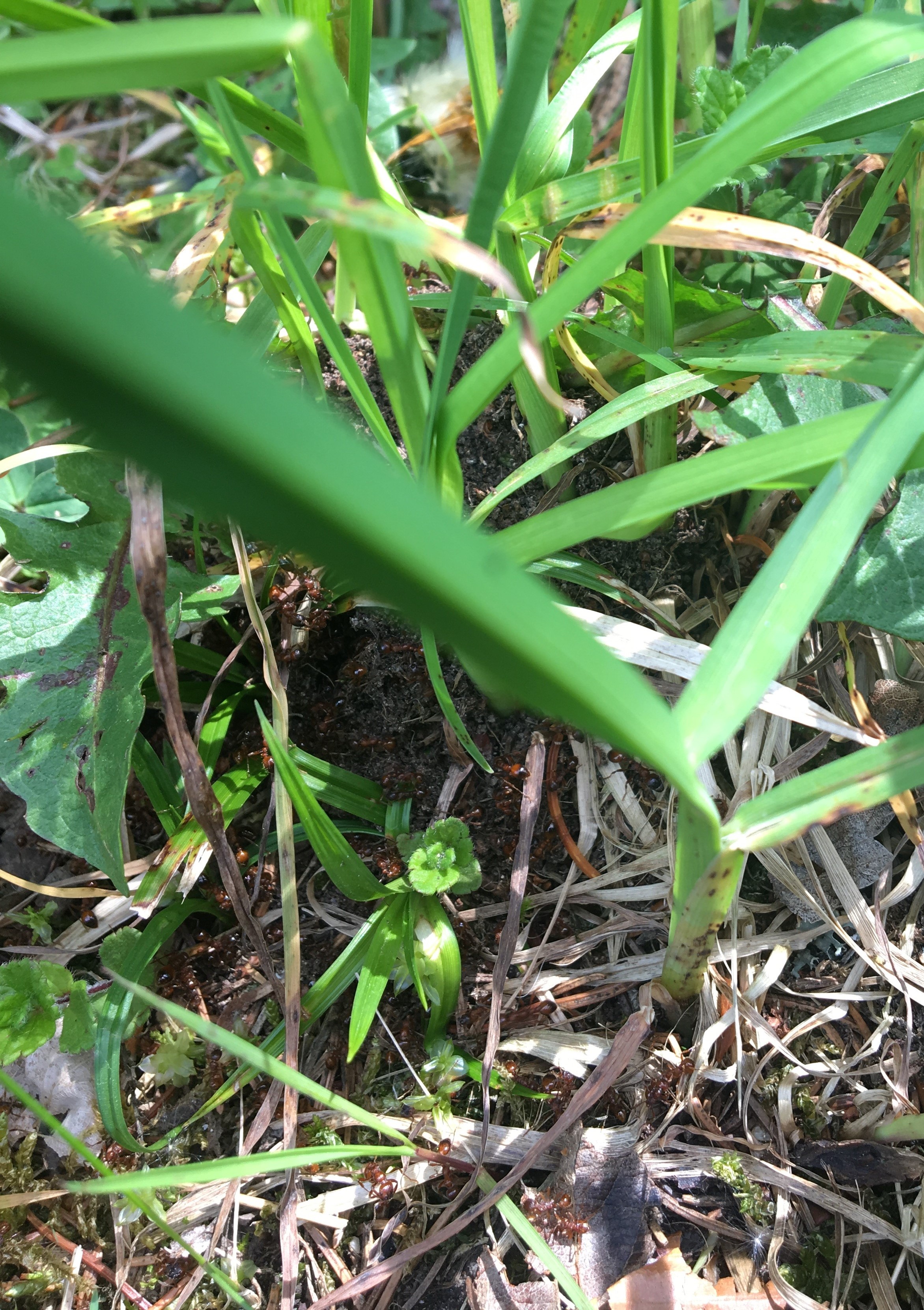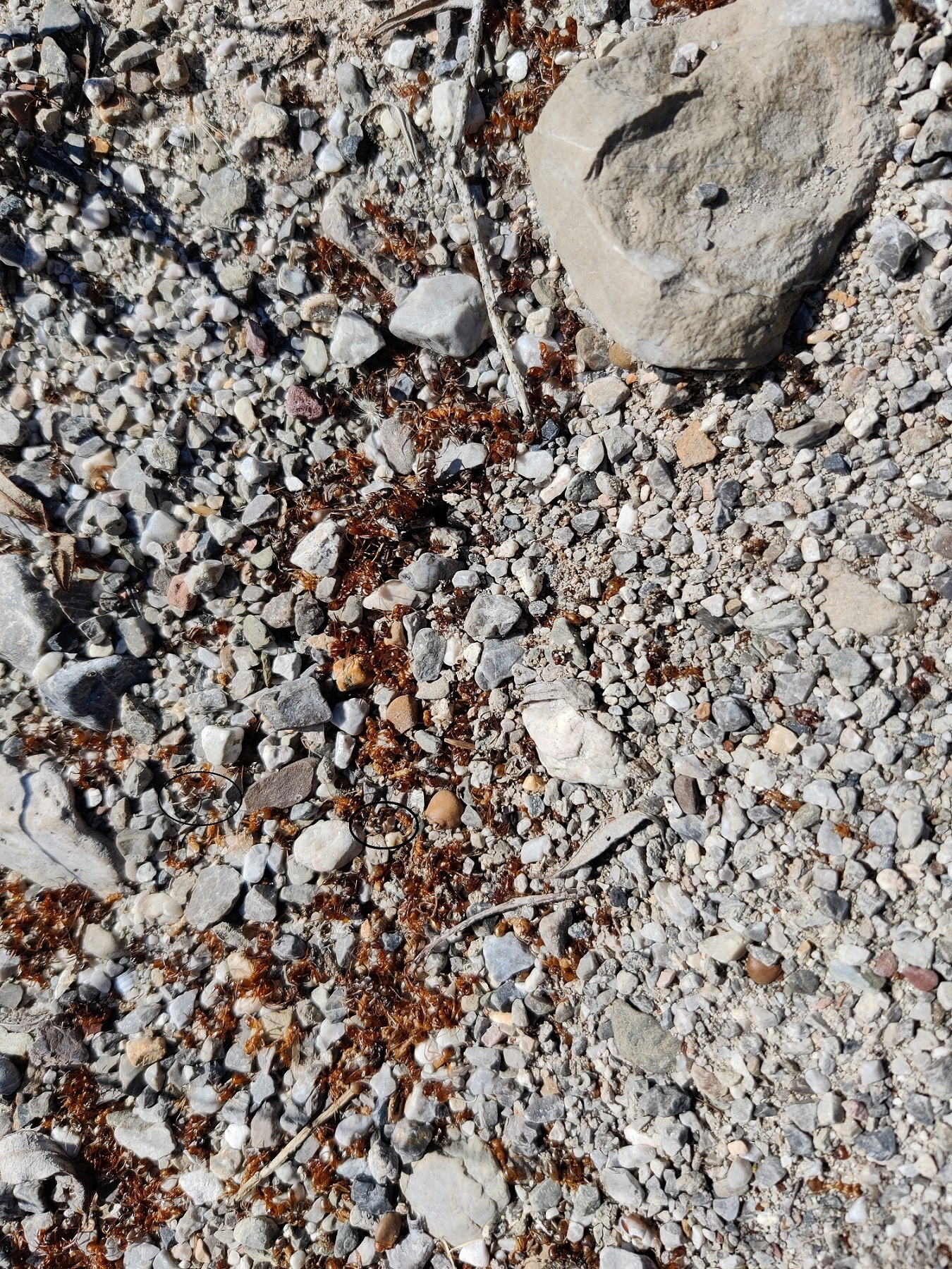 Bei einem Nest, welches auf einer Kiesstrasse entlang eines Flusses liegt, schien der Schwarmflug scheinbar kurz bevor zu stehen. Ich sah zwar keine Geschlechtstiere, aber jede Menge Arbeiterinnen, die aufgeregt in der Umgebung umher liefen. Auf den zweiten Blick wurde aber augenfällig, dass sich die Bewegung deutlich in eine Richtung abzeichnete. Auf ca. einem Meter breite liefen viele Tiere auf den Auslauf einer Wiese zu, die sich am linken Wegrand befand. Wiesen sind allerdings kein typisches Habitat der Art, hohes Gras wird normalerweise gemieden. Der Marsch aber führte fast zwei Meter weiter durch die Halme und fand sein Ziel kurz vor einem Waldrand.