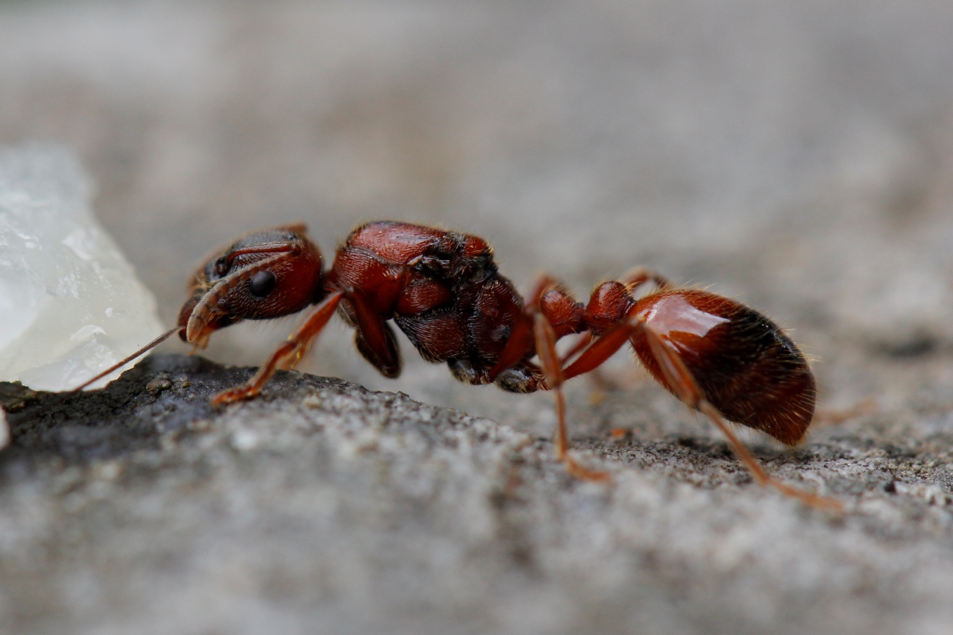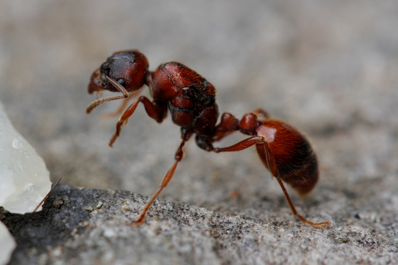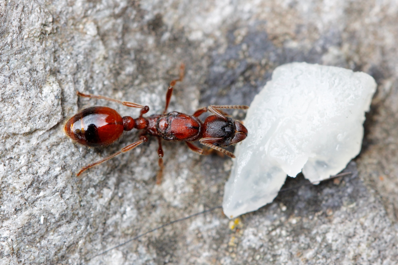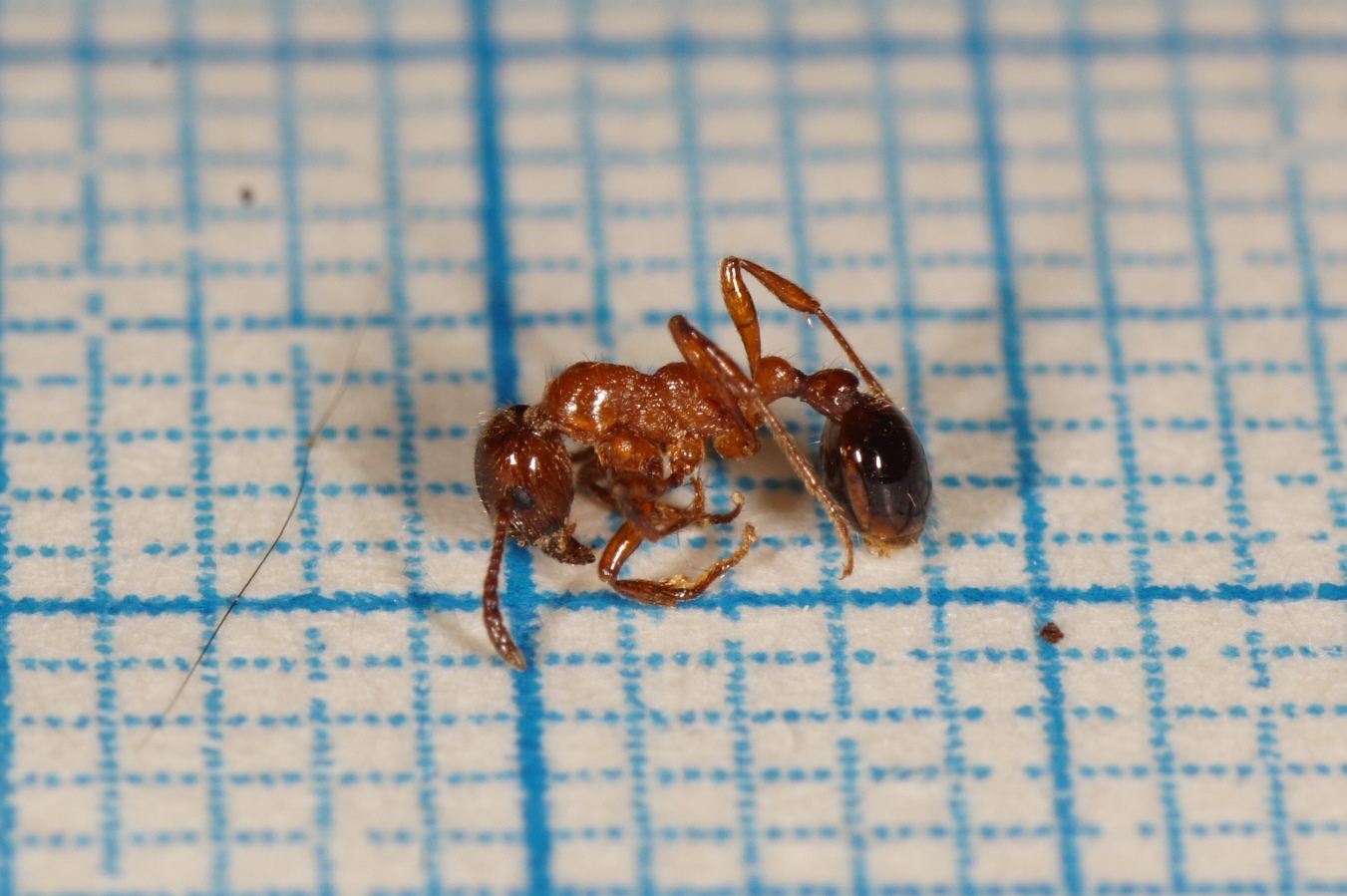 Nur, wer war der Gegner? Von den Verteidigerinnen war nichts zu sehen. Konnte es sich um ein Lasius-Nest handeln? Vom Auswurf her, wäre das möglich gewesen. Rund um das Nest waren Kämpfe im Gange, aber erst der zweite Blick offenbarte zwischen wem: Die Kontrahentinnen waren ebenfalls rote Knotenameisen, aber allesamt viel kleiner als Manica rubida. Ein kurzer Eingriff und die Beobachtung einiger in einander verbissener «Knäuel» von kämpfenden Arbeiterinnen in meiner Hand bestätigte die Vermutung: es handelte sich um eine Myrmica sp.