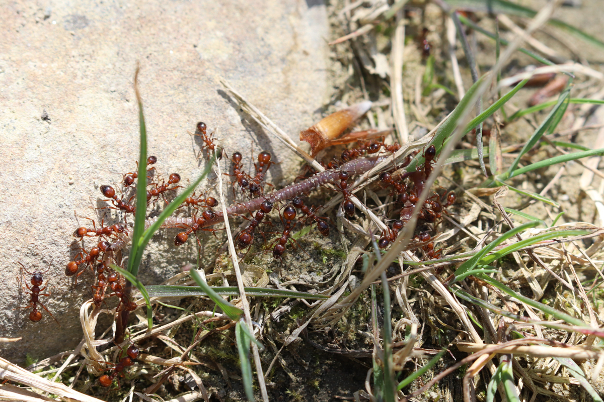 Es handelte sich dabei offensichtlich um ein kleines Hügelnest im Gras. Und es gab eindeutig einen organsierten Angriff darauf, welcher vom Manica-Nest ausging. In diesem Ausmass hatte ich die «Einzelkämpferinnen» vorher noch nie kooperieren gesehen. Jedenfalls nicht bei einem Angriff.