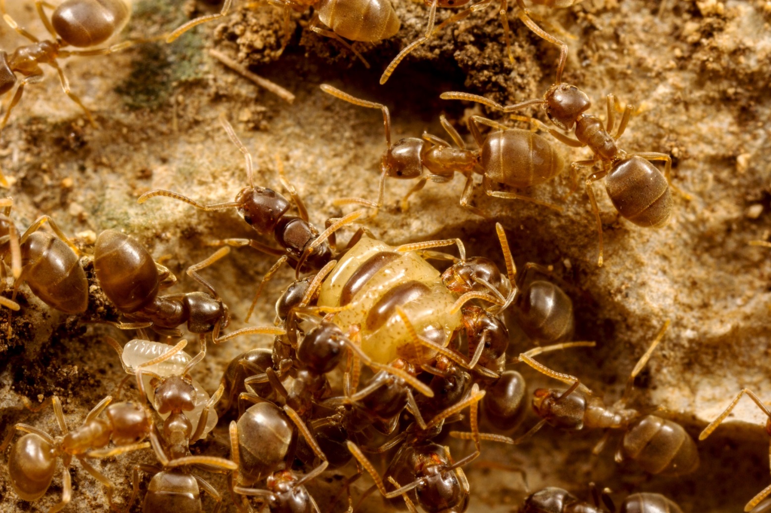 Arbeiterinnen mit einer Königin (neben d. physogastrischen Königin, daher vermutlich keine echt Polygynie). Die Gyne ist kaum größer als die Arbeiterinnen, was bereits im Vorfeld eine sozialparasitische Lebensweise vermuten lässt.