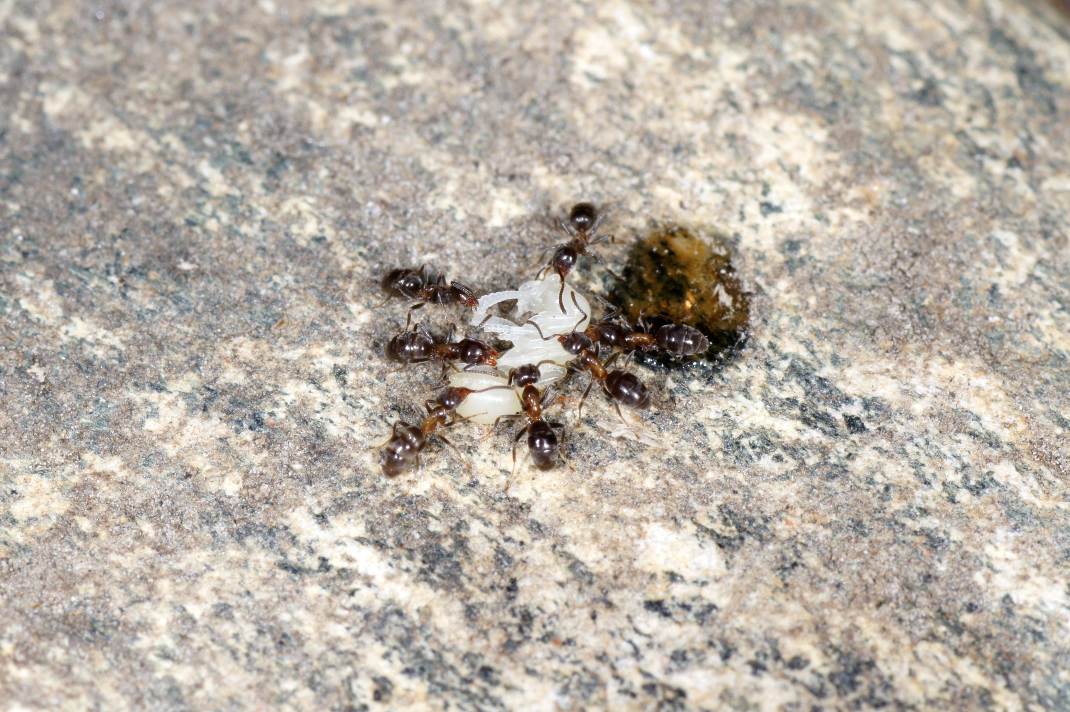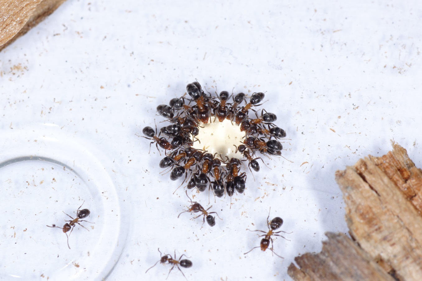 " - Das Bild zeigt eindeutig einige Vorpuppen (die noch aussehen wie große Larven), ansonsten Arbeiterinnenpuppen, die noch ganz weiß sind, also noch keine Cuticula-Färbung aufweisen. Zuerst werden sich dann die Augen dunkel färben (Andeutungsweise bei den beiden Puppen unten links und rechts zu erkennen). Als Angehörige der UF Dolichoderinae haben die Puppen keinen Kokon. Der würde von der Larve gesponnen, kurz bevor diese den Larvenkot (das Meconium) ausscheidet und damit zur Vorpuppe wird.