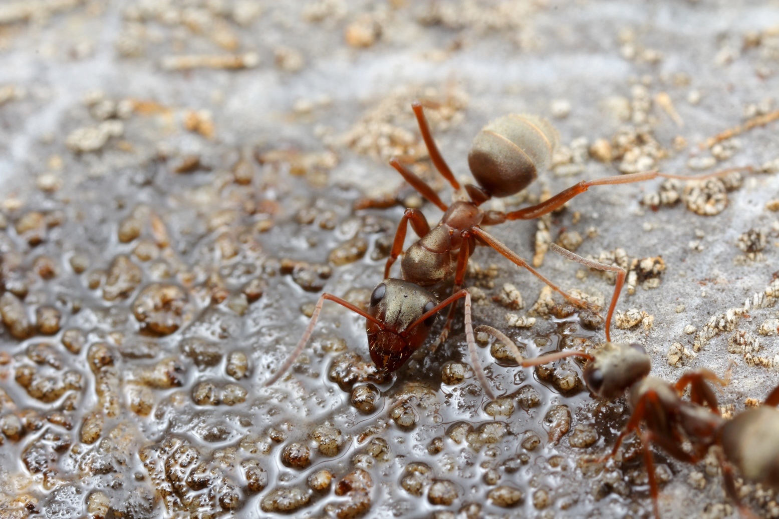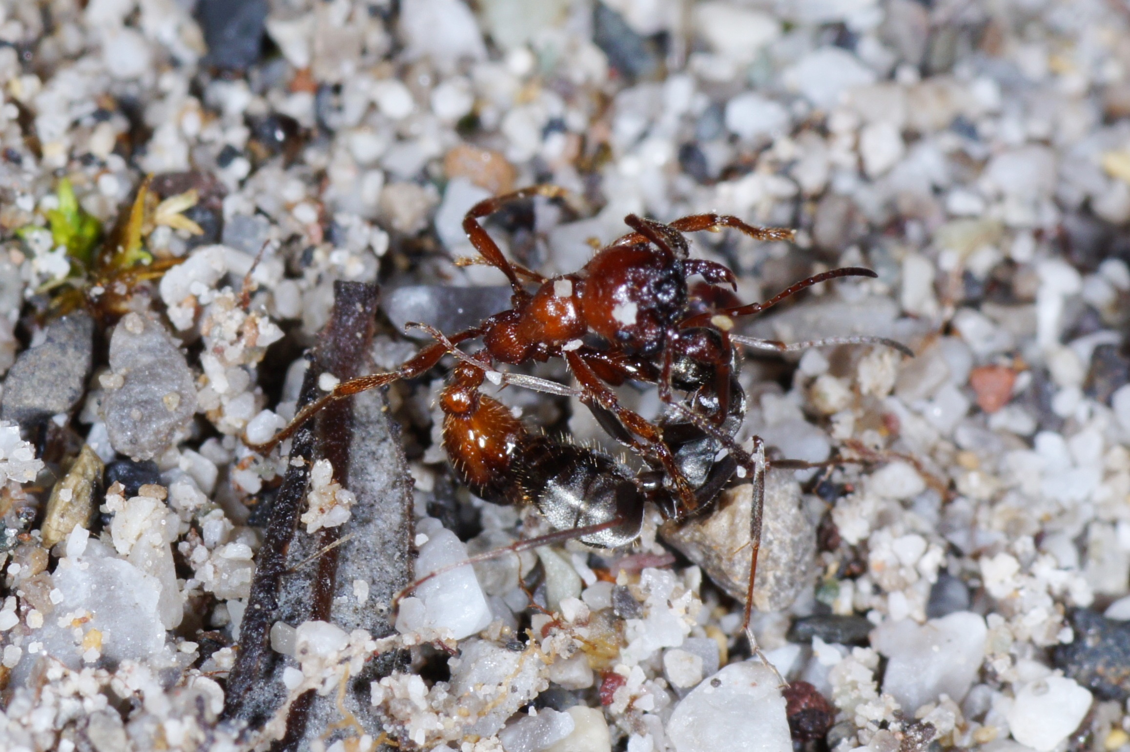 Im Einzelkampf ist Manica rubida meist überlegen, aber: eine F. fuscocinerea kommt selten allein! Ihr verspritzes Gift alarmiert Kolleginnen in einer Entfernung bis 50 cm, die sofort zu Hilfe eilen!