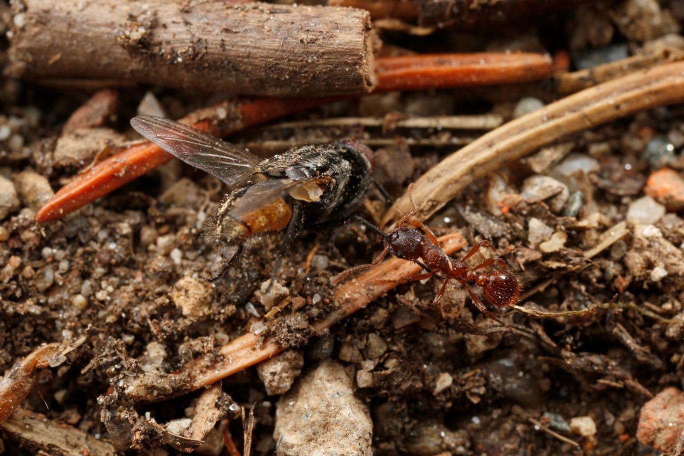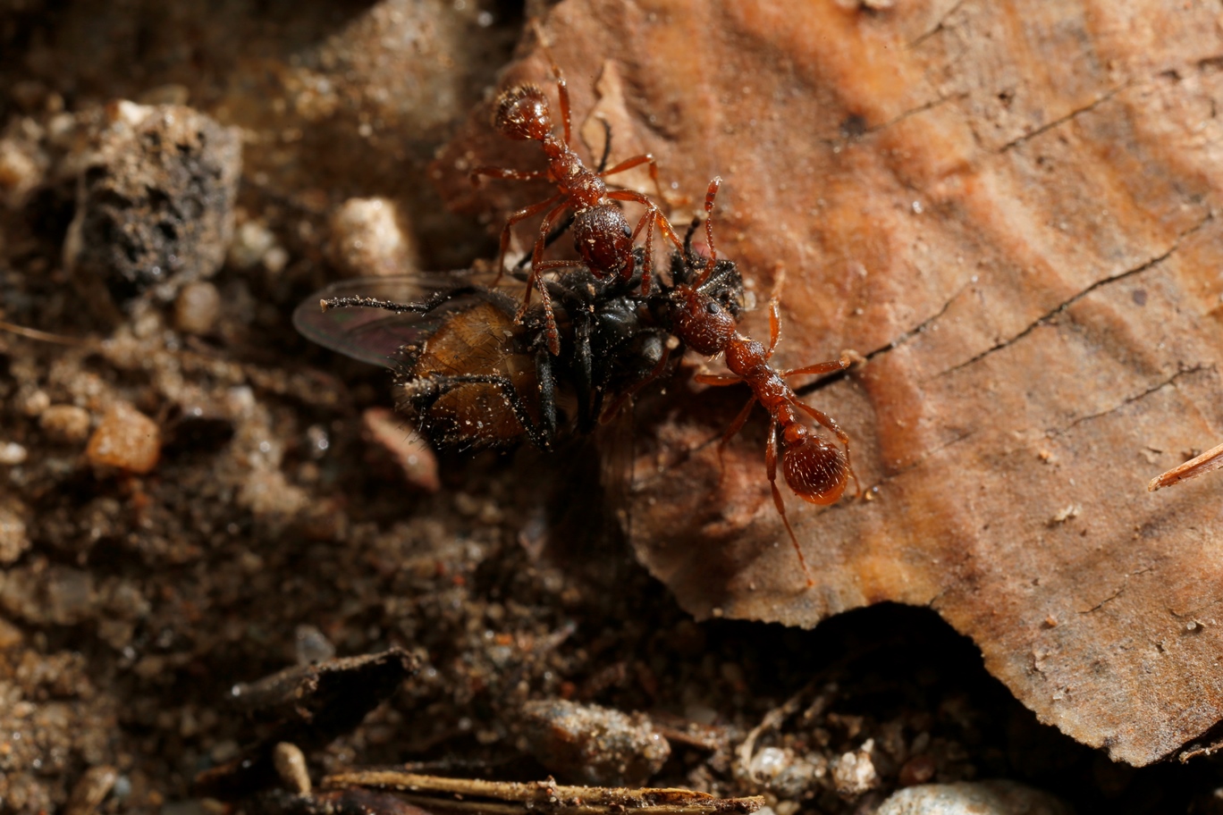 Arbeiterinnen beim Erbeuten von Nahrung und dazu eine tote Gyne, die ich gestern aus einem Wasserbecken gefischt habe. Fotos d. Arbeiterinnen v. Roman Borovsky