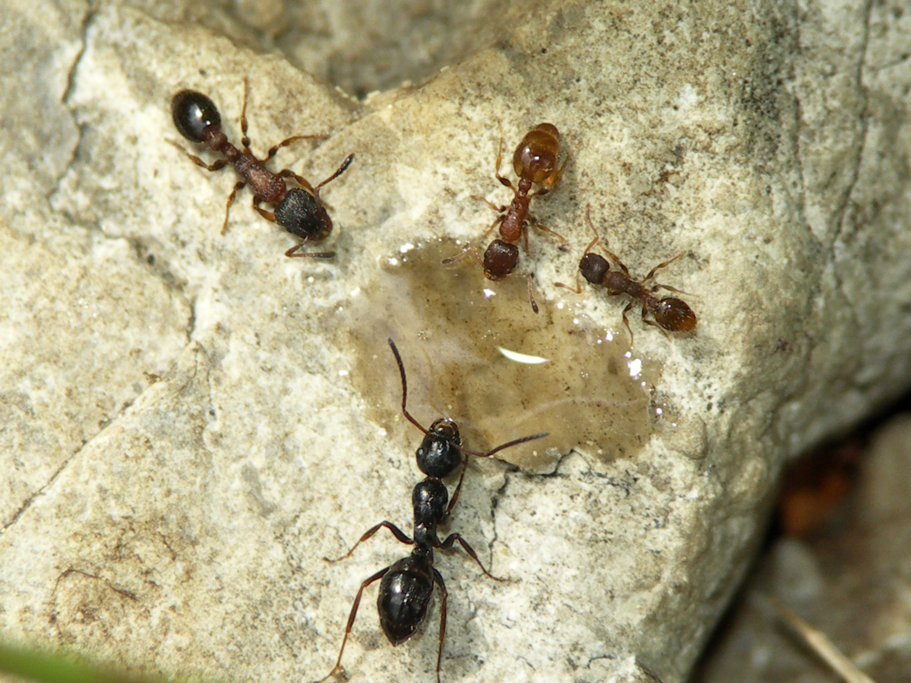 altes Gruppenbild (Bridge-Kamera) an der Fütterungsstelle: L. acervorum, Camponotus piceus und mindestens eine unbest. Temnothorax-Art