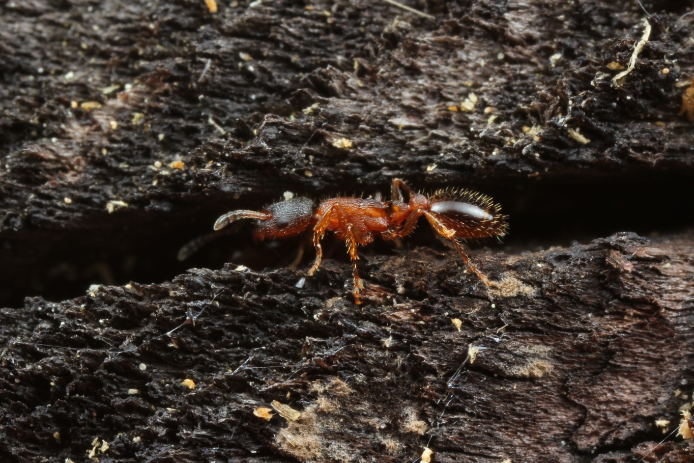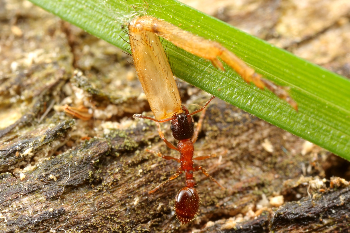 Die Unterscheidung der Gattungen Leptothorax u. Temnothorax lässt sich ganz gut an der Anzahl der Fühlerglieder festmachen: Leptothorax 11, Temnothorax 12 Glieder. Leptothorax acervorum, auch als Große Schmalbrustameise bezeichnet, kommt in unterschiedlichen Habitaten vor. Die Nester werden vorwiegend in liegendem Totholz errichtet. Ich konnte ein einziges Mal ein Nest in etwa 2 m Höhe in einem stehenden, abgestorbenen Obstbaum entdecken. Für Schmalbrustameisen ist die Art groß (Arbeiterinnen bis 4 mm Länge) und kann sich recht schnell bewegen. Es gibt mono- u. polygyne Nester. Die Art gilt als ausgesprochen frosthart (SEIFERT S. 223).