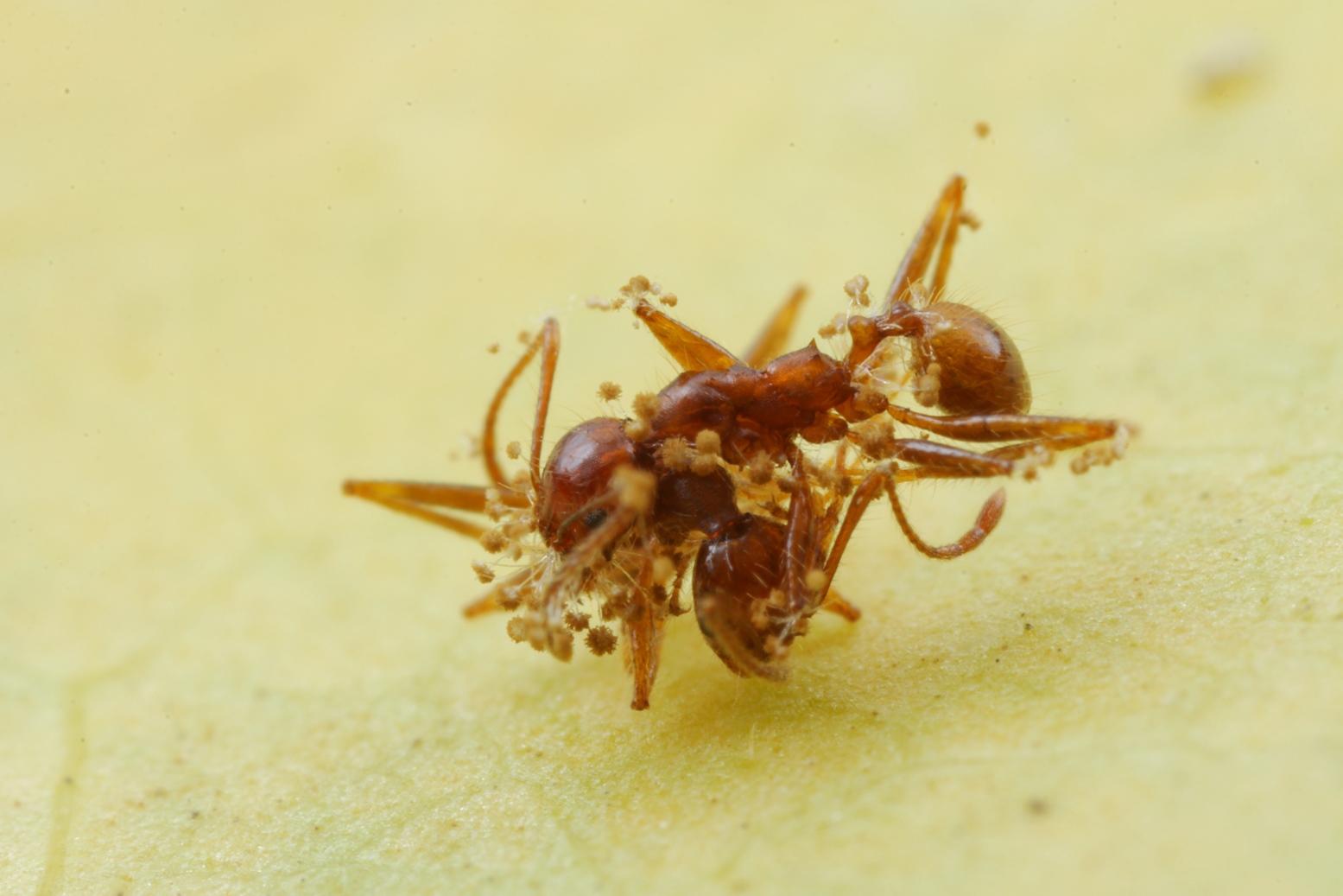 128. Nach dem Tod beginnt das Leben der parasitischen Pilze (3 weiße Fruchtkörper); aber auch der braune "Ast" ist aus der Mitte des Körpers gewachsen!!!