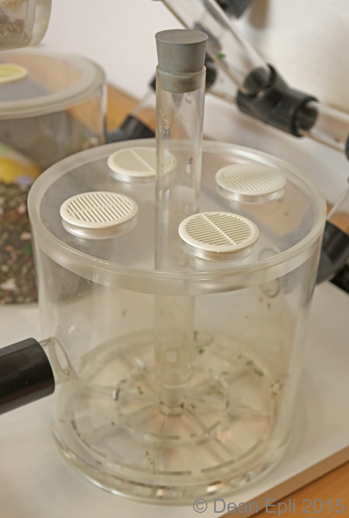 Meine neuste Umsetzung ist eine Ameisentränke die sich von außen und vor allem mit großen Mengen Honigwasser befüllen lässt. So eine große Kolonie trinkt wirklich viel Honigwasser, da braucht man also auch eine größere Tränke, wenn man nicht stündlich nachfüllen will.