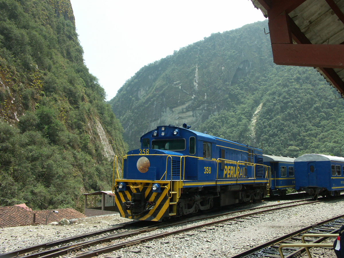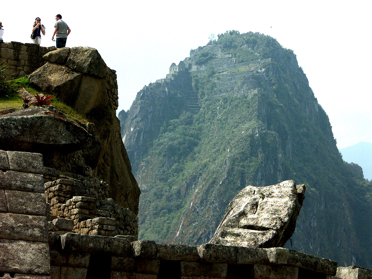 Das zweite Bild zeigt den Blick von Machu Picchu auf den noch höheren Huayna Picchu, auf dem ebenfalls Inka-Bauten und Anbauterrassen zu erkennen sind.