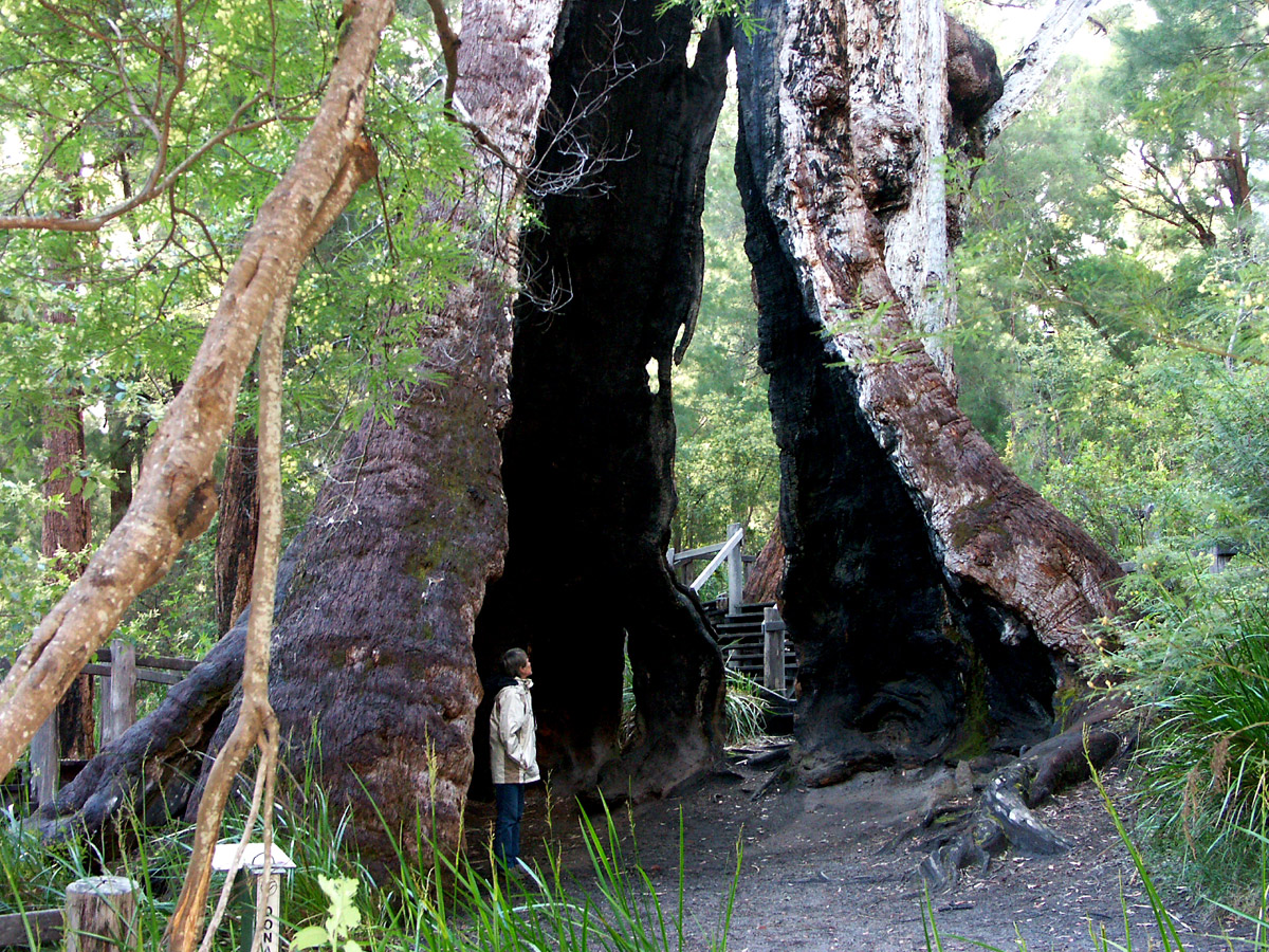 Die riesigen Eukalyptus-Bäume dort sind vielfach innen ausgebrannt, leben aber dennoch weiter.