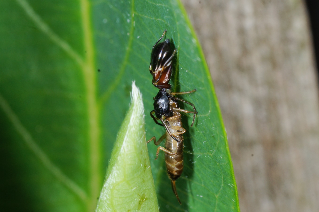 Eine Springspinne hat die Larve des Ohrwurms (Dermaptera) gefangen. Ob es sich bei der Spinne um eine Leptorchestes sp. oder Ameisenspringspinne sp.(Myrmarachne) handelt, ist so kaum zu sagen. Mimkry liegt sehr wahrscheinlich vor.