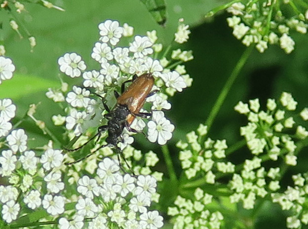 Stenurella melanura, Syn.: Strangalia melanura), auch Gemeiner Schmalbock, hier bei der Paarung auf einer Umbellifere.