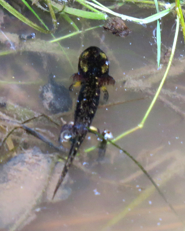 Larven vom Feuersalamander in einem Graben am Wegrand. Charakteristisch der sehr breite Kopf und die gelben Flecken an der