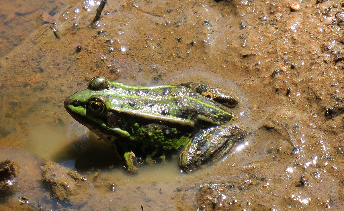 Wasserfrösche sind in dem Gebiet recht häufig. Es ist ein flacher Wald mit vielen Gräben und Wasserlöchern, auch bei trockener Witterung. In der Nähe von zwei großen, unter Naturschutz stehenden Stauweihern hat man Kuhlen angelegt, die mit Teichfolie ausgelegt sind, so dass sie auch in Trockenzeiten noch Wasser enthalten. Es soll wohl die dort noch vorkommende Gelbbauchunke fördern. Die sahen wir heute leider nicht.