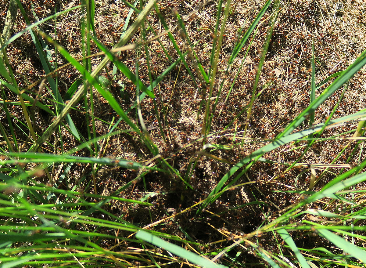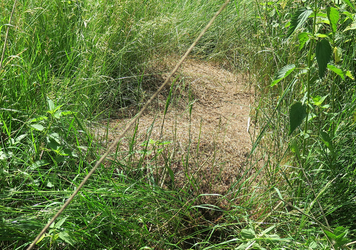 Schließlich die Kerbameisen: Die „Wiese“ stand schulterhoch, Gräser und Brennnesseln. Es war kein Durchkommen, aber ein paar Nester am Waldrand sahen doch sehr gut aus. Wieder einmal zeigt sich: Wo Waldameisen siedeln, sollte man möglichst wenig eingreifen. Dann bleiben sie da auch!