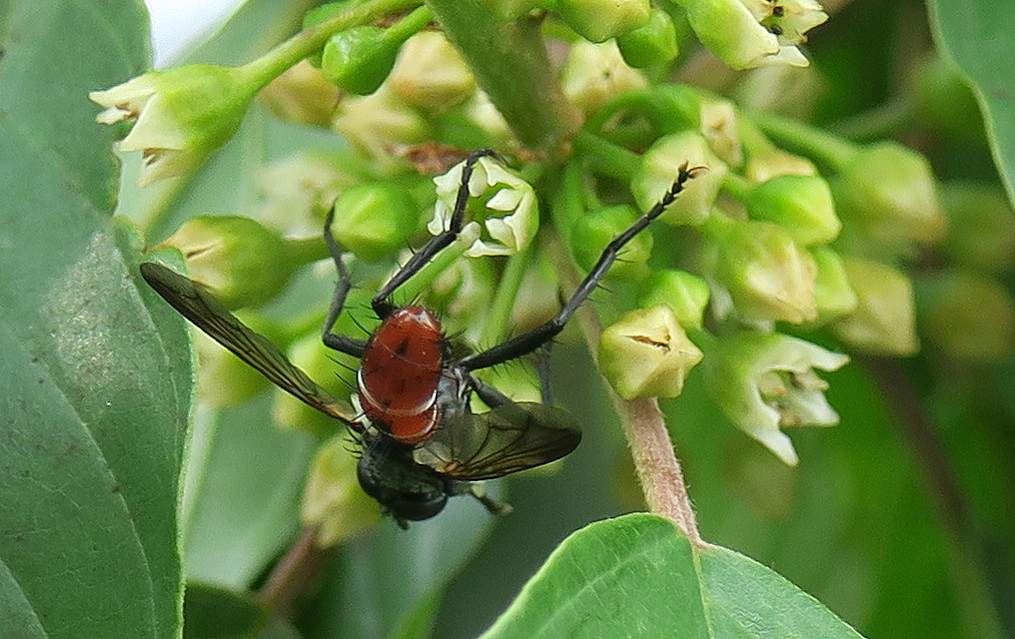 Eine (mir unbekannte) Fliege mit rotem Po findet hier auch etwas zum Naschen.