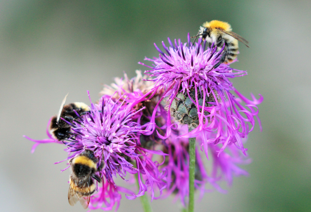 Auf diesem Bild tummeln sich gleich drei Arten von Hummeln. Weiss jemand welche? Ich vermute Bombus cf. terrestris und B. cf. pascorum. Aber bei der Schwarzen mit dem weissen Hinterleibsende bin ich ratlos.