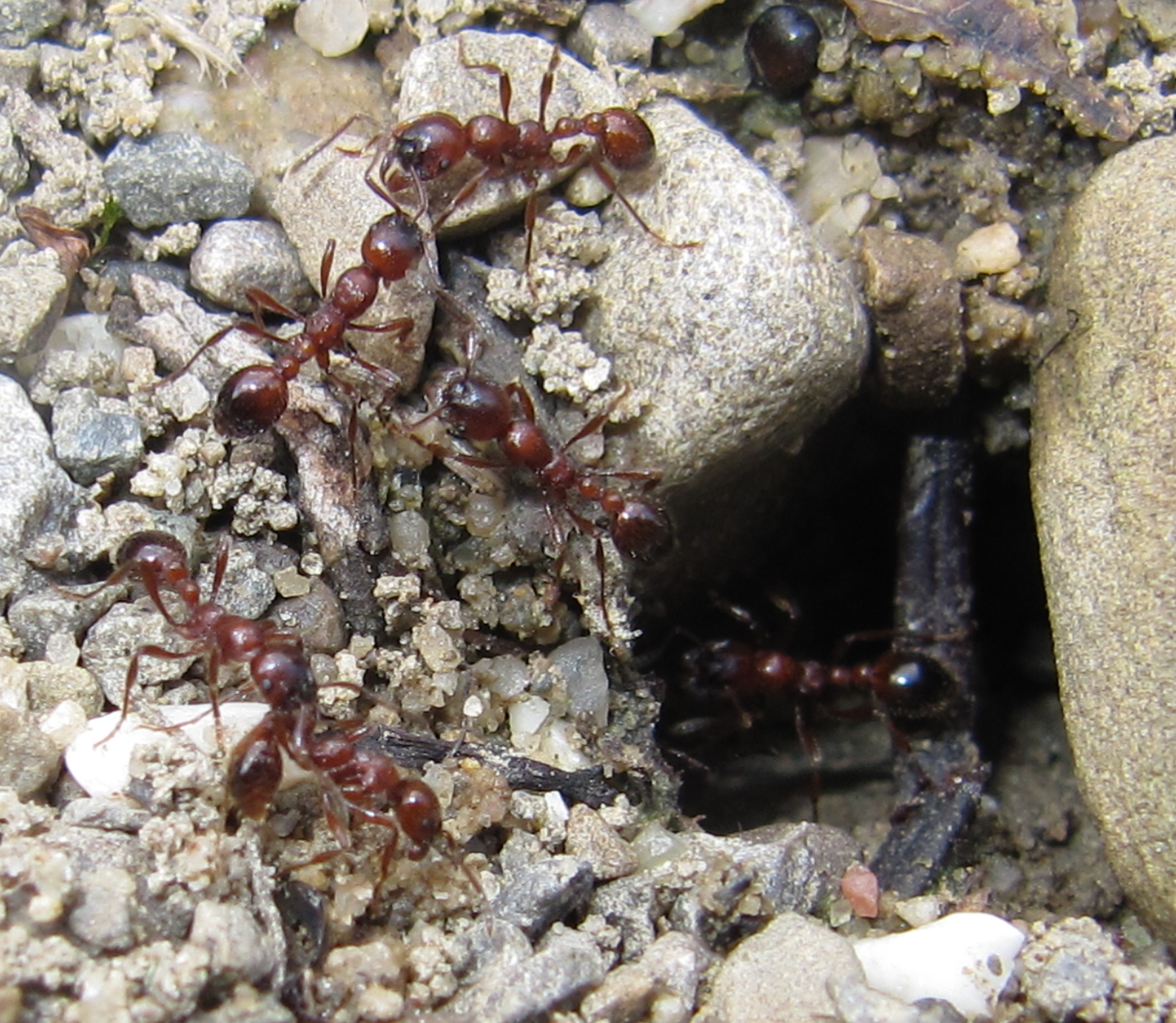 Dazu sind offenbar recht viele Ameisen in der Lage: Als erstes fallen einem die vergleichsweise grossen und trägen Manica rubida auf, deren Nestausgänge kreisförmig von Aushubmaterial umgeben sind.