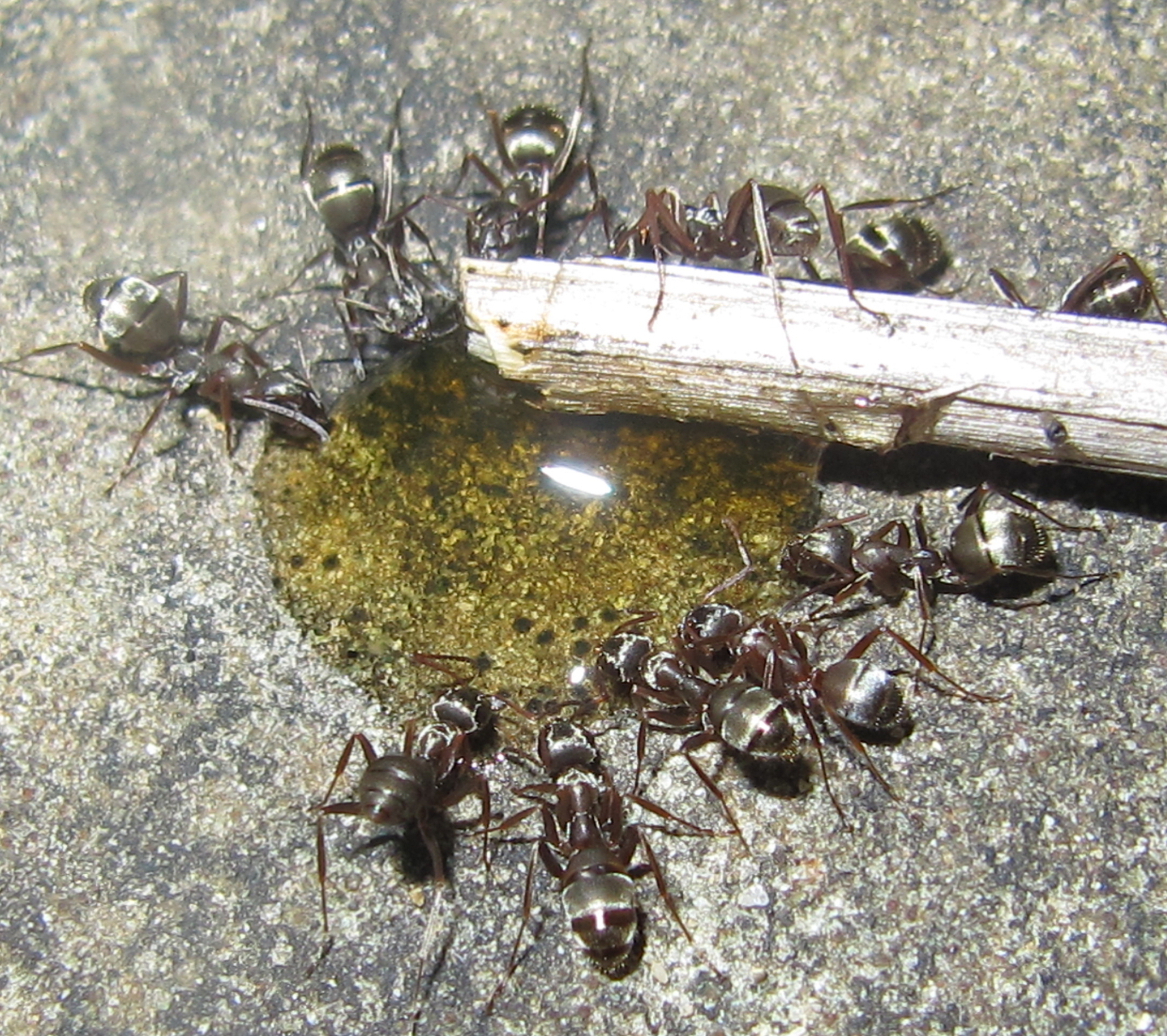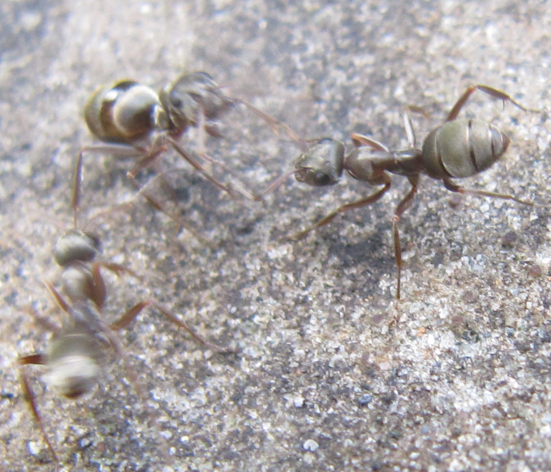 Was ist denn da unter dem Stein los? Tatsächlich, in unmittelbarer Nähe finden sich auch ein Nest von schwarzen Formica (Serviformica) sp. Der Abstand zwischen dem Nestausgängen beträgt gerade mal 30cm. Keine Sorge, nachem sich die Formica unter die Erde zurückgezogen haben, habe ich den Stein an seinen alten Platz zurückgelegt.
