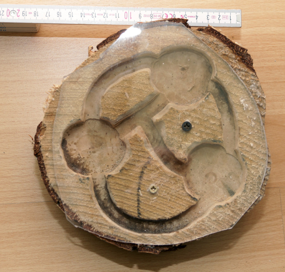 Der Gesamtdurchmesser liegt bei ca. 20cm und der Kammerdurchmesser bei ca. 5cm und -höhe bei ca. 1-1,5cm. Die Eingangsbohrung ist ca. 0,5cm groß. Die Plexiglasplatte ist leider ziemlich unsauber gesägt, da ich damals noch keinen Dremel zur Verfügung hatte. Sie lässt sich aber durch die zwei Schrauben ganz einfach entfernen und austauschen. Die Kammern müssten vor Bezug einer neuen Kolonie eventuell noch mal gereinigt werden, da sich einiges an Dreck gesammelt hat.