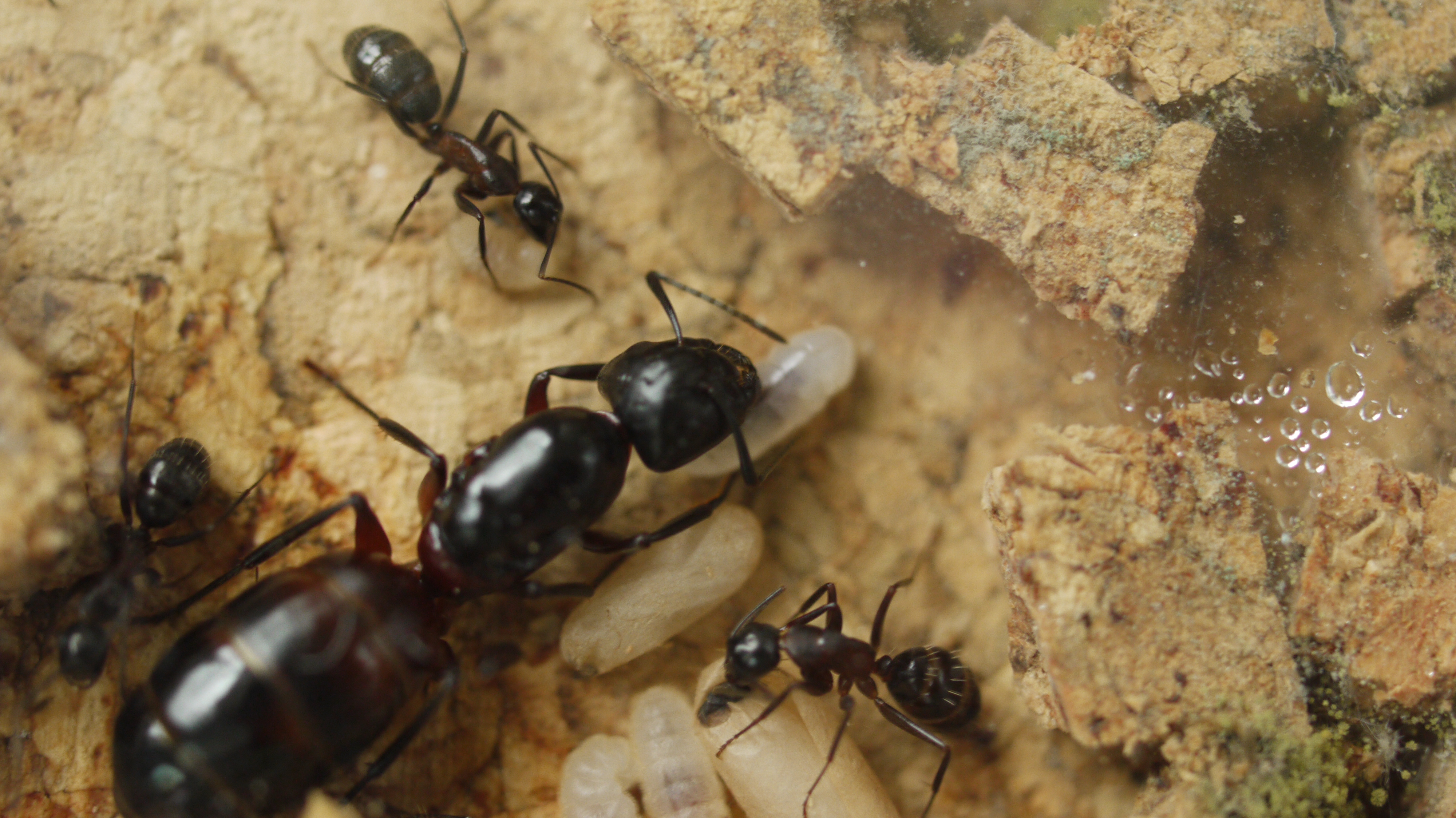 Camponotus ligniperdus besticht durch ihre Größe und die rot-bräunliche bis schwarze Färbung. Der Glanz dieser Ameisen tut sein Übriges. Selbst mit bloßem Auge sind Maxillen und Labium zu erkennen. Mit etwas Fototechnik ist hier noch deutlich mehr zu sehen. Hinzu kommt das, besonders zu Anfang, langsame Wachstum der Kolonie. Für Halter mit vorläufig wenig Platz ist diese Art daher eine gute Option. Wenn diese Kolonie wirklich groß wird, so der Plan, bin ich mit meinem Studium fertig. Dann habe ich auch mehr Geld für mehr Platz! Meine anderen Kolonien habe ich abgegeben, dies ist nun mein einziges Projekt neben Lasius cf. emarginatus, welche jedoch bereits lange bei mir wohnen.