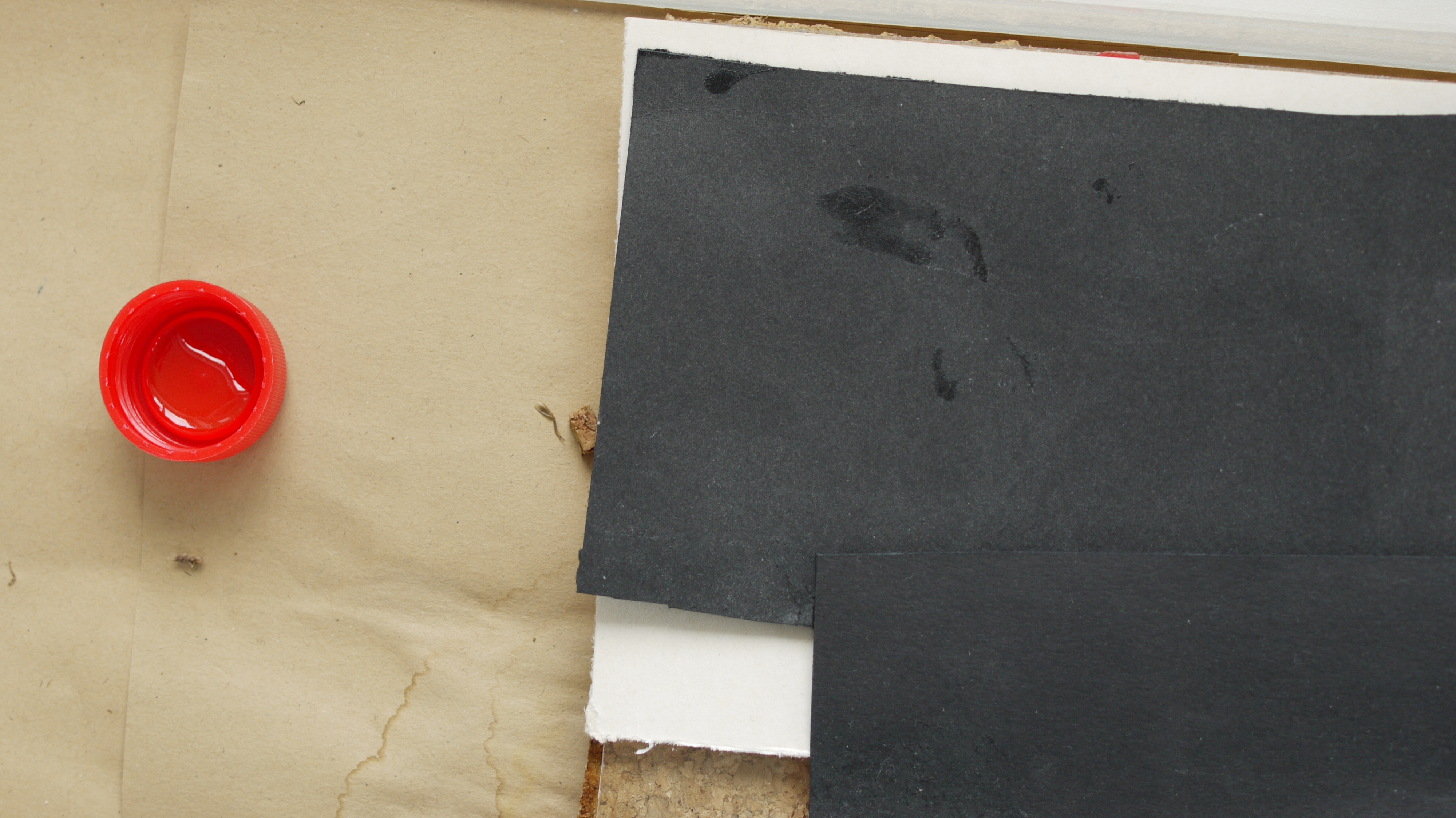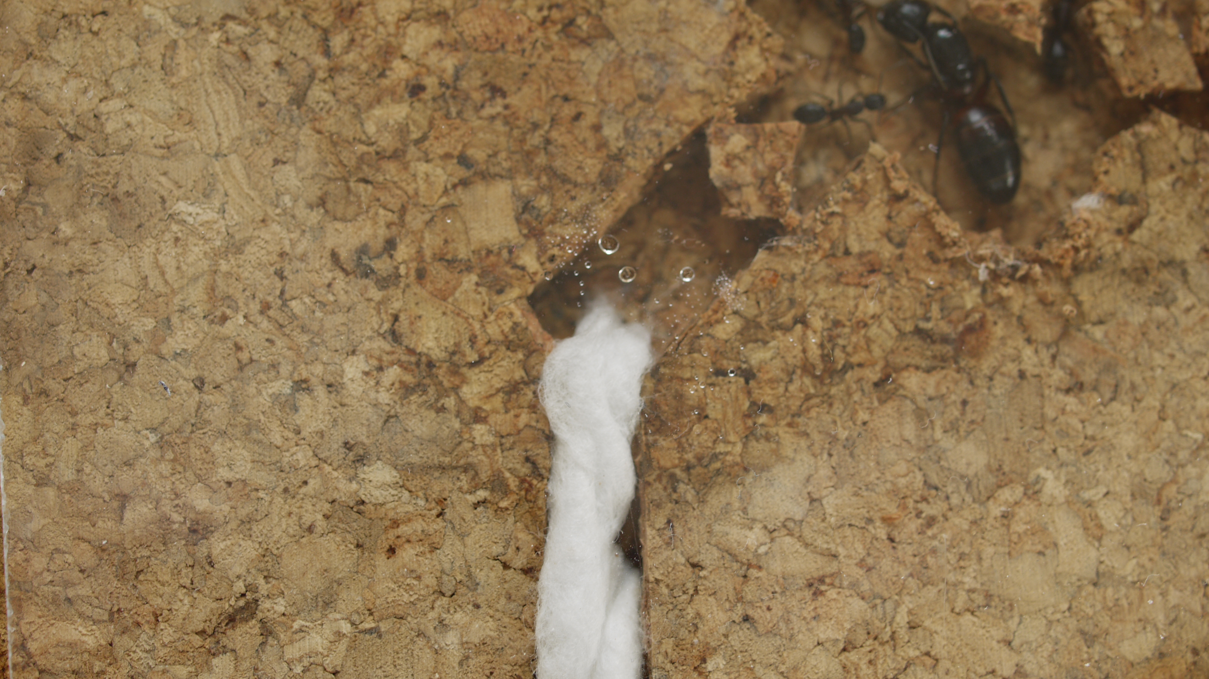 Ich als Halter liebe gut eingerichtete, "hübsche" Formicarien. Möglichst naturnah. Das Risiko, dass hier etwas schief geht, ist momentan jedoch zu groß. Daher werden die Ameisen gezielt einer relativ faden Umgebung ausgesetzt. Es handelt sich hierbei um ein Korknest, bestehend aus zwei übereinander liegenden Korkplatten. Die Korkplatten haben eine Stärke von 6 mm, es wird eng. Dieses Nest ist nicht verschraubt oder verklebt. Der Vorteil liegt hier ganz klar darin, dass schnell eingegriffen werden kann. Der Nachteil: Bereits jetzt hat sich der Kork durch die Feuchtigkeit verformt. Mal gucken, wie sich das entwickelt. Ein sehr simples Bewässerungssystem aus Watte, dem Fuß einer Tränke und einem Loch im Kork hält das Nest feucht.