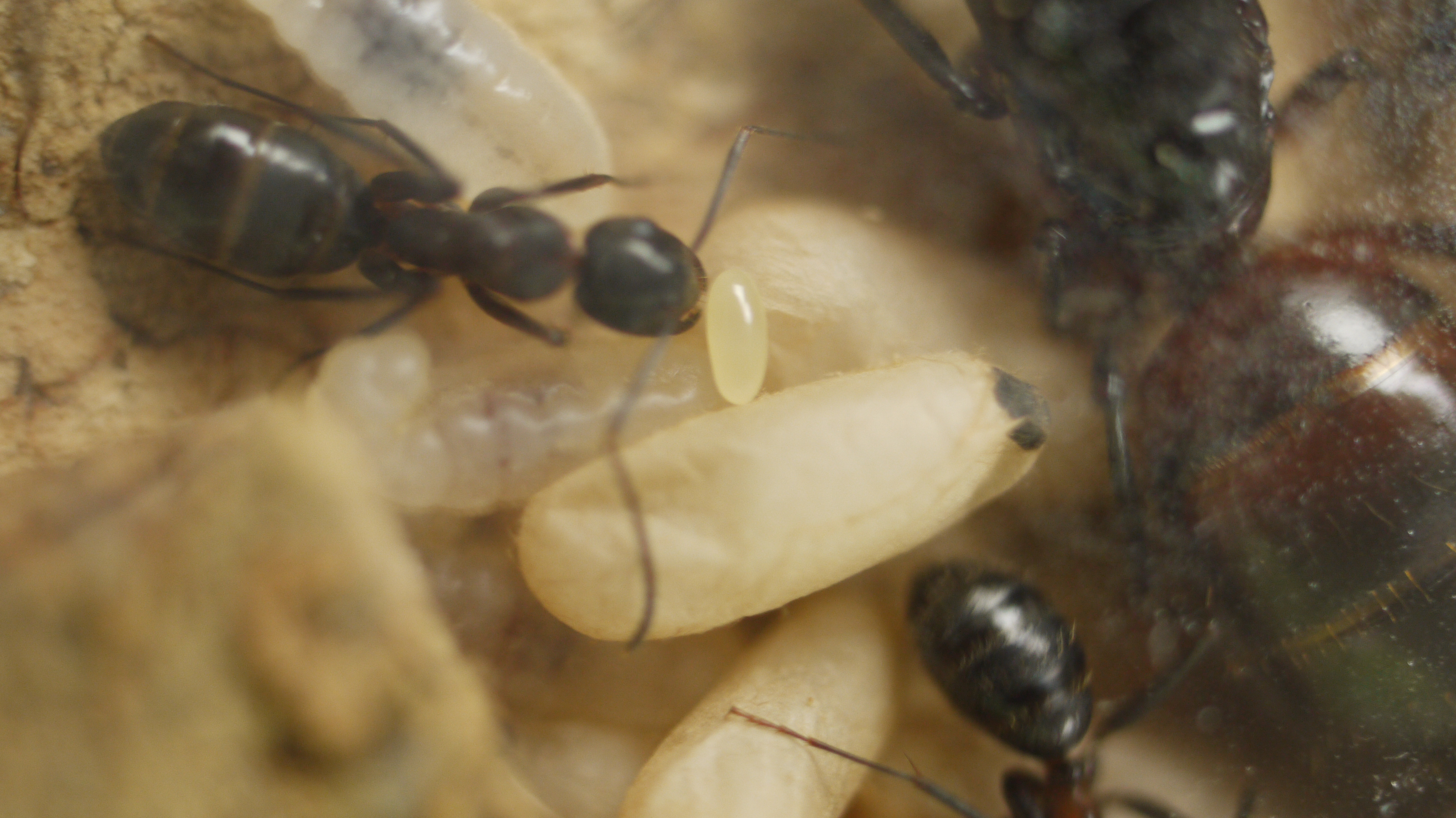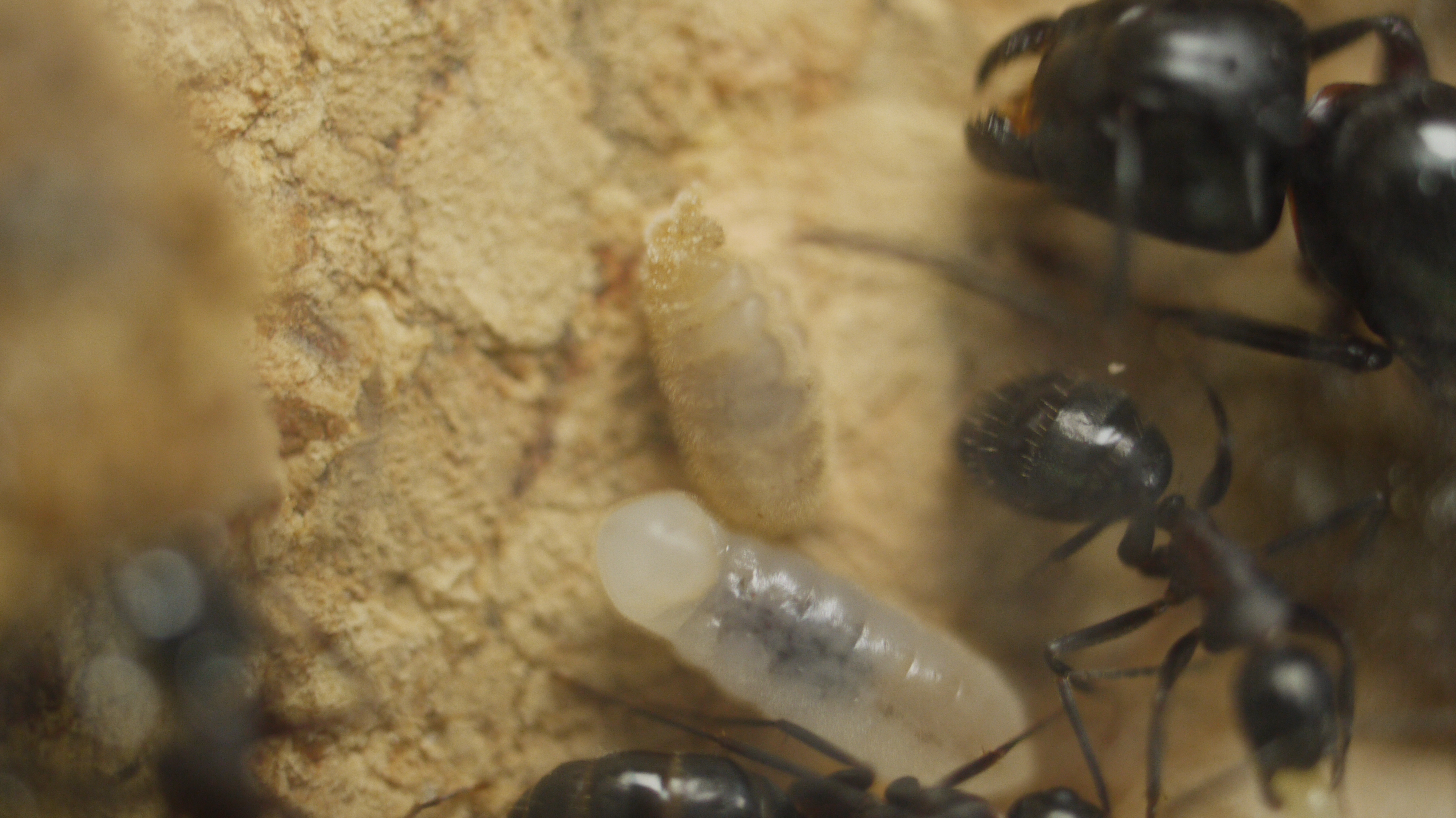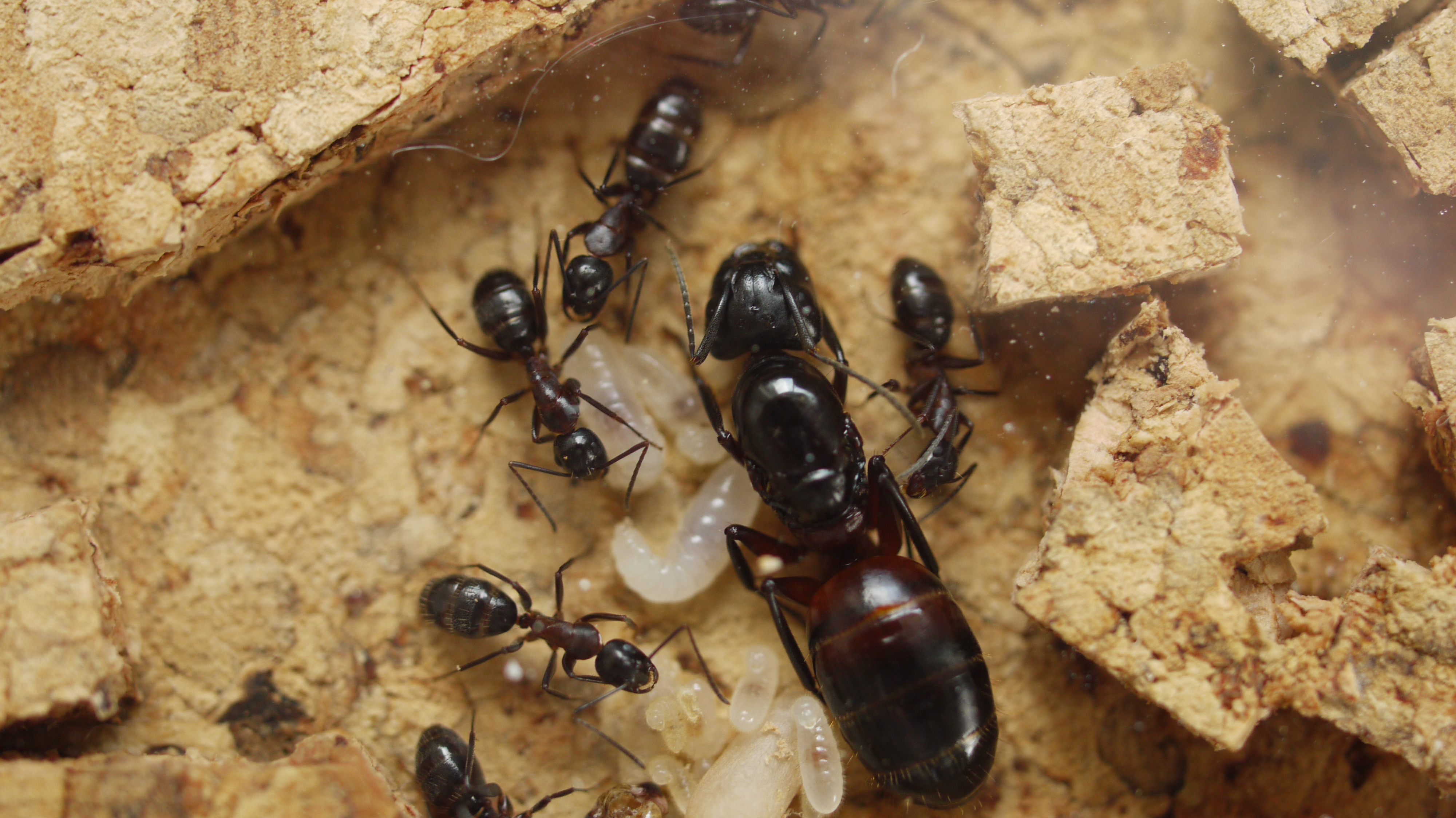 Camponotus ligniperdus besticht durch ihre Größe und die rot-bräunliche bis schwarze Färbung. Der Glanz dieser Ameisen tut sein Übriges. Selbst mit bloßem Auge sind Maxillen und Labium zu erkennen. Mit etwas Fototechnik ist hier noch deutlich mehr zu sehen. Hinzu kommt das, besonders zu Anfang, langsame Wachstum der Kolonie. Für Halter mit vorläufig wenig Platz ist diese Art daher eine gute Option. Wenn diese Kolonie wirklich groß wird, so der Plan, bin ich mit meinem Studium fertig. Dann habe ich auch mehr Geld für mehr Platz! Meine anderen Kolonien habe ich abgegeben, dies ist nun mein einziges Projekt neben Lasius cf. emarginatus, welche jedoch bereits lange bei mir wohnen.