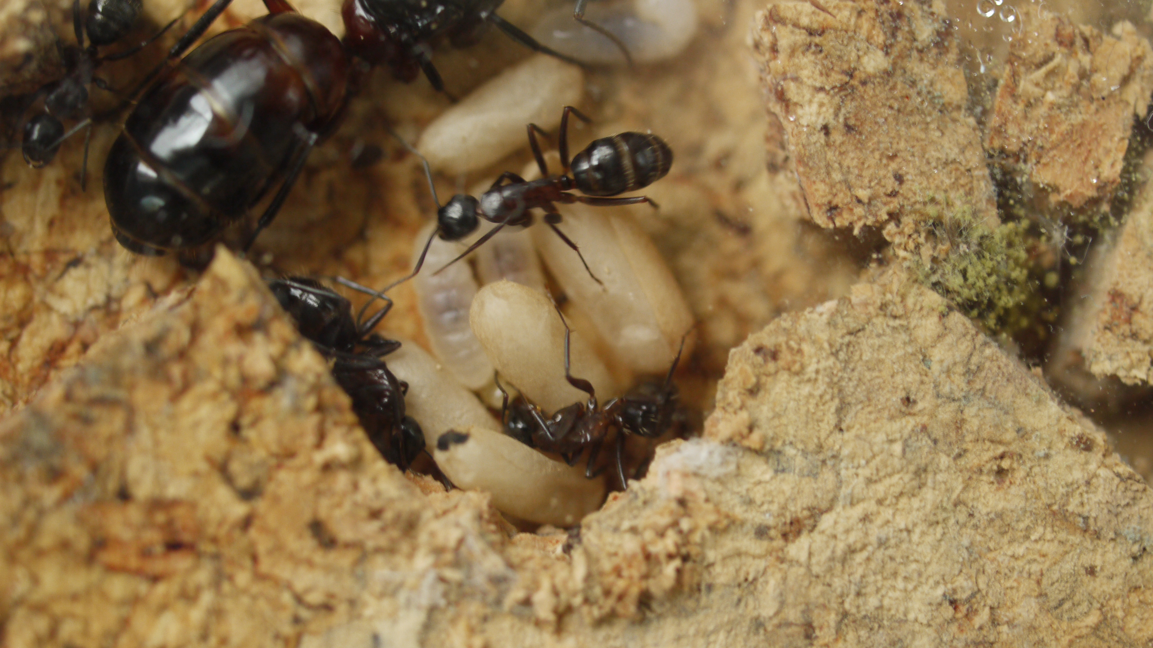Camponotus ligniperdus wirken auf mich bisher sehr gemächlich. Da sich jedoch der Charakter einer Kolonie oft mit der Größe ändert, werde ich die von mir so geschätzte Eigenschaft sicherlich in Zukunft revidieren müssen. Ein oftmals genannter "Nachteil": Die Brut dieser Art braucht eine deutlich längere Entwicklungszeit, als viele andere Arten. Um in der Natur überhaupt etwas "gebacken" zu bekommen, muss die Entwicklung so stark beschleunigt werden, wie dies möglich ist. Zwei Parameter sind hier wichtig: Futter und Temperatur. So ist es nicht verwunderlich, dass Camponotus ligniperdus warme Neststandorte mit direkter Sonneneinstrahlung schätzen. Nester dieser Art finden sich häufig in Kombination mit Totholz, aber auch weichem Holz lebender Bäume. In beiden Fällen sind mehr oder minder große Erdnester vorhanden. Laut Seifert gibt es zudem reine Erdnester, welche von dieser Art beim Fehlen von geeignetem Holz benutzt werden.