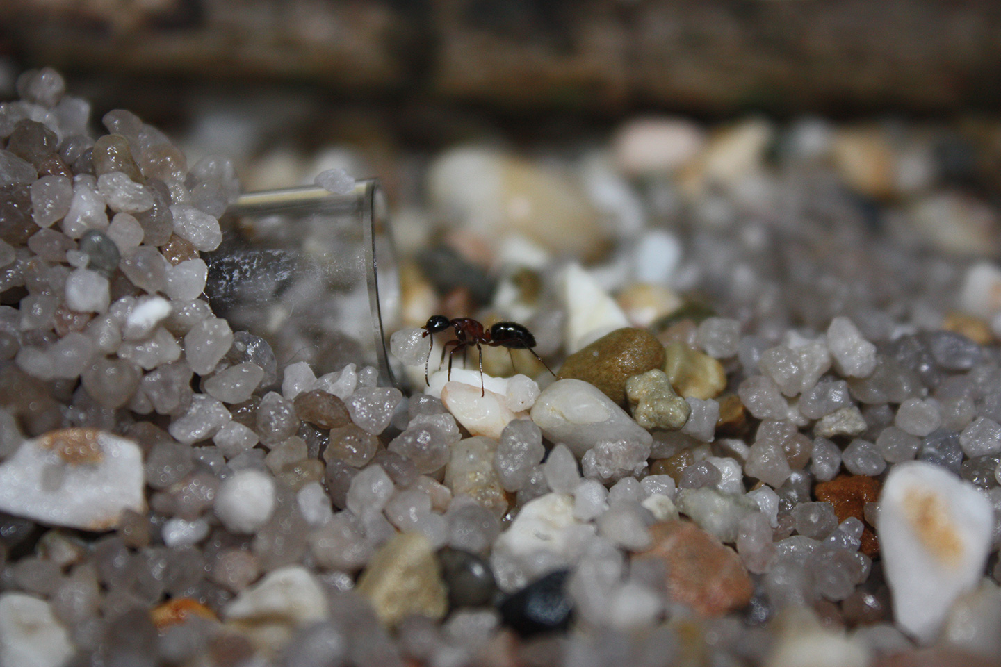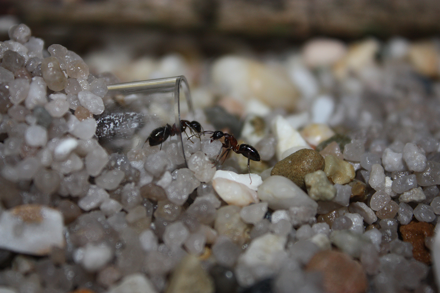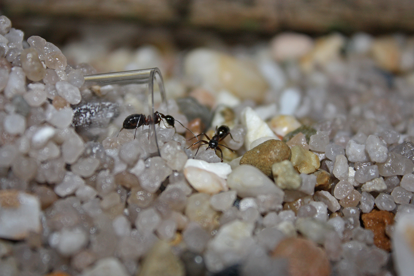 Nach dem ich das Reagenzglas in den Kies halb vergraben habe, bauen die Ameisen das Reagenzglas mit kleinen Kiessteinchen zu. Auch sind sie anscheinend sehr hungrig den sie stürzten sich geradezu auf den Angebotenen Honig. In der Arena sah ich derweil eine Assel rumkrabeln. Und noch eine endeckung eine winzig kleine Ameise sah ich auch in der Arena Größe 1-2 mm . Auch eine kleine schwarze spinne mit roten Füßen sah ich. Ach ja die ersten Ameisen laufen am Ytongstein lang.