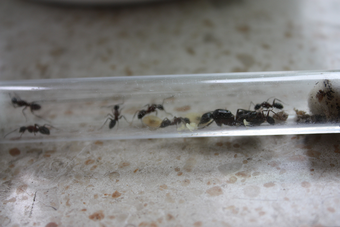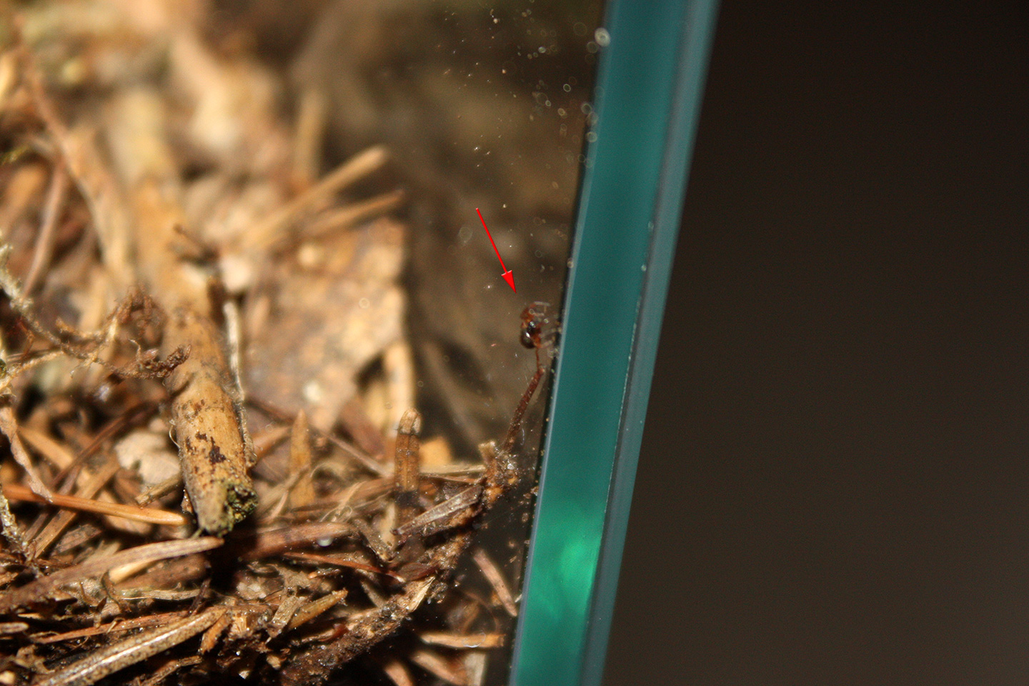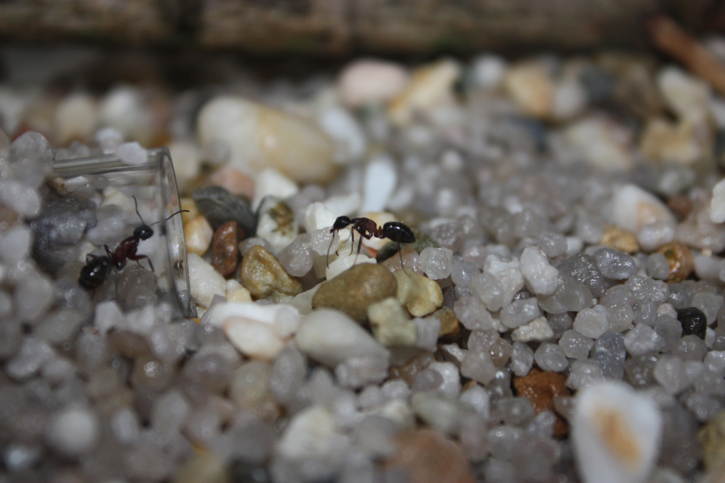 Nach dem ich das Reagenzglas in den Kies halb vergraben habe, bauen die Ameisen das Reagenzglas mit kleinen Kiessteinchen zu. Auch sind sie anscheinend sehr hungrig den sie stürzten sich geradezu auf den Angebotenen Honig. In der Arena sah ich derweil eine Assel rumkrabeln. Und noch eine endeckung eine winzig kleine Ameise sah ich auch in der Arena Größe 1-2 mm . Auch eine kleine schwarze spinne mit roten Füßen sah ich. Ach ja die ersten Ameisen laufen am Ytongstein lang.