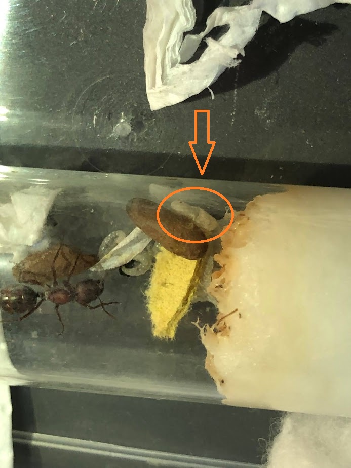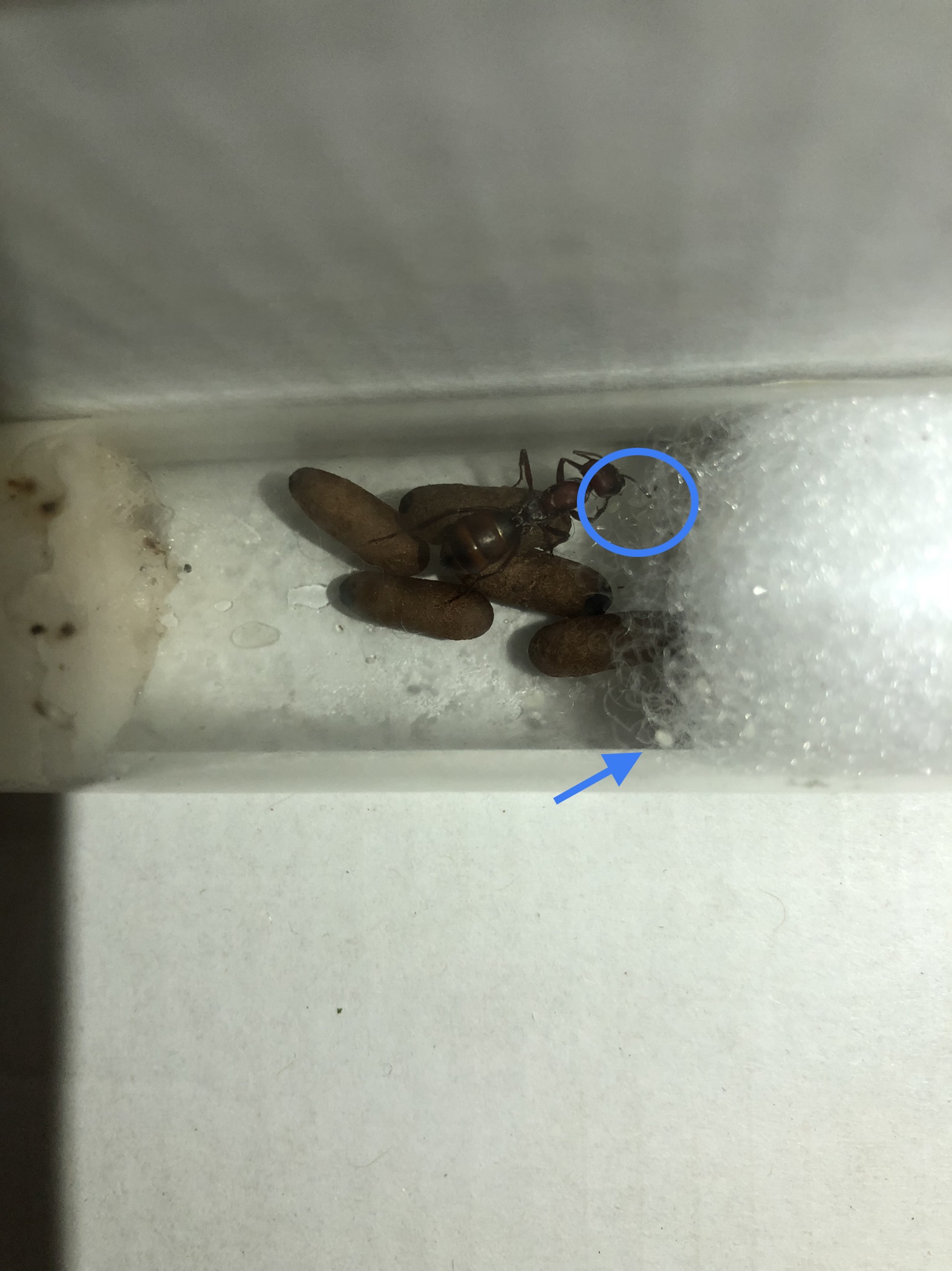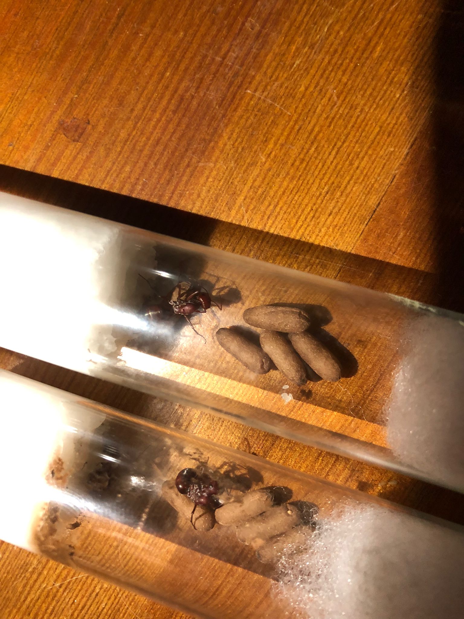 11. Juni 2022gegen 8:30 morgensZu unserer großen Freude entdeckten wir nun auch bei der zweiten Gyne einen größeren Eierhaufen (~10 Eier). Es fiel uns auch auf, dass die erste Gyne an einem Kokon zu beißen begann. Es scheinte auch ein Fühler rauszuschauen. Das ließ uns hoffen, bei unserer Rückkehr evtl. eine erste Arbeiterin zu entdecken.
