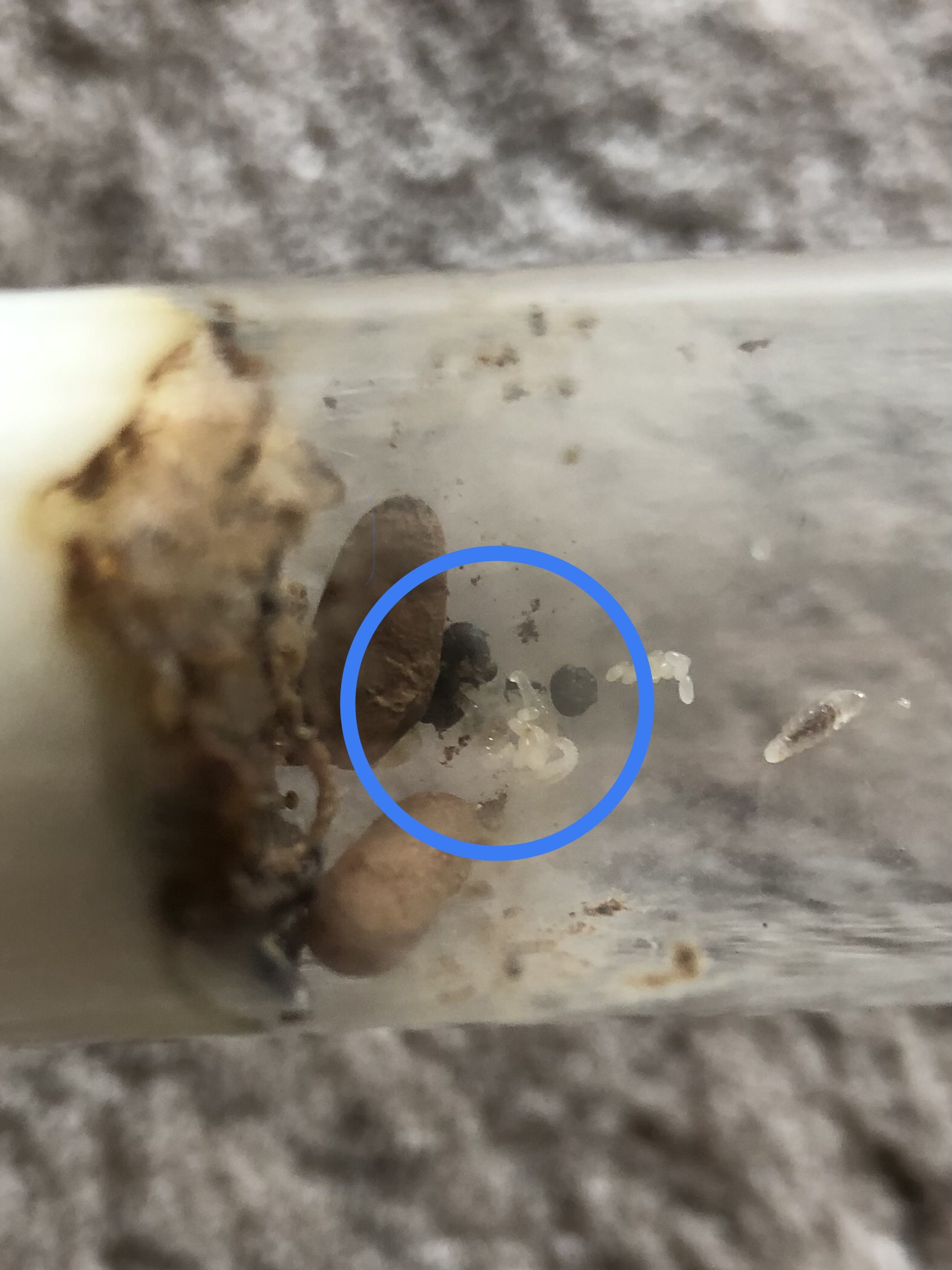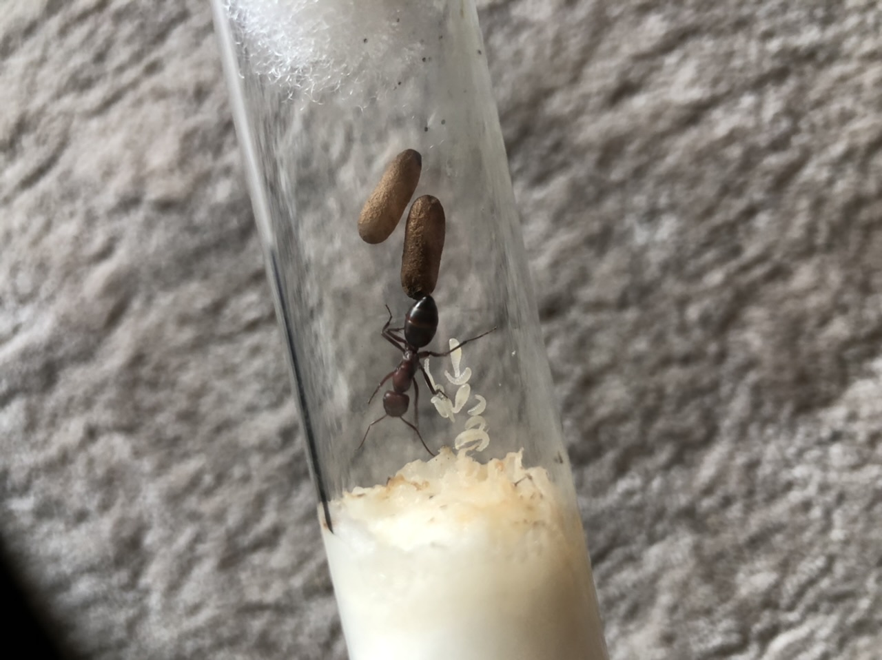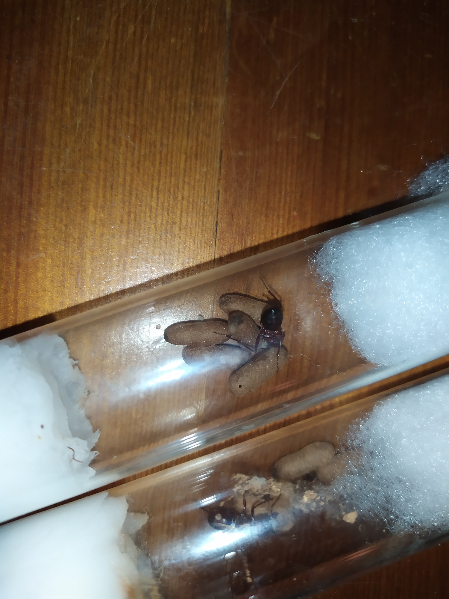 11. Juni 2022gegen 8:30 morgensZu unserer großen Freude entdeckten wir nun auch bei der zweiten Gyne einen größeren Eierhaufen (~10 Eier). Es fiel uns auch auf, dass die erste Gyne an einem Kokon zu beißen begann. Es scheinte auch ein Fühler rauszuschauen. Das ließ uns hoffen, bei unserer Rückkehr evtl. eine erste Arbeiterin zu entdecken.