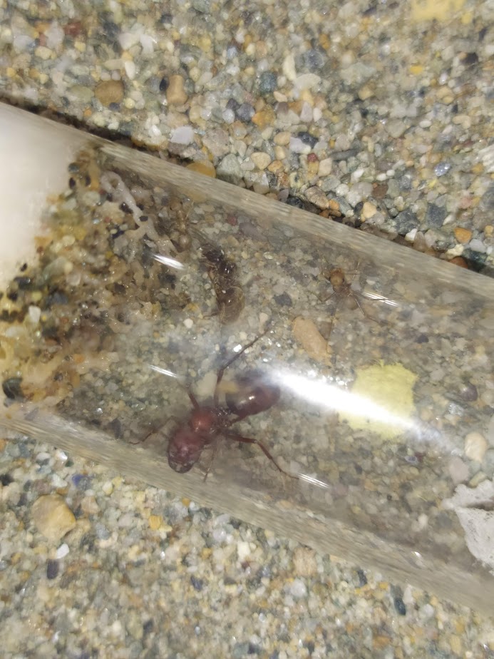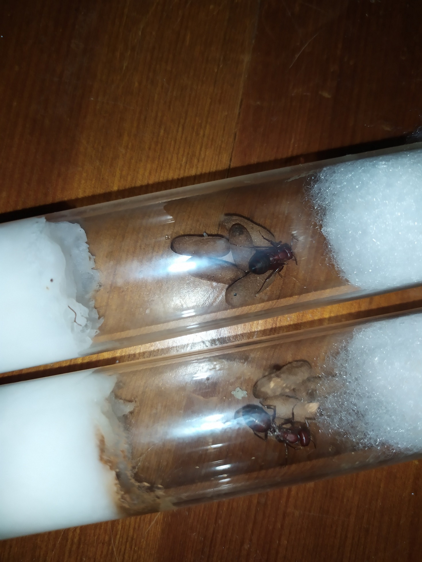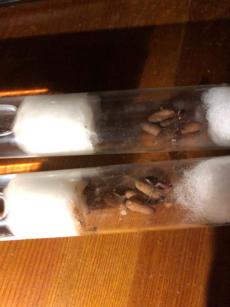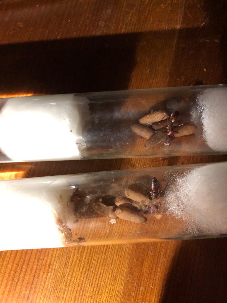 9. Juni 2022Nachdem ein User darauf hingewiesen hatte, dass die Gründung bei Cataglyphis spp. mitunter sehr heikel sein kann, haben wir uns entschlossen, die Gynen mit ein paar Puppen aus einem bestehenden Nest zu unterstützen. Wir wollten die Wahrscheinlichkeit für eine erfolgreiche Gründung, so gut wir das beeinflussen konnten, erhöhen. Ich kann gar nicht beschreiben, wie schlecht wir uns dabei gefühlt haben, im Bau der wunderschönen Tiere herumzuwühlen, doch letztendlich fanden wir neun Puppen, von denen wir 4 der einen und fünf der anderen unterjubelten. Die Größe der Puppen verunsichert mich bis jetzt, ich hoffe, dass es sich um Arbeiterinnen handelt und nicht um Geschlechtstiere, doch nachdem Majors sogar größer werden können als Gynen, bleibt wohl nur abzuwarten.