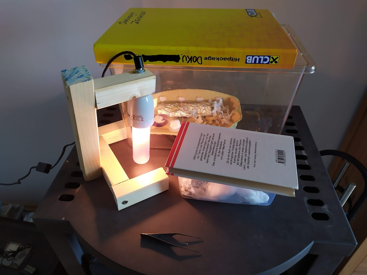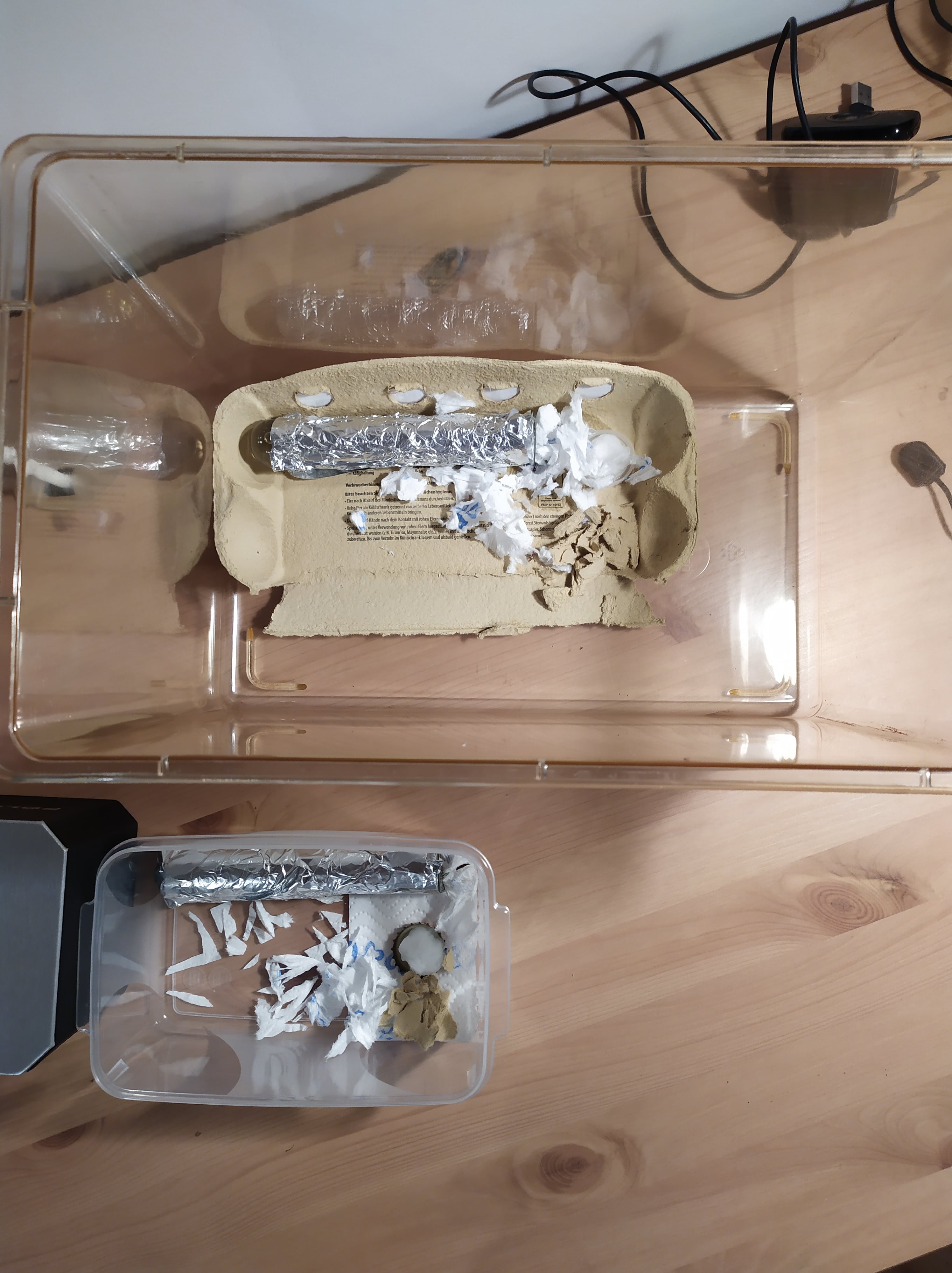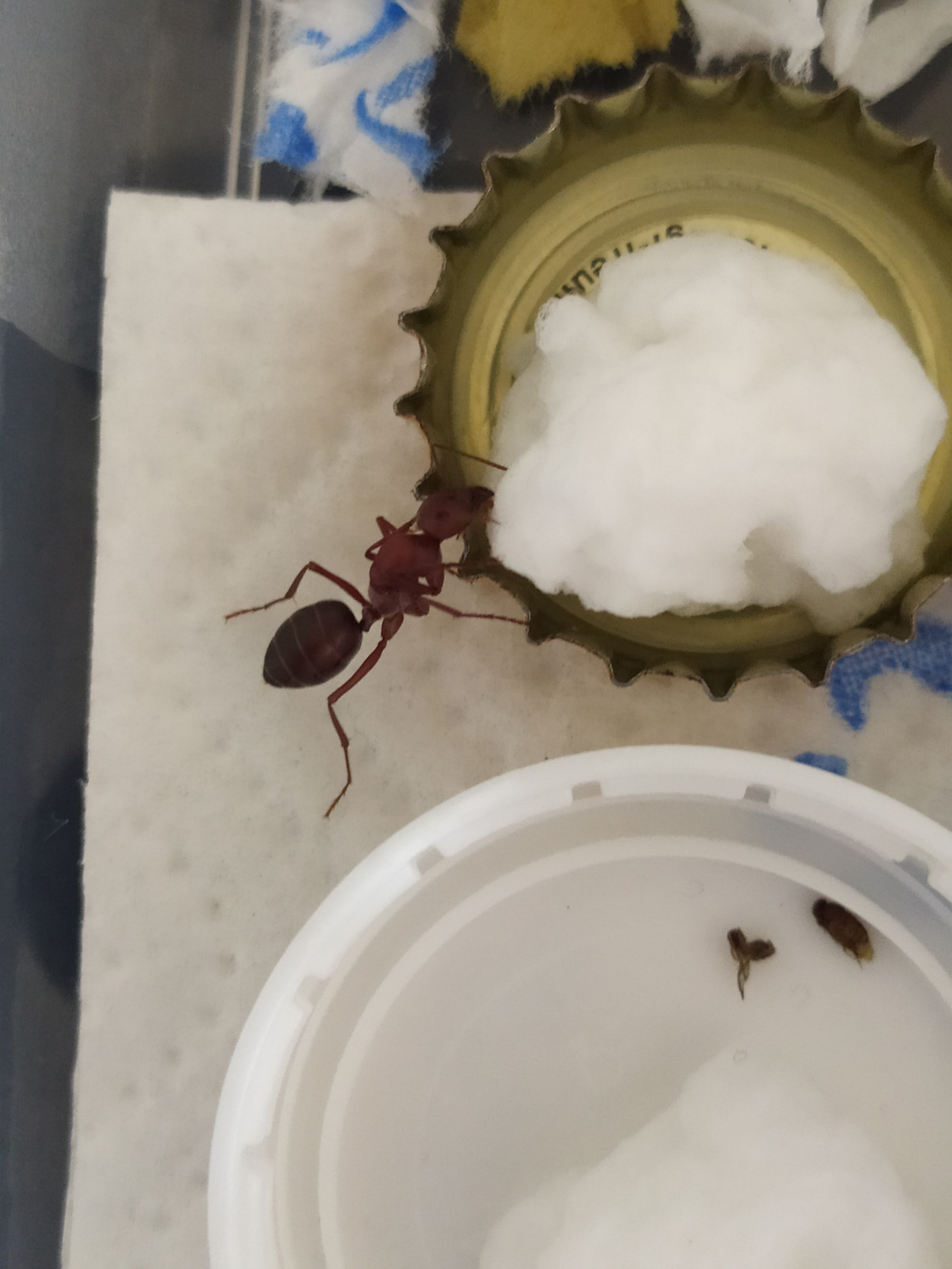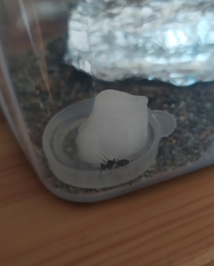 Nachdem wir nur Füllwatte zur Hand hatten, die das Wasser so gar nicht dicht hielt, präparierte ich die RGs erst in der Unterkunft. Dann sperrten wir die beiden in den Safe, einerseits da sie es dort ruhig hatten und andererseits da ich der Watte allein als Ausbruchsschutz nicht mehr vertraue, seitdem mir eine Camponotus ligniperdus-Gyne ausgebüchst ist.