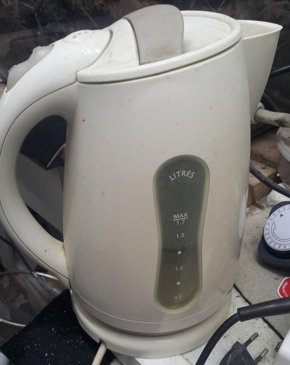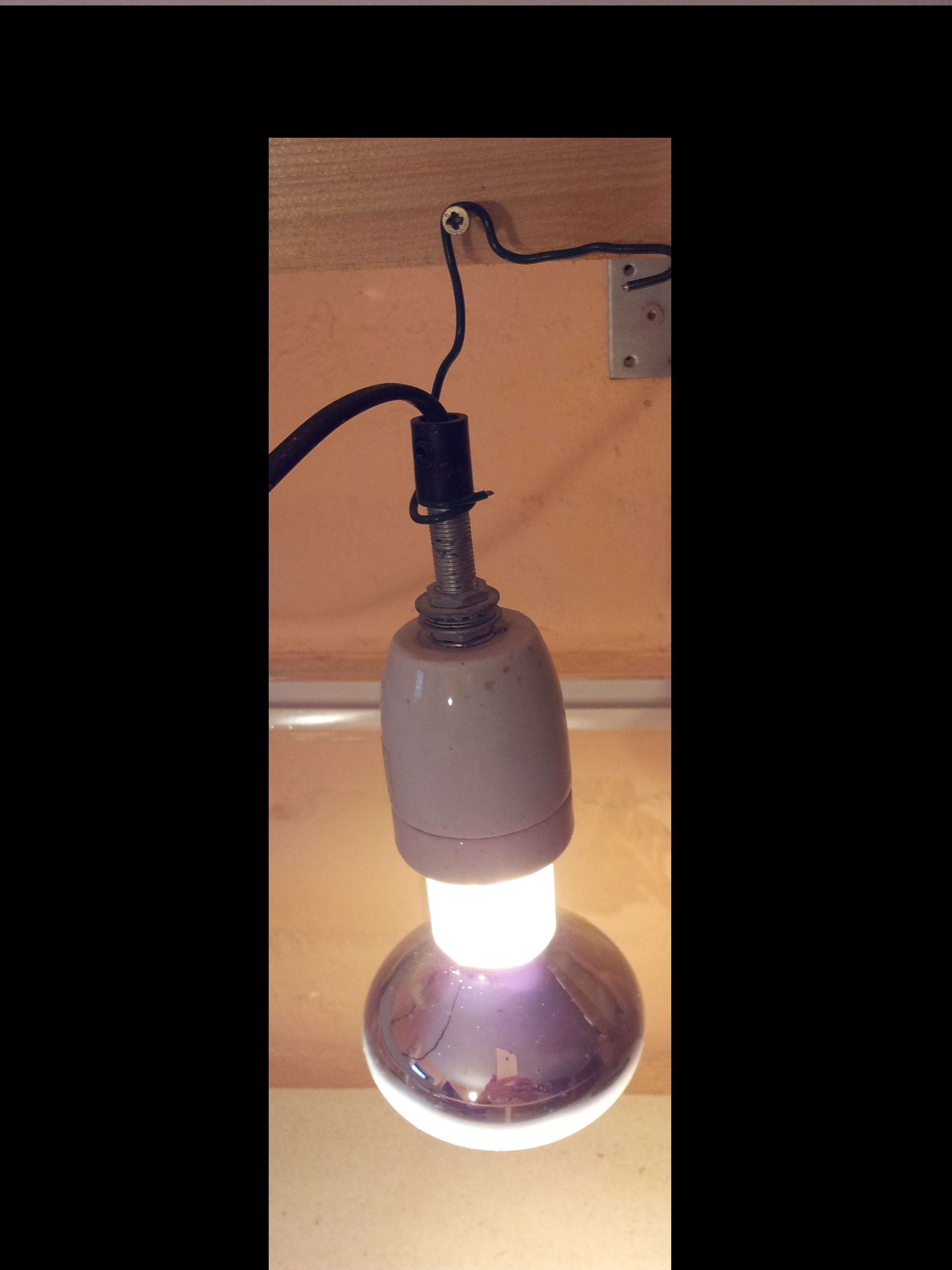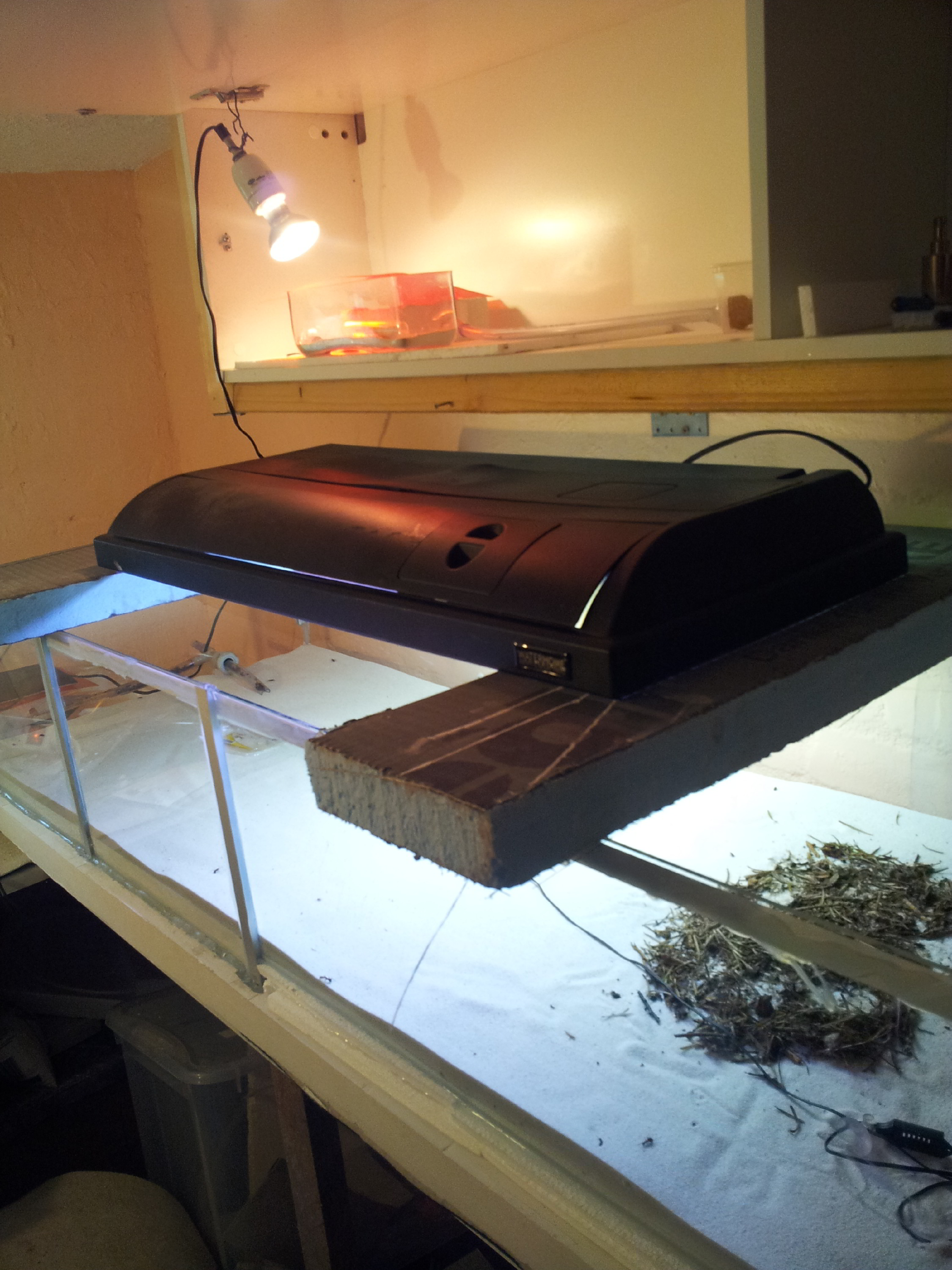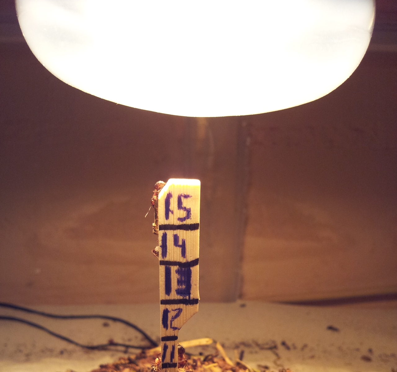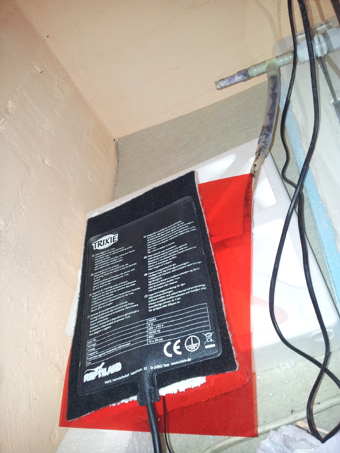 Zum Glück hab ich auch eine Wärmelampe. 35 Watt stark. Die beiden Leuchtstoffröhre kommen auf 36 Watt.