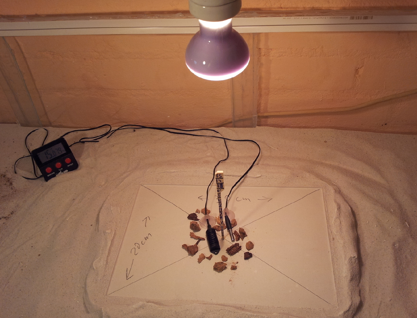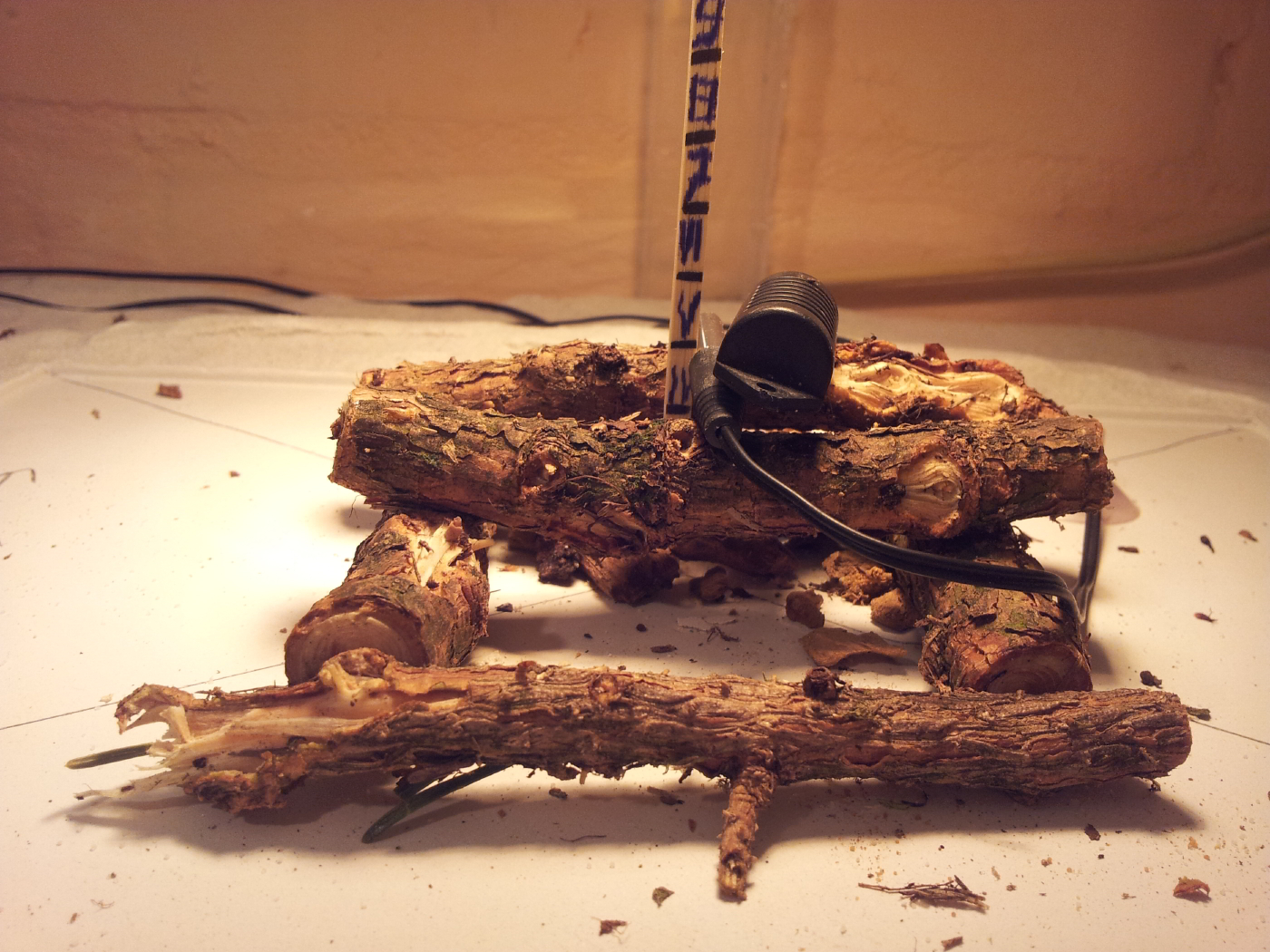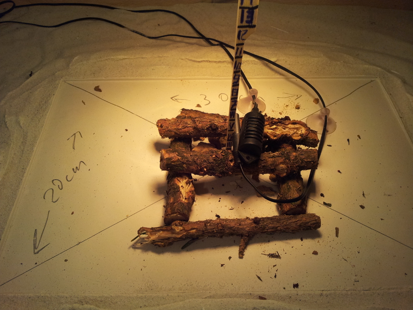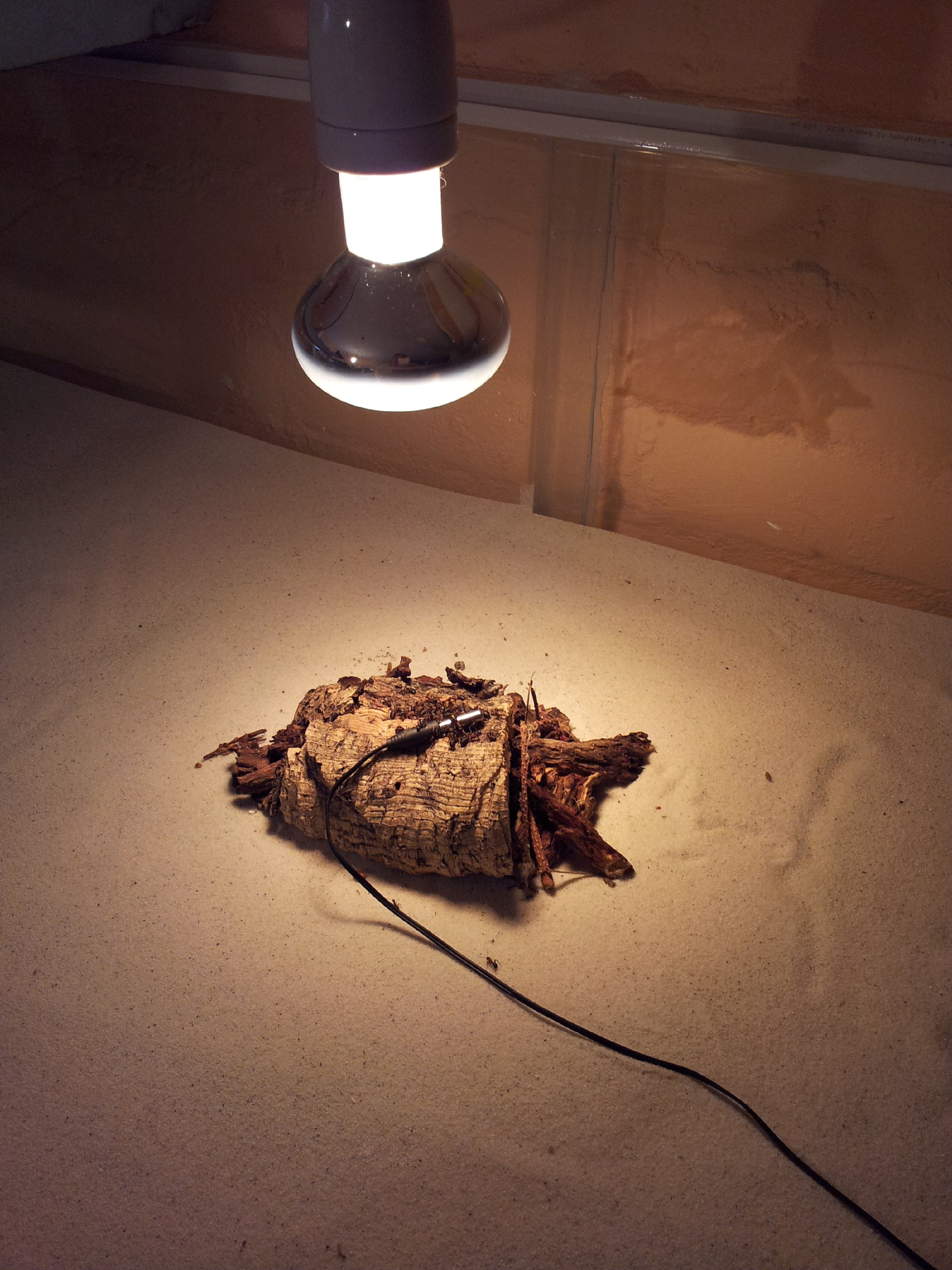 Damit die kleinen sich sonnen können ein Korkstück. Innen ist ein großer Hohlraum. Darüber eine 35 Watt Wärmebirne. Verzeiht die Größe des Pigs. Nächstes mal skaliere ich es.