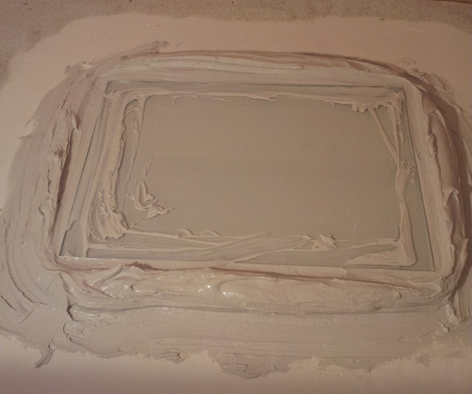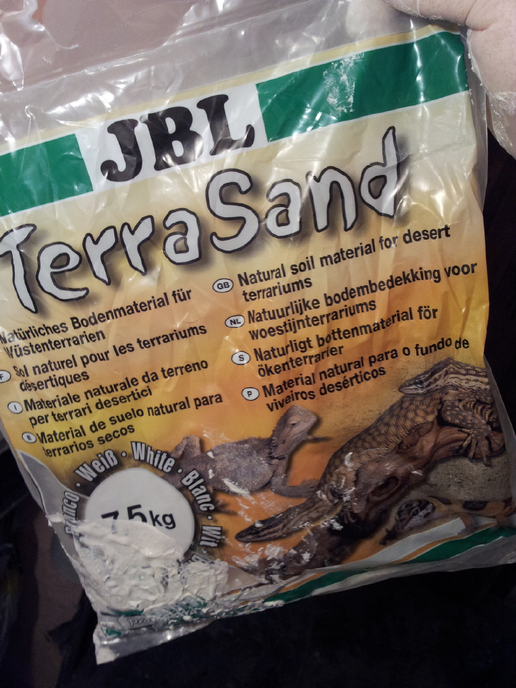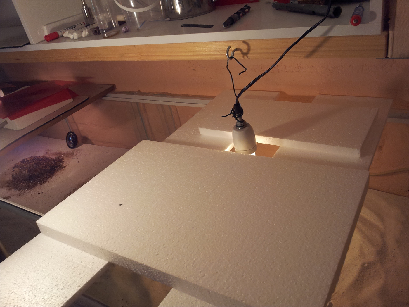 Auf das Styropor kommt nochmal Spachtelmasse.Auf die Spachtelmasse kommt dann weißer Sand.Den hab ich vorsichtshalber durch den Backofen geschickt.