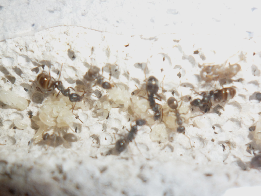 2) Meine Kolonie umfasst zum Gegenwärtigen Zeitpunkt ~40 :aa: und 5 :kk: , wobei die :aa: klein-mittelgroß sind und keine sehr großen :aa: darunter sind wie man sie von etablierten Völkern in der Natur kennt. Vermutlich bedingt durch die Königinnen Anzahl, die momentan immerhin 1/8 der Kolonie darstellt ist enorm viel Brut vorhanden und es hat den Anschein, dass die geringe Anzahl der (kleinen) "Brutpflegerinnen" momentan der limitierende Faktor einer Expansion ist. Daher kann ich mir vorstellen, dass jetzt erstmal "Brutpflegerinnen" im großen Maßstab aufgezogen werden.