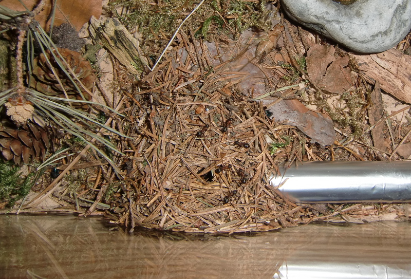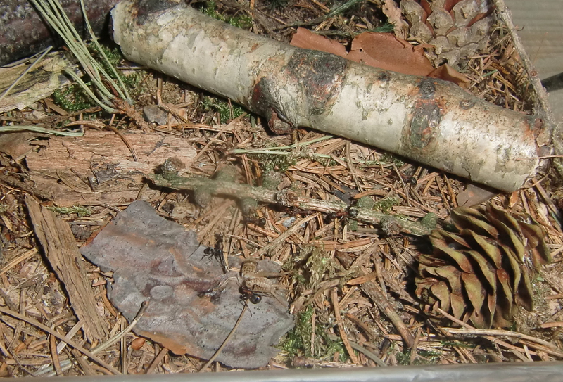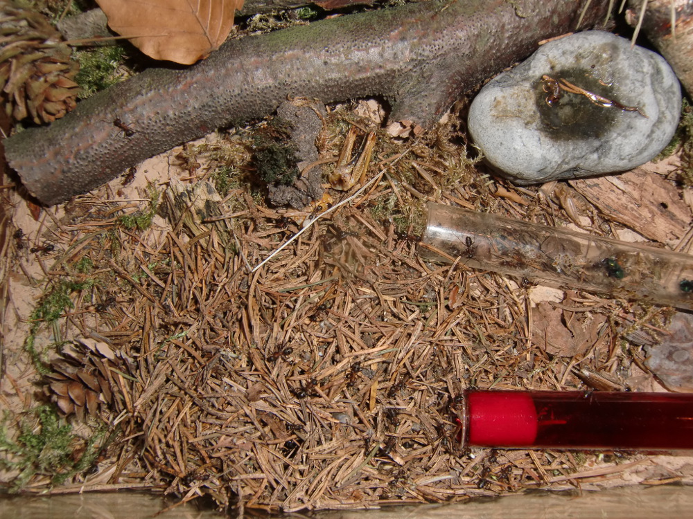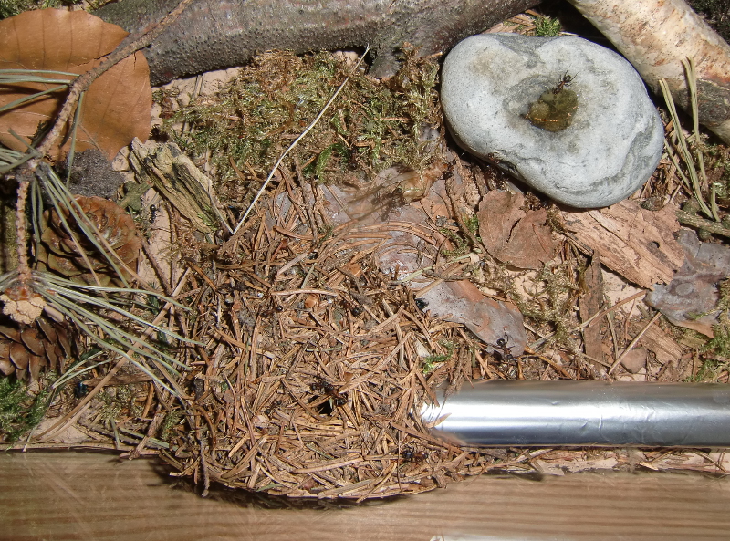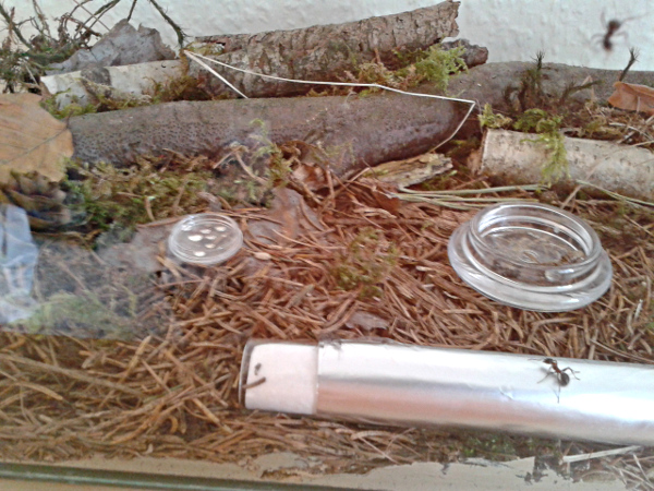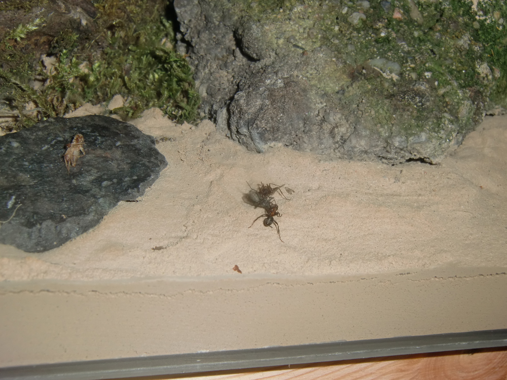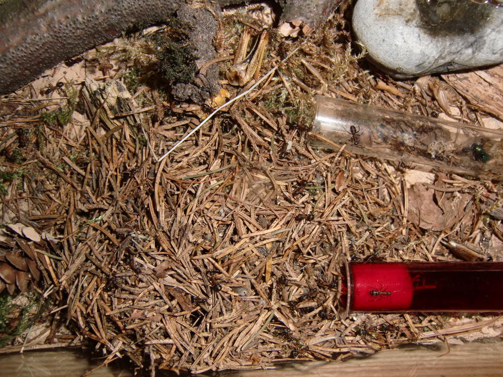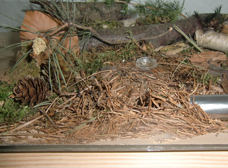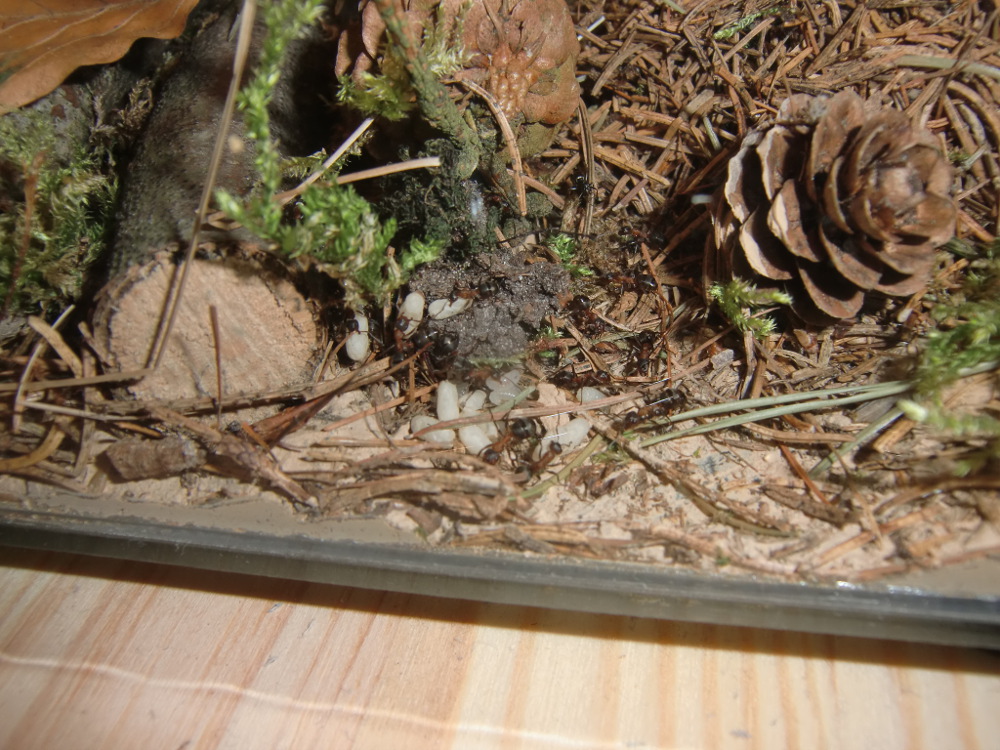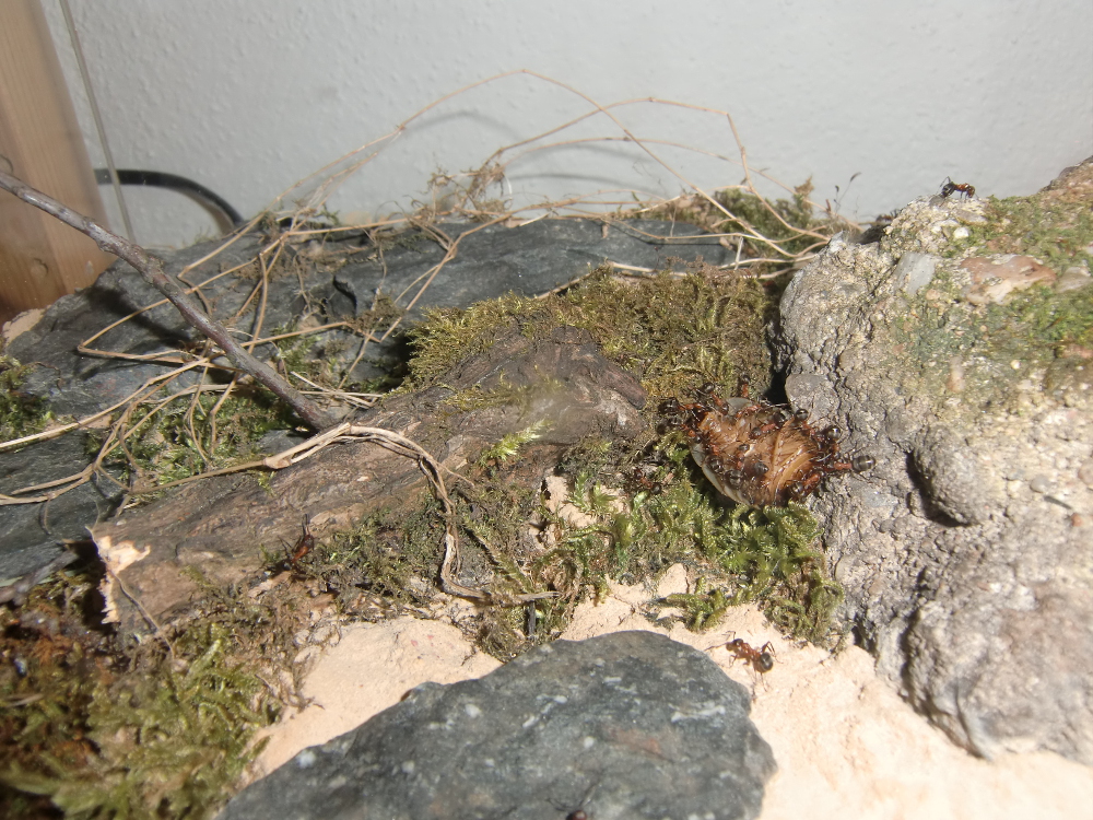 Es wurde Zeit für drastischere Maßnahmen: Stück für Stück entfernte ich alle liebevoll eingebrachte Dekoration, unter einem großen Rindenstück saß die Kolonie, die jetzt natürlich in Panik verfiel. Bis auf einige Moos und Fichtennadelreste war das Becken jetzt leer, sodass sie jetzt doch zurück in ihr Reagenzglas zogen.