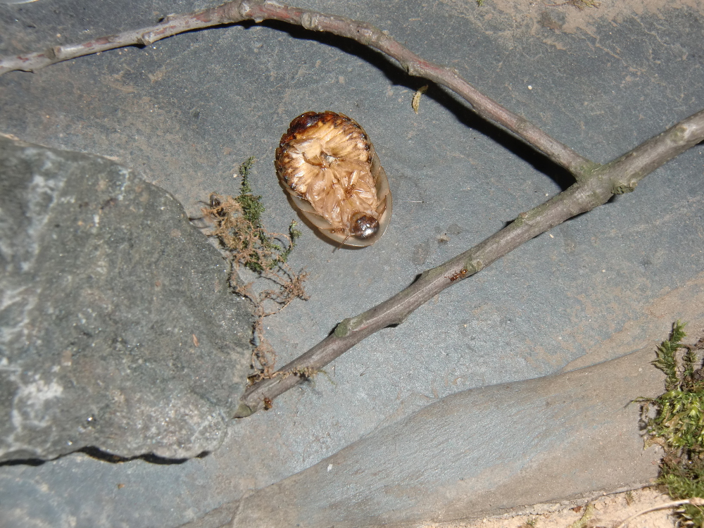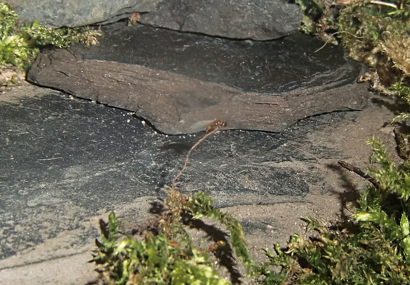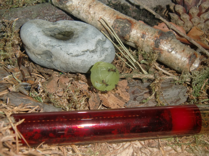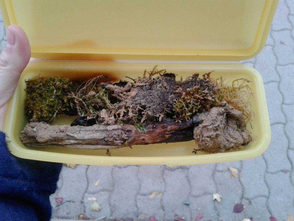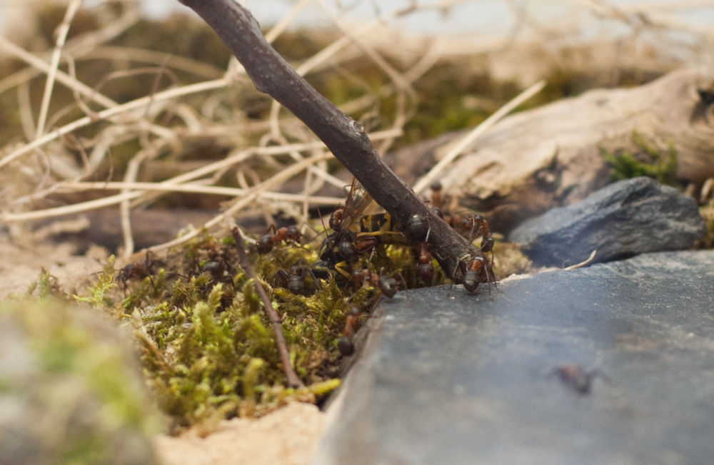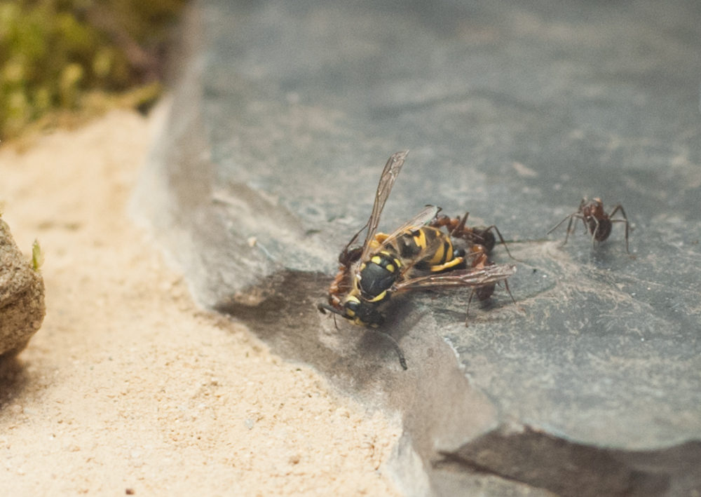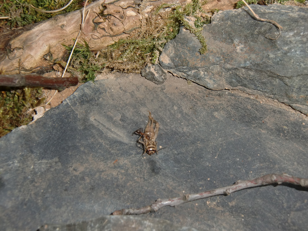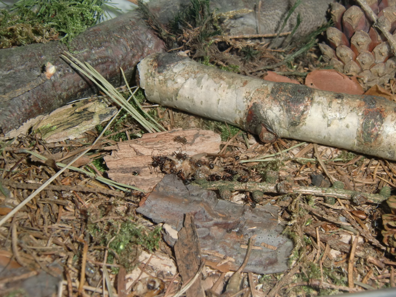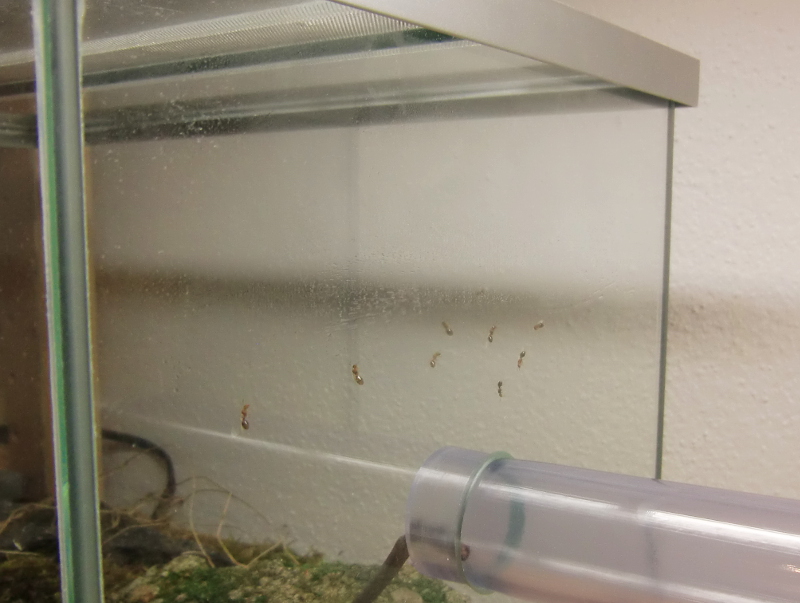 Es wurde Zeit für drastischere Maßnahmen: Stück für Stück entfernte ich alle liebevoll eingebrachte Dekoration, unter einem großen Rindenstück saß die Kolonie, die jetzt natürlich in Panik verfiel. Bis auf einige Moos und Fichtennadelreste war das Becken jetzt leer, sodass sie jetzt doch zurück in ihr Reagenzglas zogen.