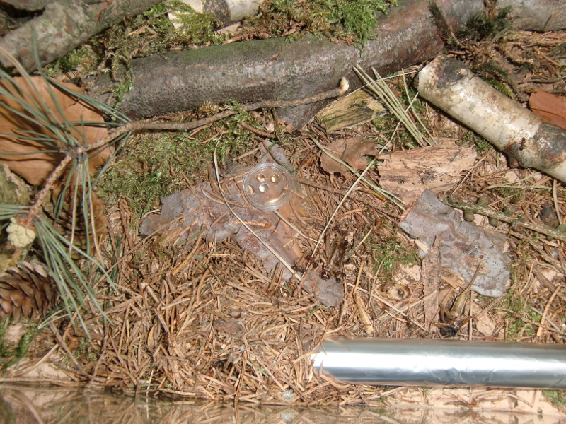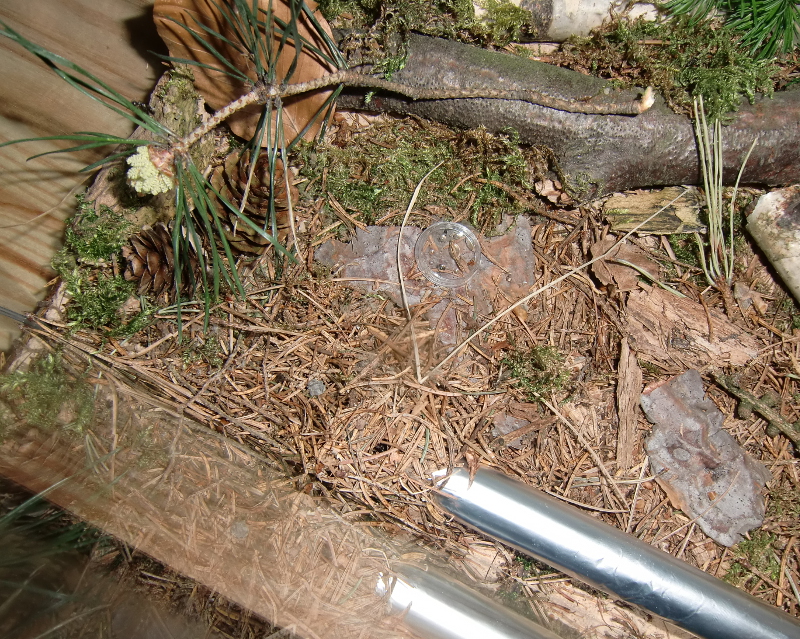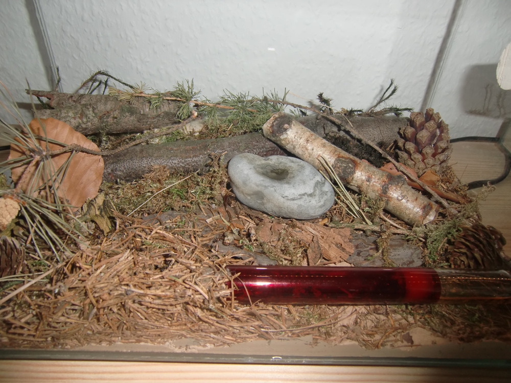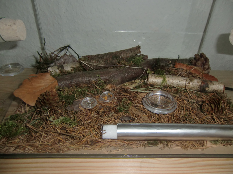 Die Einrichtung besteht aus einer dünnen Sand-Lehmschicht in die feucht einige Äste, Rinden- und Moosstückchen gedrückt wurden. Anschließend wurde der Boden dick mit Fichtennadeln ausgestreut.