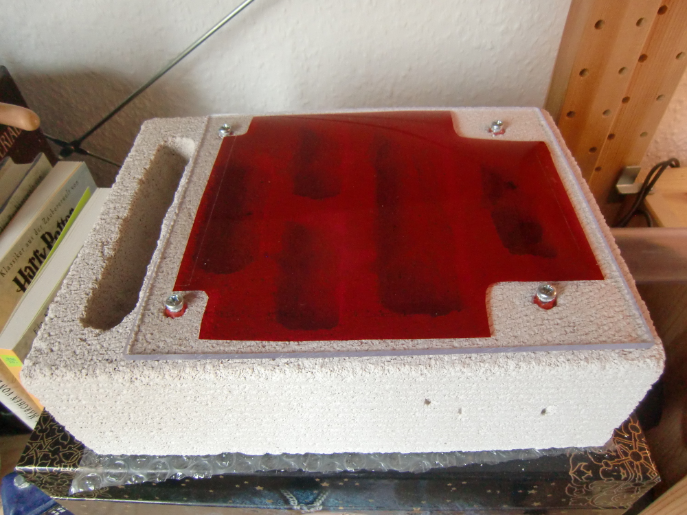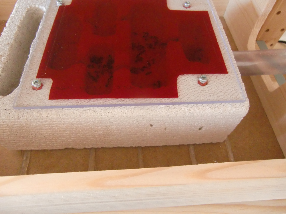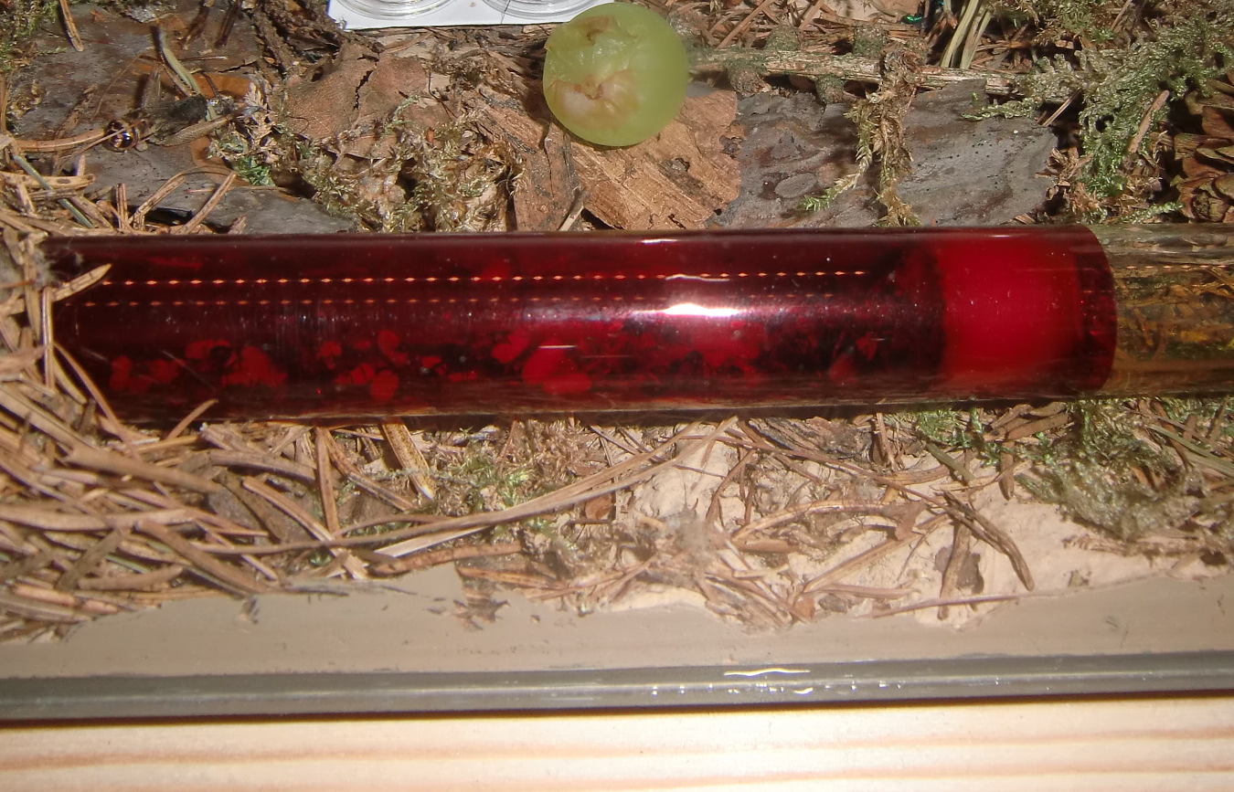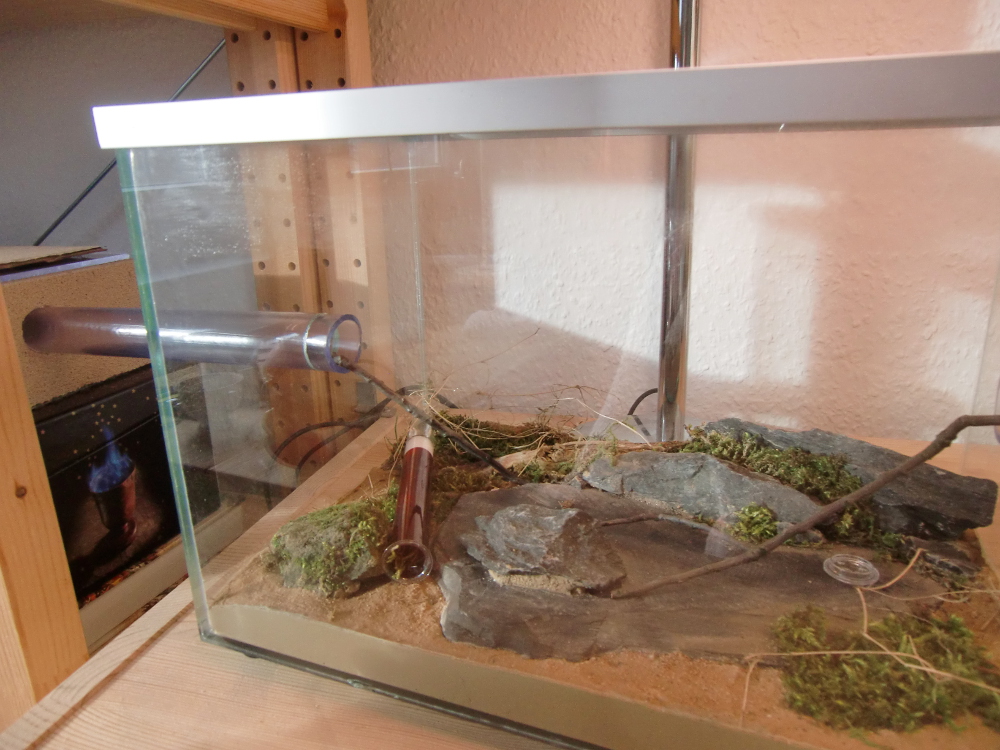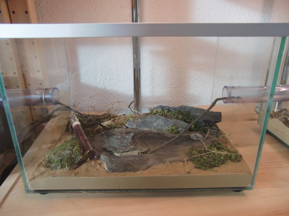 Vorerst einige Eckdaten zur Haltung: Das Formikarium besteht aus einem handelsüblichen 30x20 Becken, selbstverständlich mit Bohrungen für baldige Erweiterungen. Es wird mittags und nachmittags teilweise beheizt durch eine Heizmatte (12,7x8,5 cm; 4W). Als Nest wird erst einmal weiter das Reagenzglas benutzt.